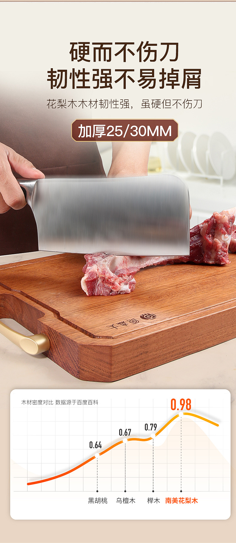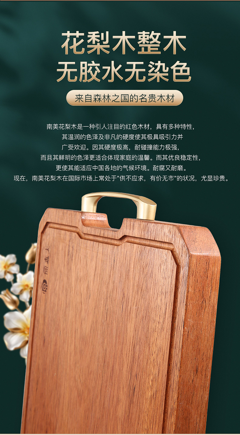1.南美花梨木是一种引人注目的红色木材,具有多种特性,其温润的色泽及非凡的硬度使其极具吸引力并广受欢迎。因其硬度极高,耐碰撞能力极强,而且其鲜明的色泽更适合体现家庭的温馨。而其优良稳定性,更使其能适应中国各地的气候环境。耐腐又耐磨。现在,南美花梨木在国际市场上常处于"供不应求,有价无市"的状况,尤显珍贵。 菜板采用花梨木整木制作,无拼接无胶水。木料经过专业烘干及杀菌处理,可正反双面使用,底部装有防潮垫,防止积水。经检测认证,花梨木具抗菌防霉性能也很强。