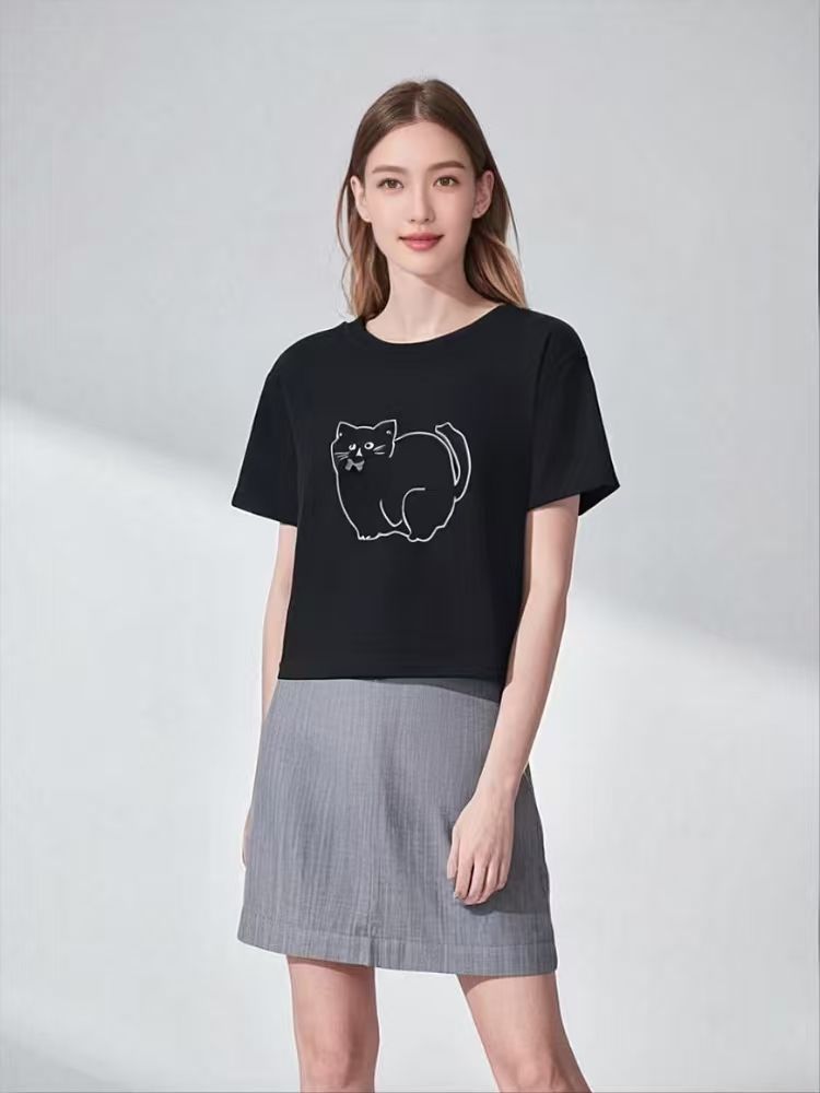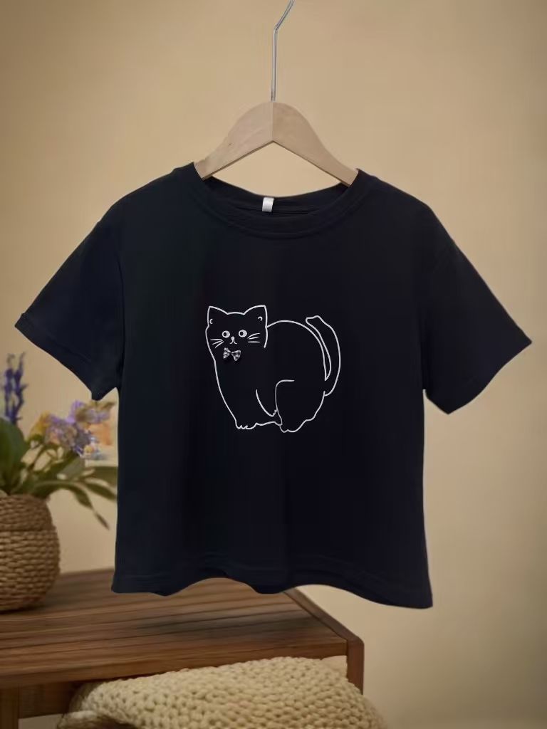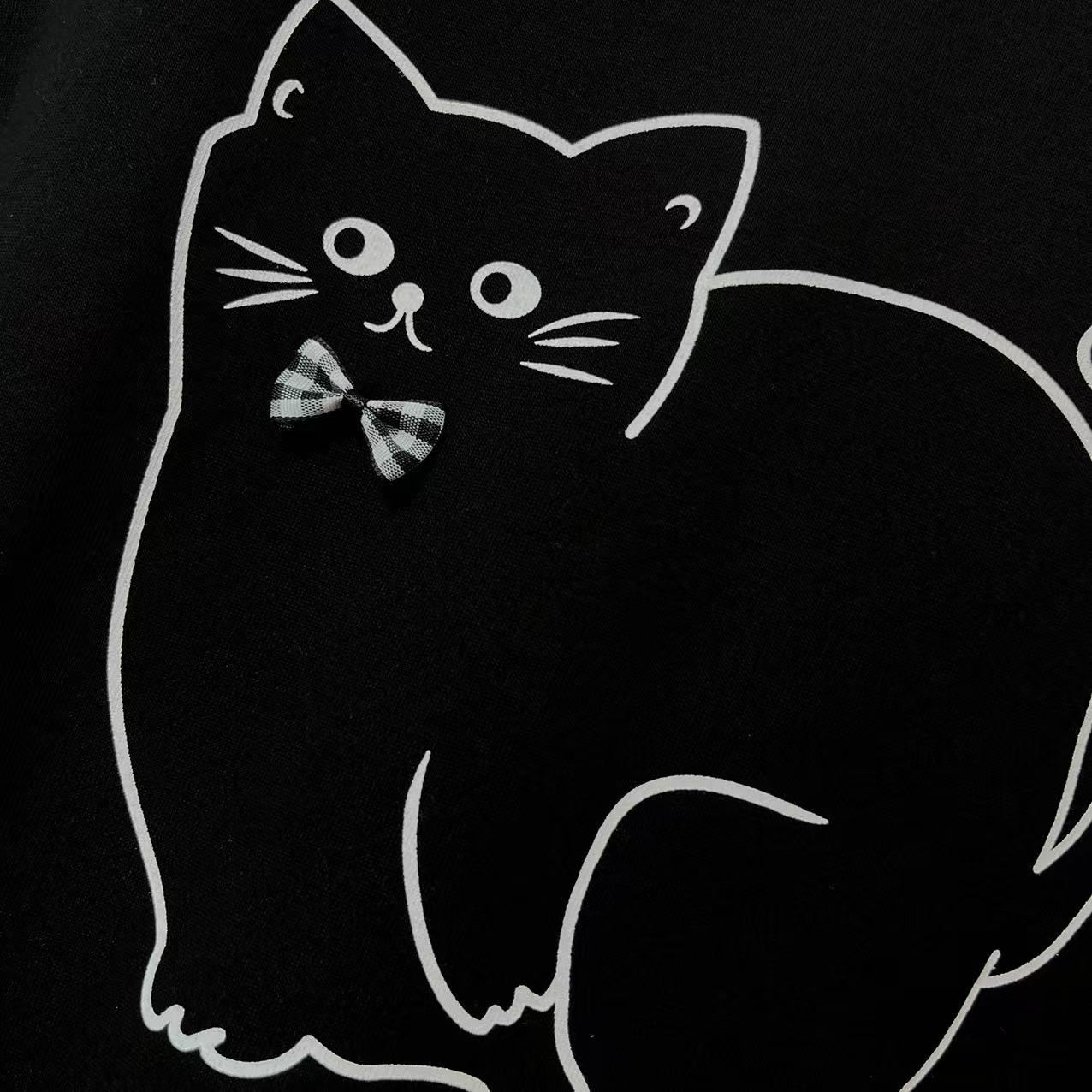 【新品特卖】8310短款宽松蝴蝶结可爱猫短袖T恤-喜出