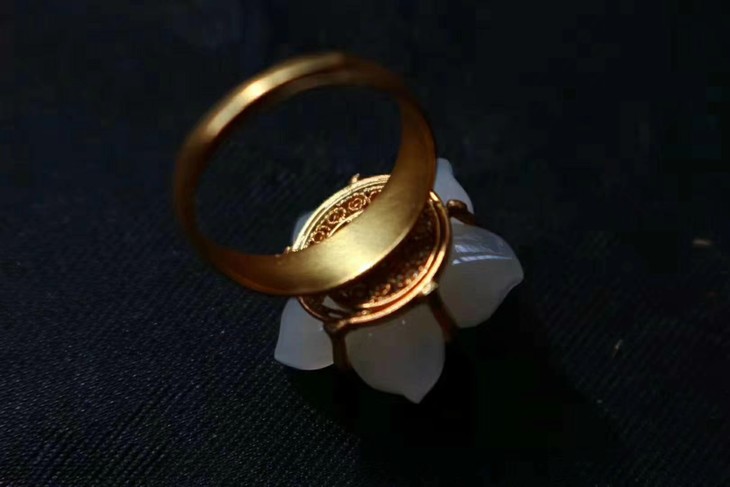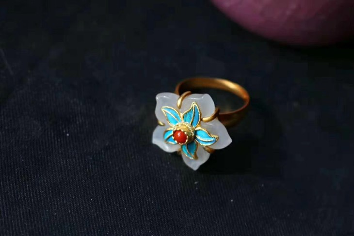 纯银鎏金点翠和田玉(白玉)桃花戒指