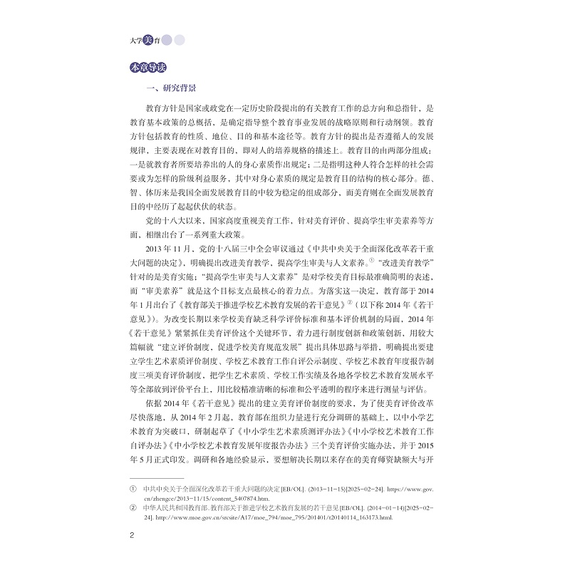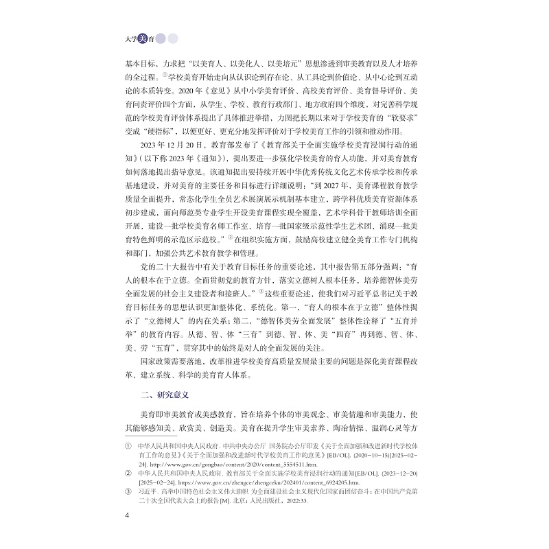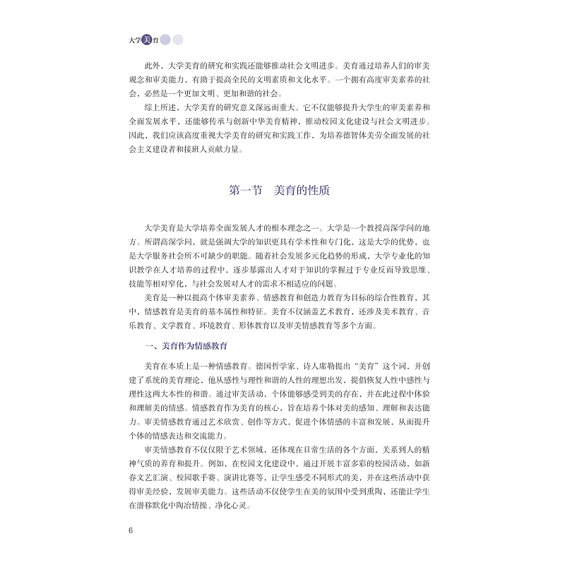 大学美育是以美学知识体系为依托,以自然美、社会美、艺术美、科技美等审美形态为载体,提升大学生审美素养的过程。《大学美育》主要从美育的性质、特征、目标和功能等方面进行阐释,依次论述自然美育、社会美育、艺术美育和科技美育的性质、形态、特征及其价值。尤其注重以艺术美育为主体,全书以美术、建筑、摄影、音乐、舞蹈、书法、诗歌、小说、散文、影视、戏曲、戏剧等12种艺术门类的审美教育为基本内容,通过类型多样的古今中外审美案例鉴赏,引领学生树立正确的审美观念、陶冶高尚的道德情操、塑造美好心灵。同时,遵循美育特点,弘扬中华美育精神,以美育人、以美化人、以美培元,培养德智体美劳全面发展的时代新人。最后,本书就大学生与美育问题作了概述,详细论述了大学生美育的目标、特征、方式与途径。