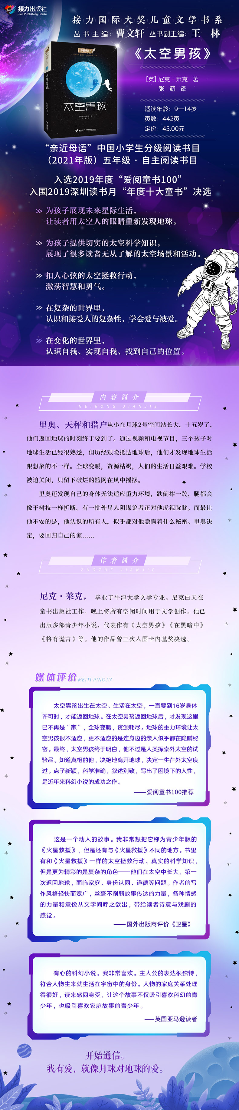 ▲为孩子展现未来星际生活,让读者用太空人的眼睛重新发现地球。?▲为孩子提供切实的太空科学知识,展现了很多读者无从了解的太空场景和活动。?▲扣人心弦的太空拯救行动,激荡智慧和勇气。?▲在复杂的世界里,认识和接受人的复杂性,学会爱与被爱。?▲在变化的世界里,认识自我、实现自我、找到自己的位置。