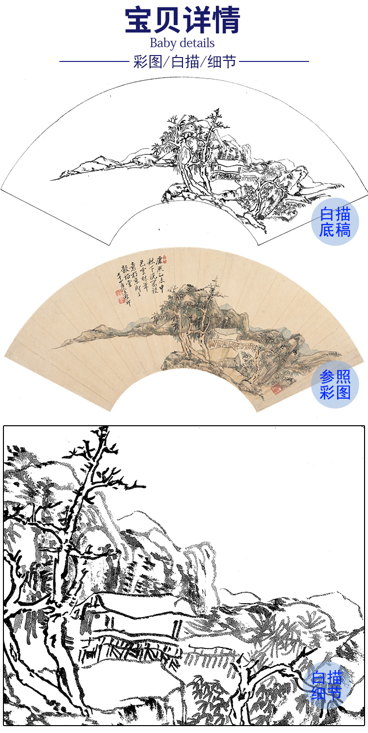 工笔画白描底稿 扇面小品 清 王原祁 山水图 SR42