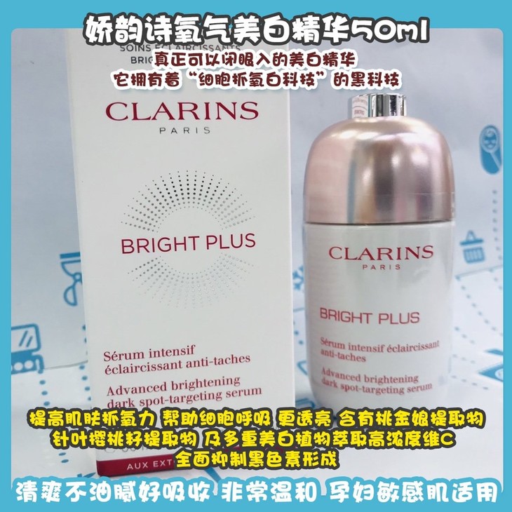 娇韵诗氧气美白精华#30ml/#50ml👍真正可以闭眼入的美白精华🌟。它拥有着“细胞抓氧白科技”的黑科技😎,提高肌肤抓氧力,帮助细胞呼吸,更透亮。含有桃金娘提取物➕针叶樱桃籽提取物,及多重美白植物萃取高浓度维C,全面抑制黑色素形成🙅,加速代谢,去除暗沉物质,展露出健康皮肤的细腻白皙✨。白胖白胖的包装太太可爱了,质地也是奶里奶气的😝~水润透薄,清爽不油腻好吸收,非常温和,孕妇敏感肌适用。