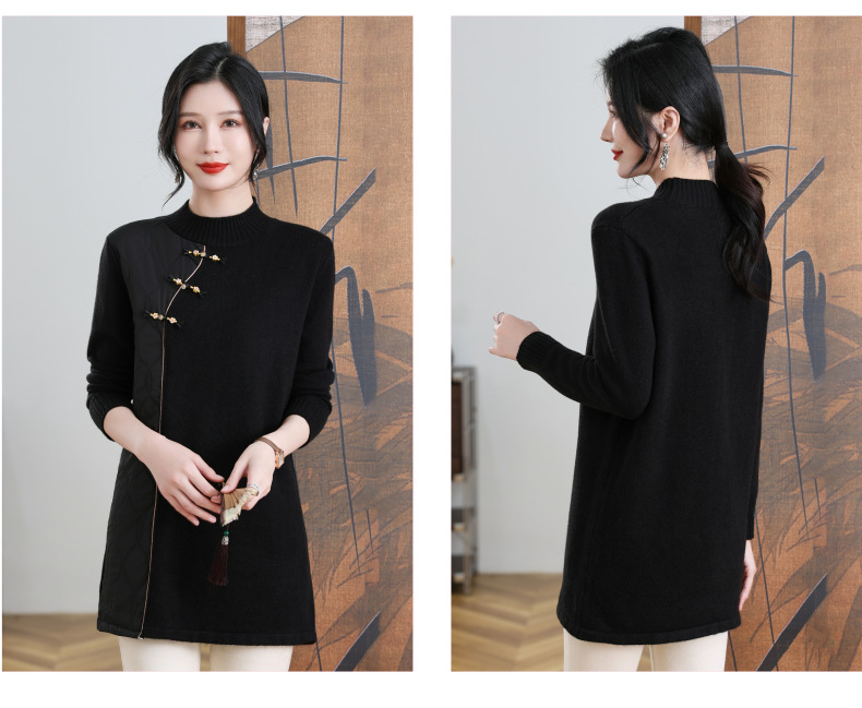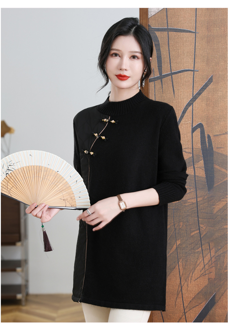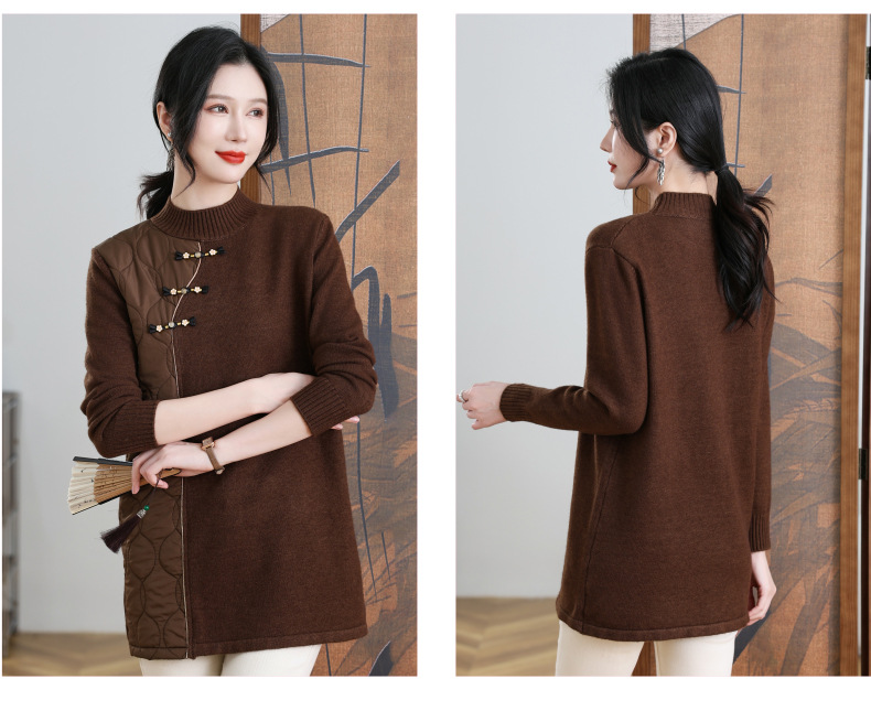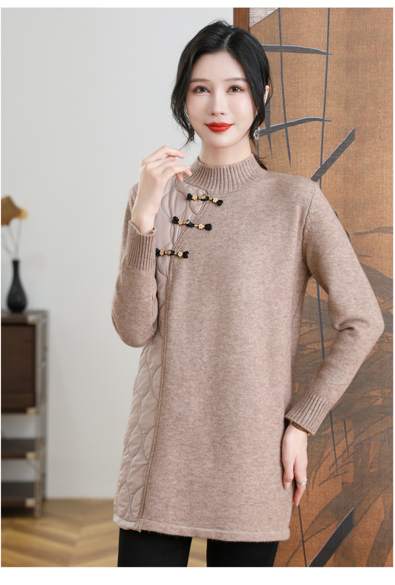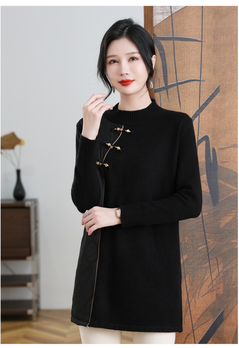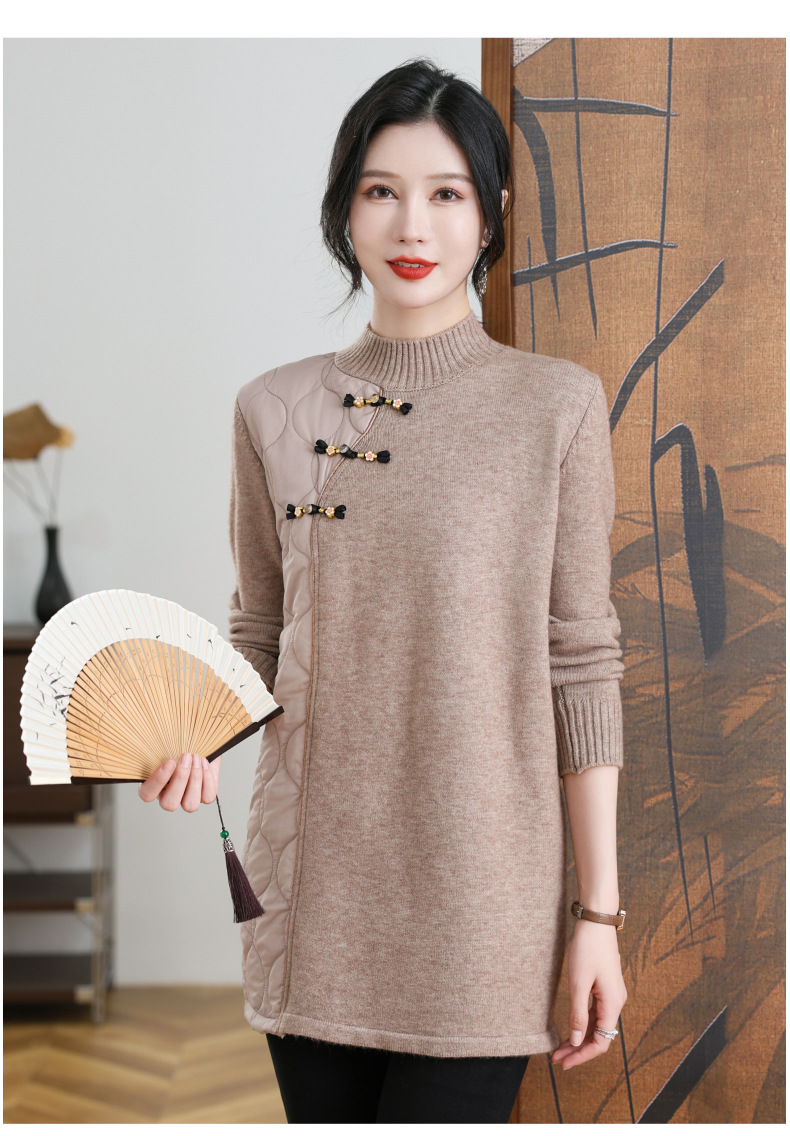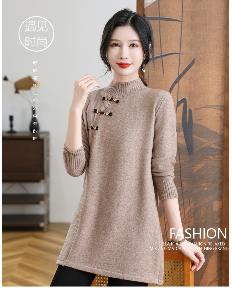 CC-101-3333冬季女装厚棉服拼接针织衫裙子中长款春秋半高领打底衫套头毛衣女