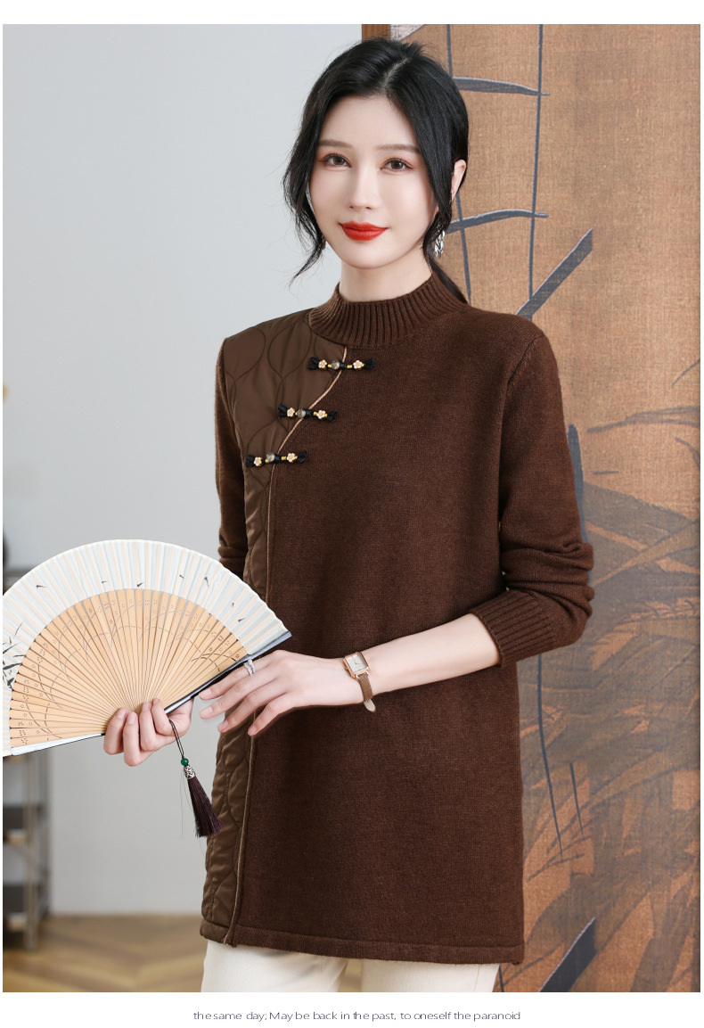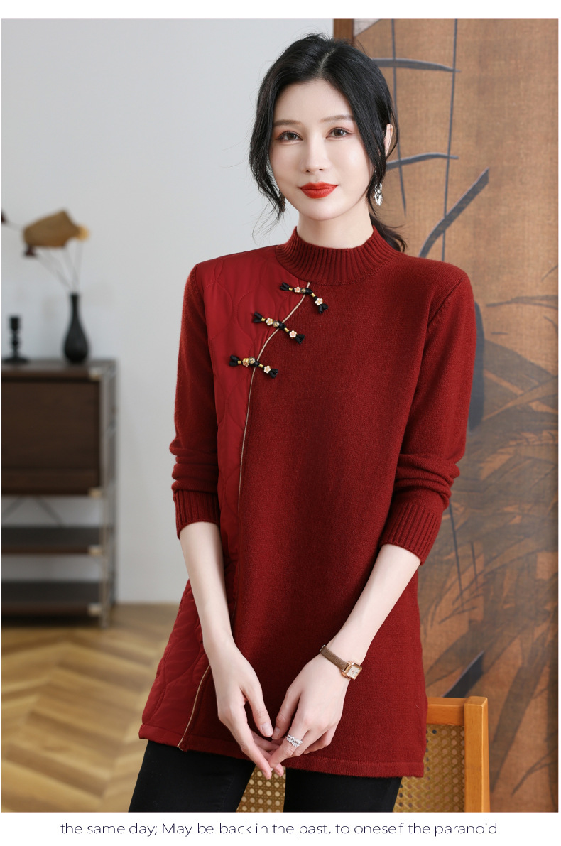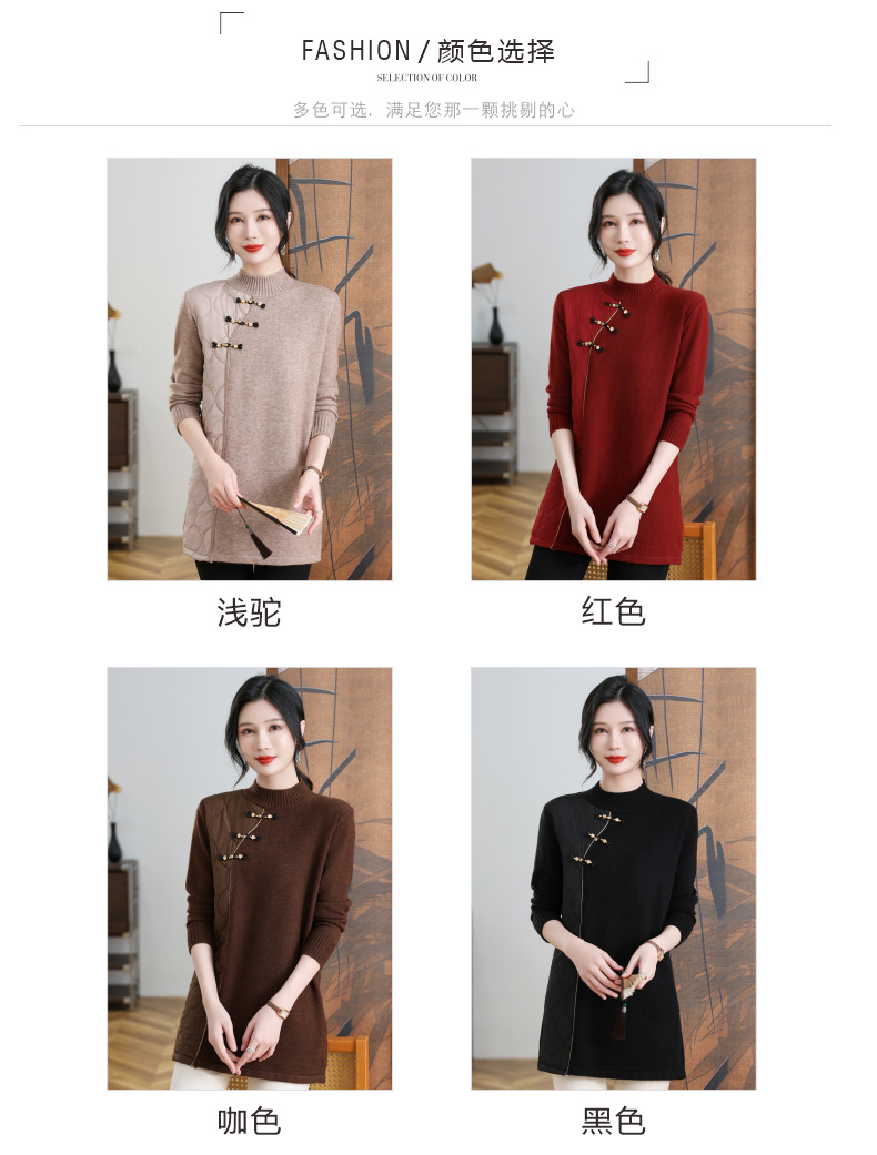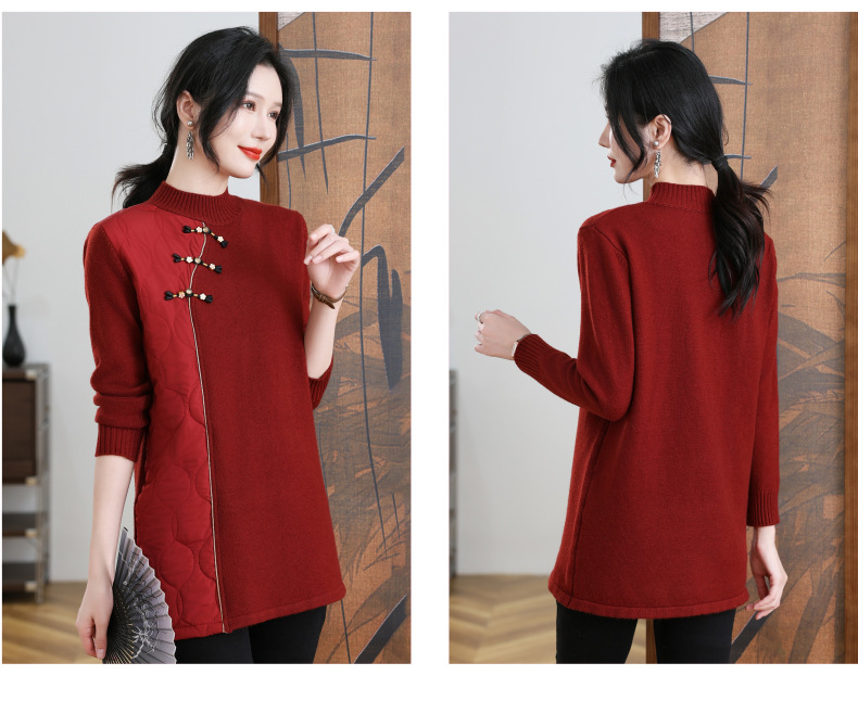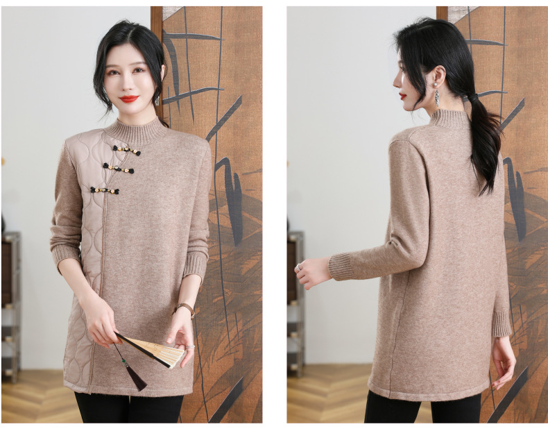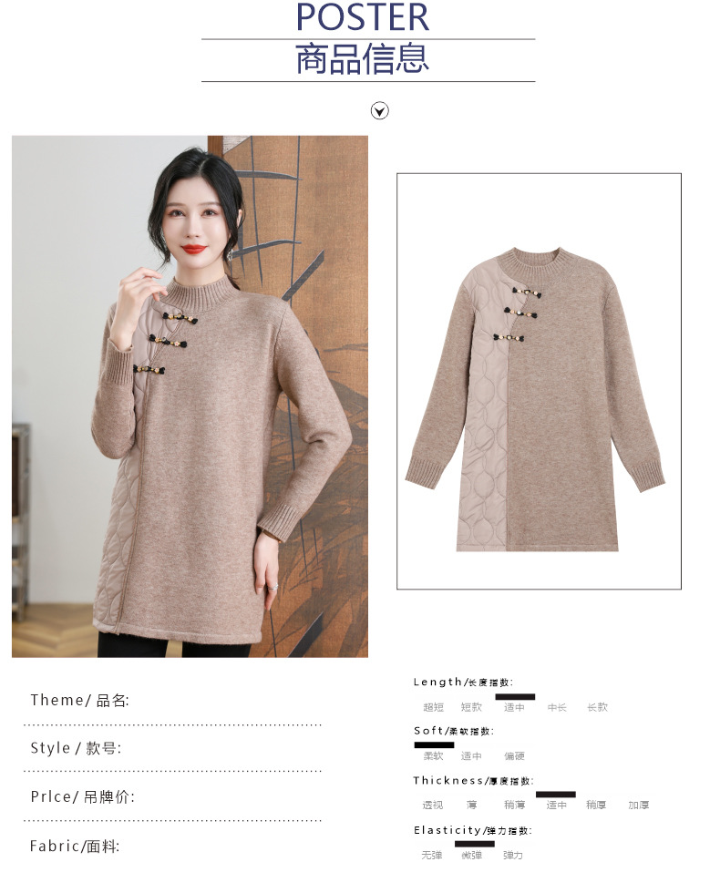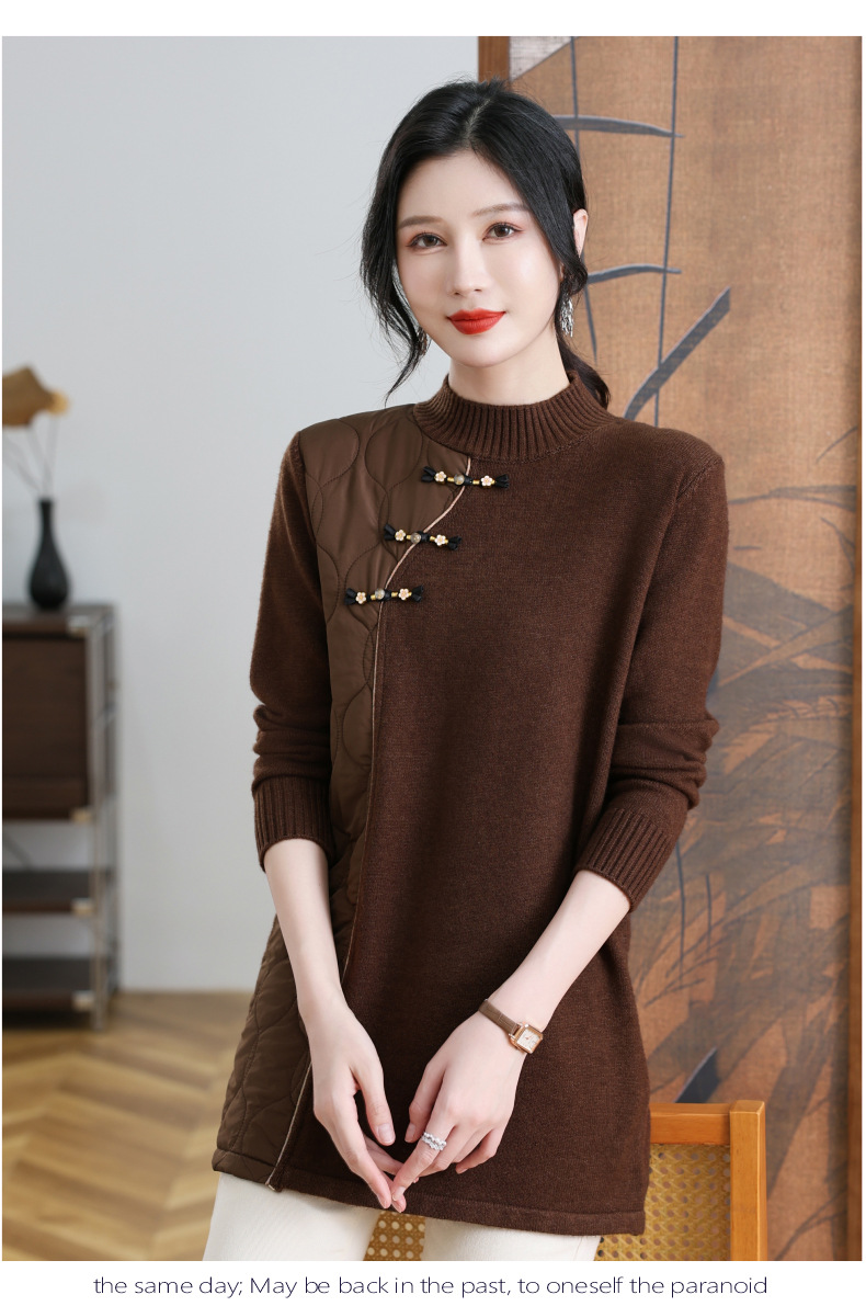 CC-101-3333冬季女装厚棉服拼接针织衫裙子中长款春秋半高领打底衫套头毛衣女