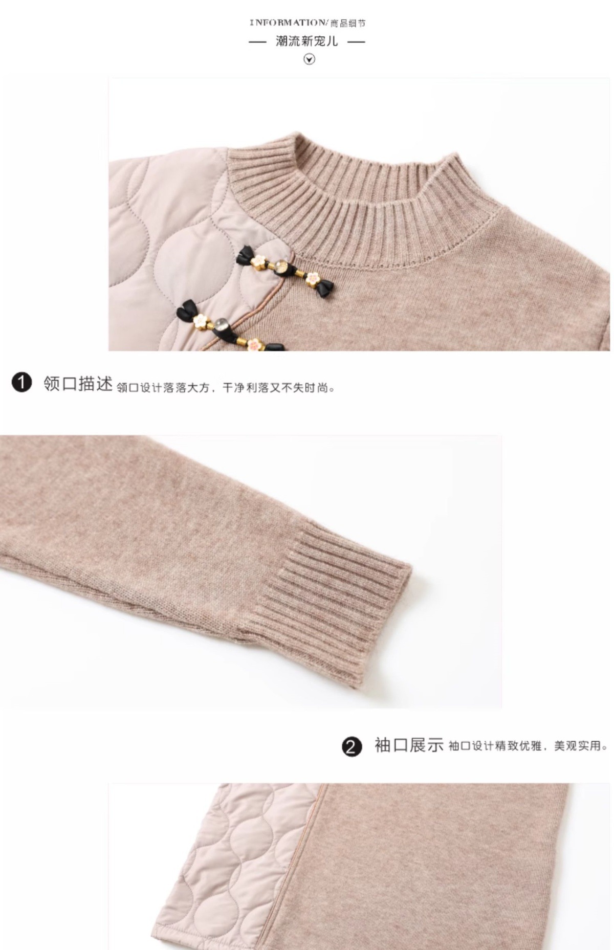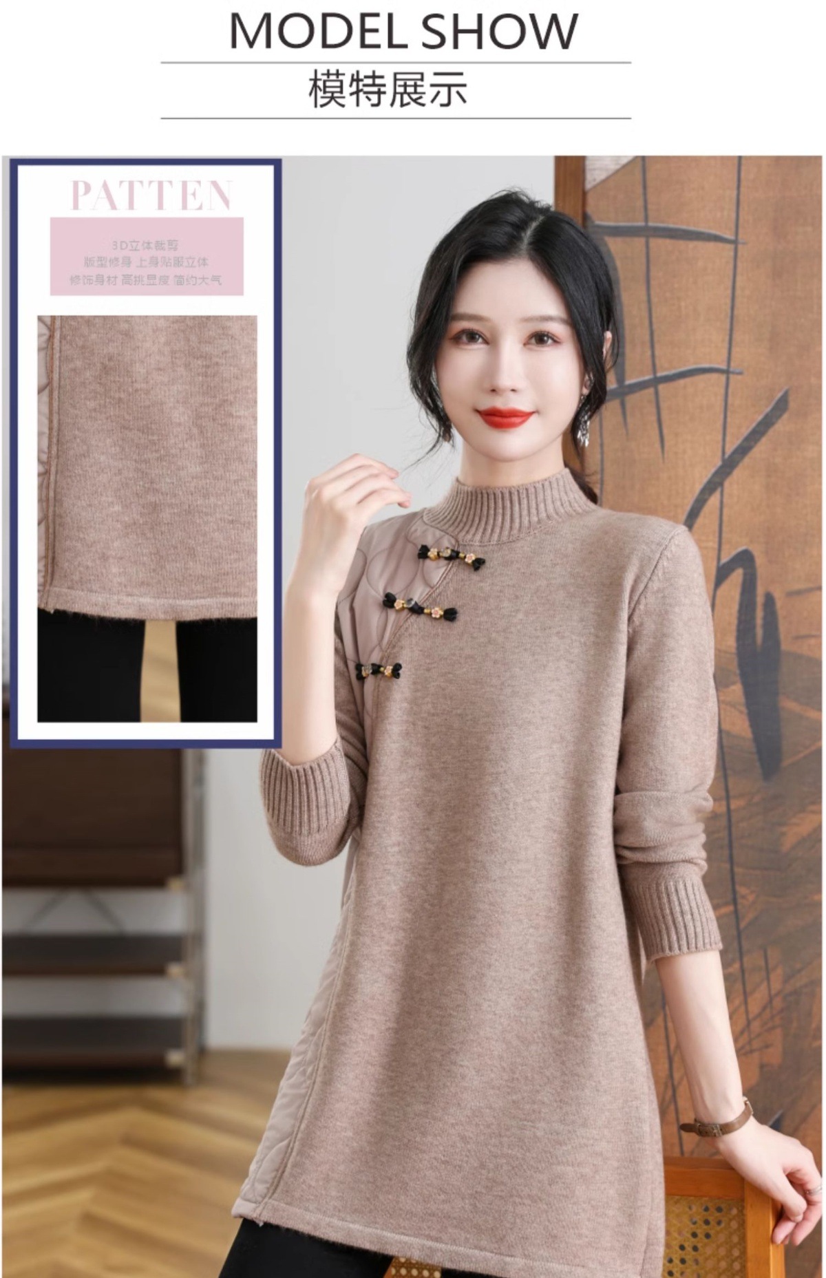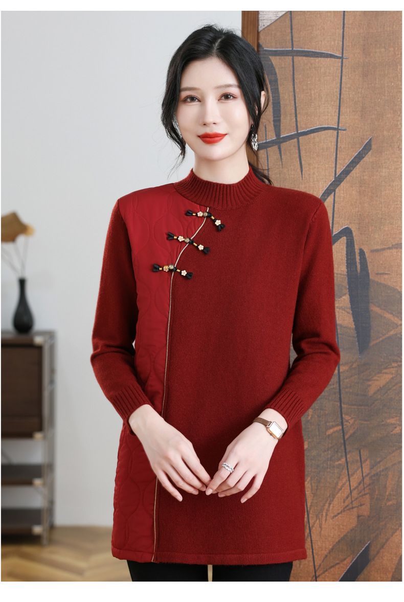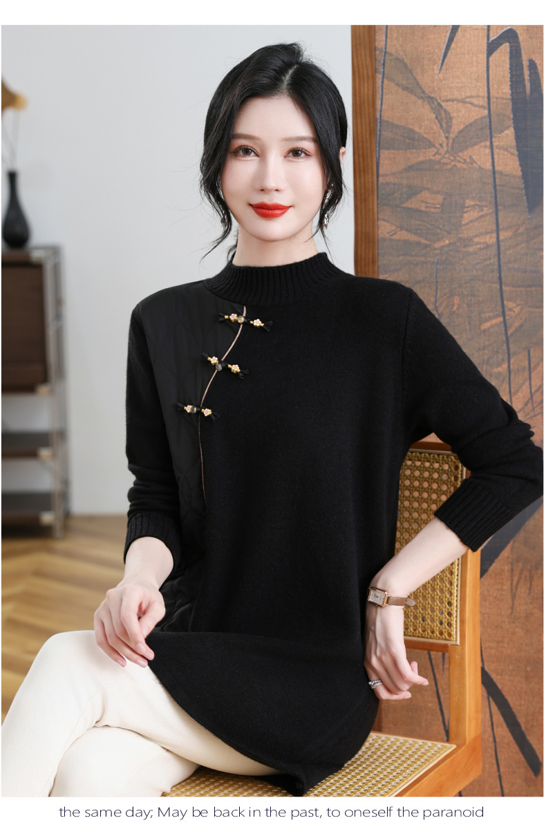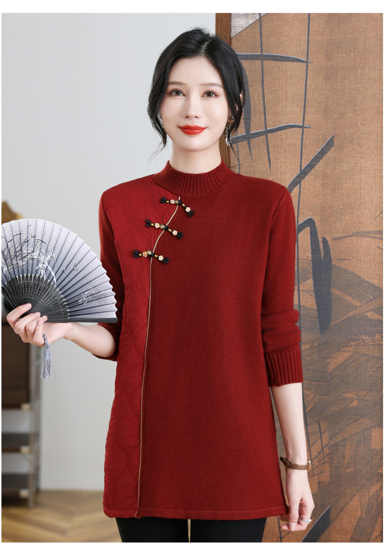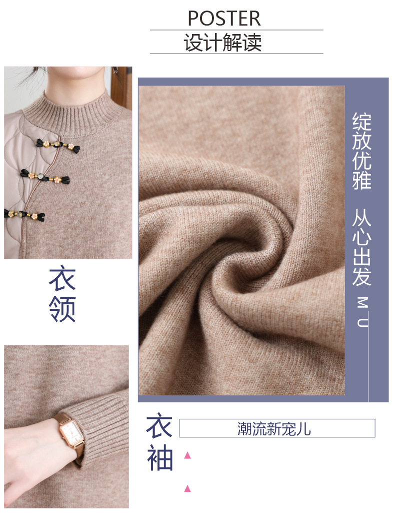 CC-101-3333冬季女装厚棉服拼接针织衫裙子中长款春秋半高领打底衫套头毛衣女