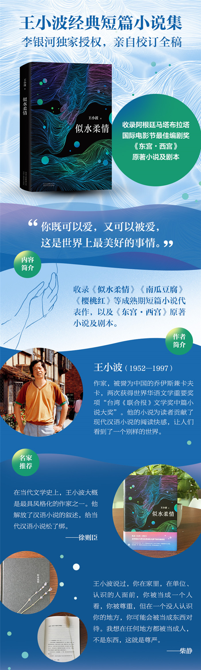 王小波经典短篇小说集,收录《似水柔情》《南瓜豆腐》《樱桃红》等成熟期短篇小说代表作。这些作品充满肆意的想象力、幽默的调侃以及在现实基础上的变形,极具风格化,体现了王小波日臻成熟的文学理念和小说技巧,读来酣畅淋漓,令人拍案叫绝。同时收录阿根廷马塔布拉塔国际电影节*编剧奖《东宫·西宫》原著小说及电影剧本、舞台剧剧本。