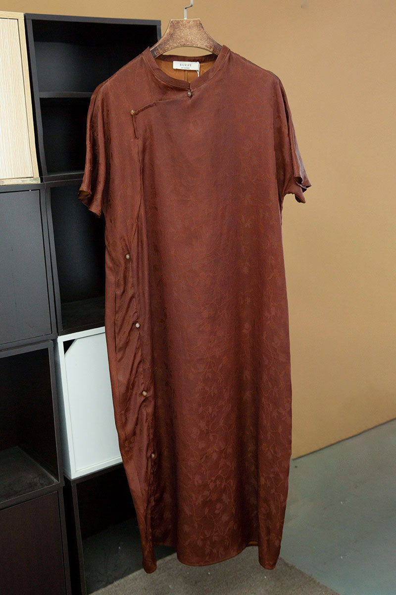 丁摩 真丝香云纱短袖旗袍连衣裙女玫瑰印花100桑蚕丝立领斜门襟裙5ZF-52060