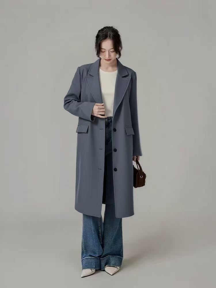 【自营】【外套系列】灰色单排扣后开叉显瘦长款外套-喜出