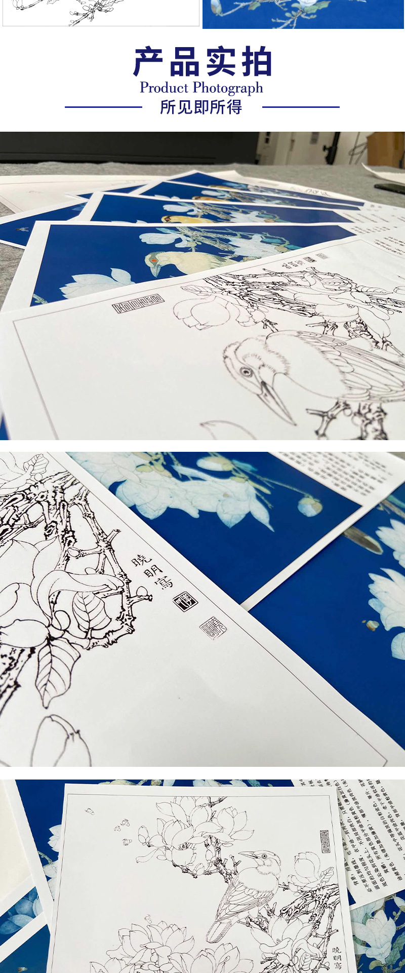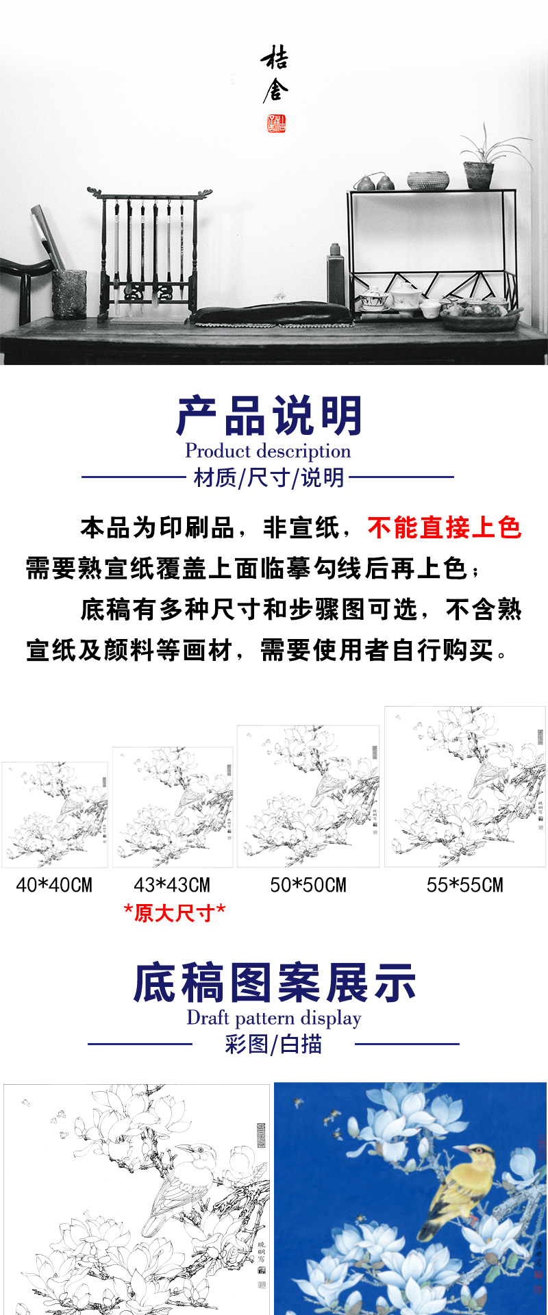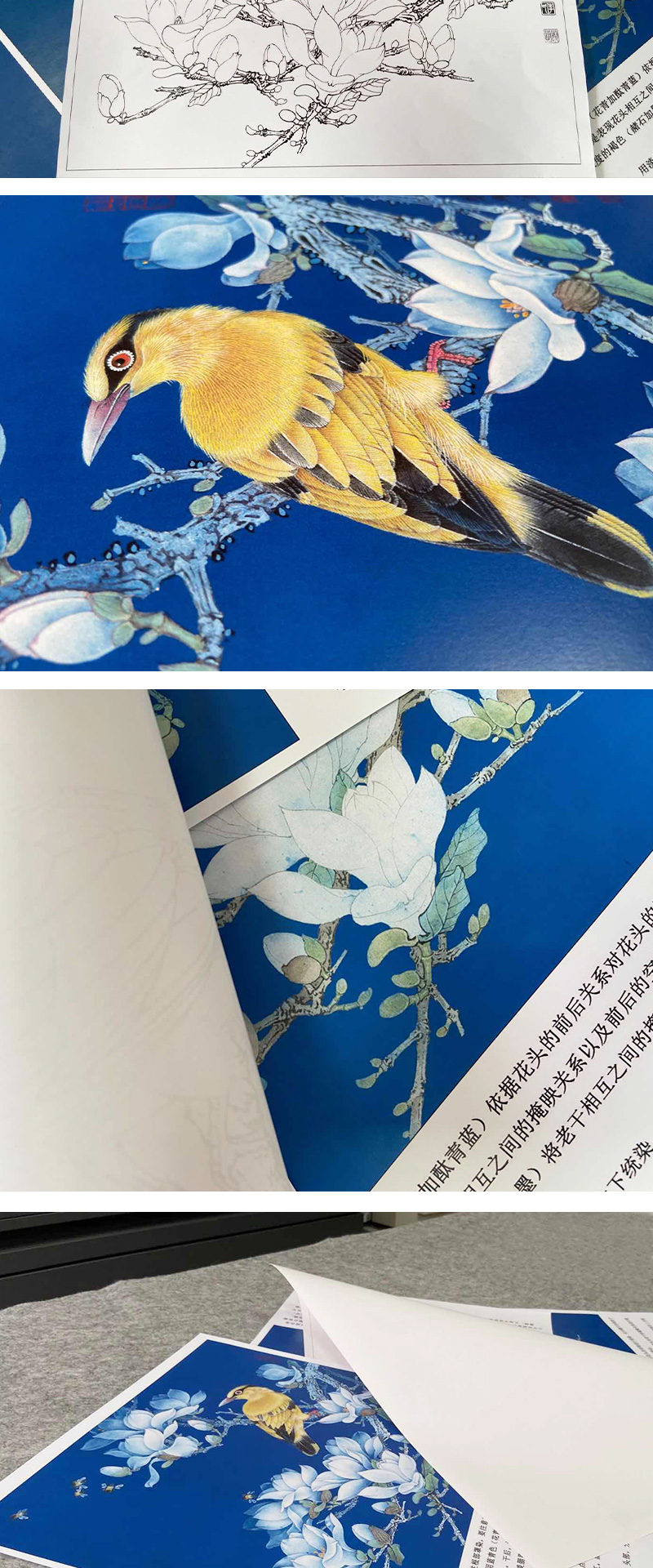 【有步骤、大彩图】李晓明工笔花鸟白描底稿斗方小品《玉兰黄鹂》初学者临摹高清打印稿KB25