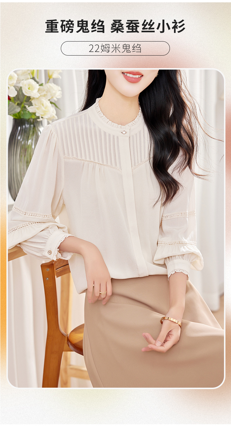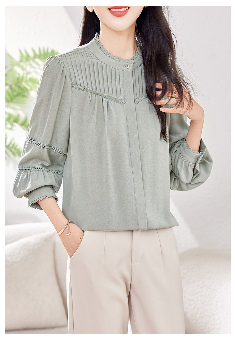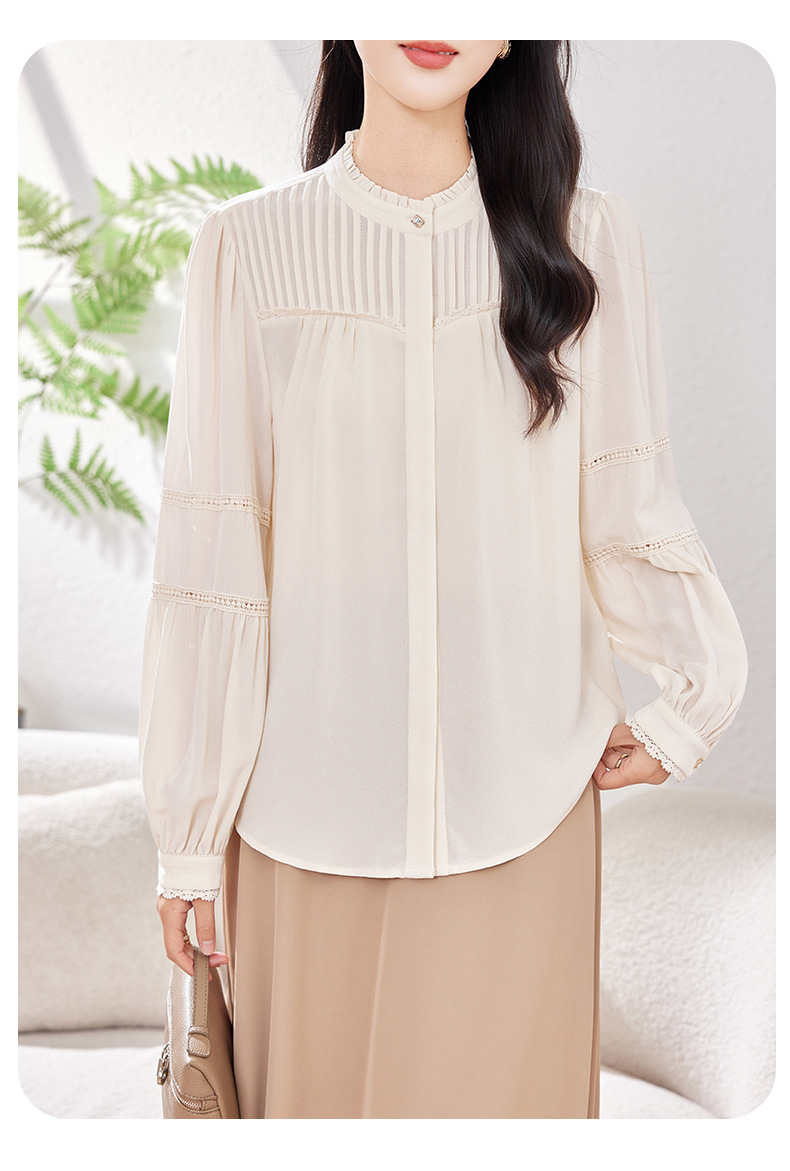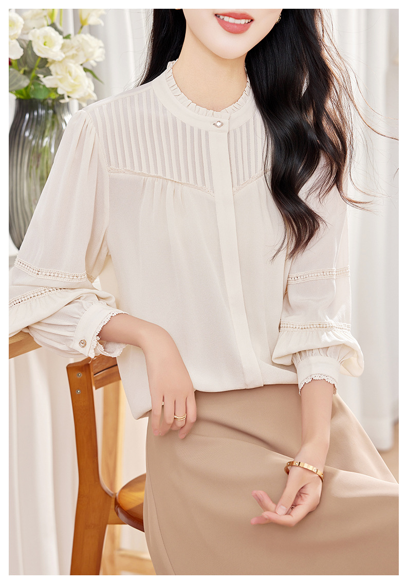 KQ-2026春季新款欧美风蕾丝细褶桑蚕丝长袖衬衫纯色设计感灯笼袖上衣