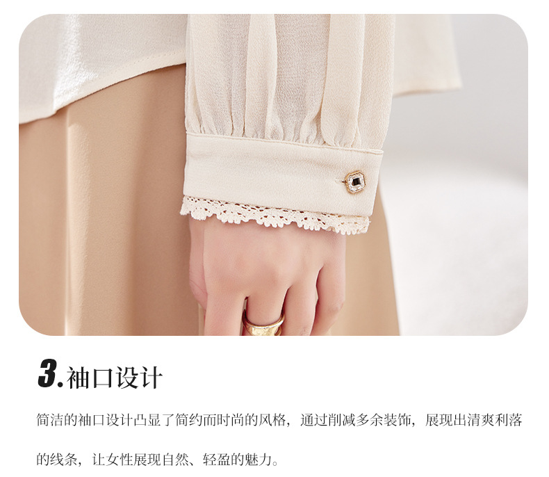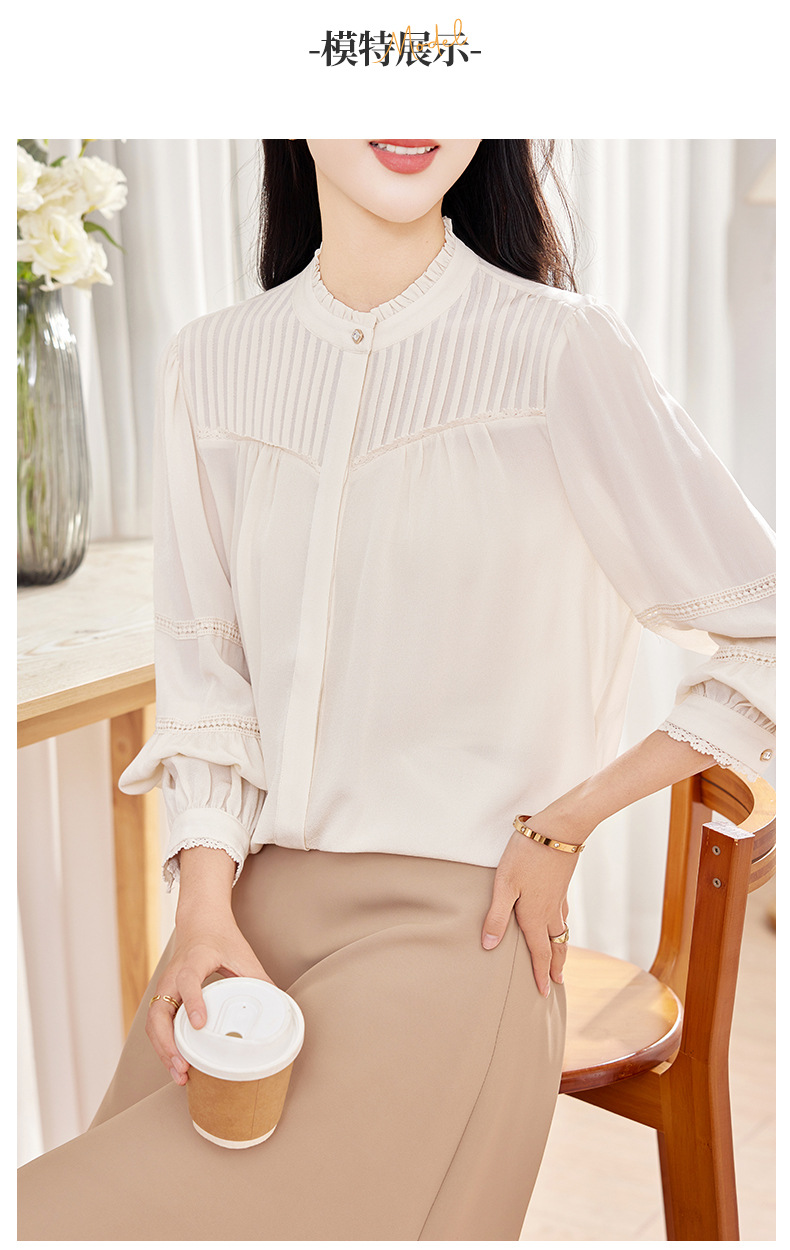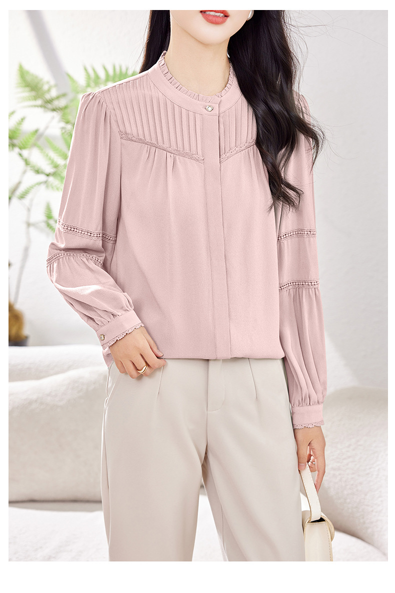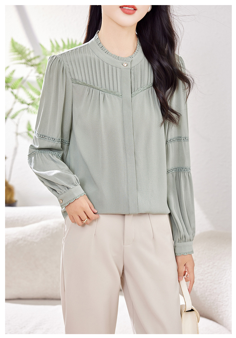 KQ-2026春季新款欧美风蕾丝细褶桑蚕丝长袖衬衫纯色设计感灯笼袖上衣