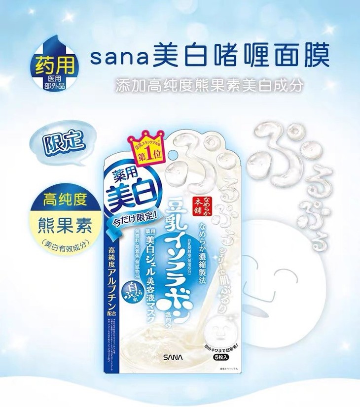 SANA 豆乳美白凝露面膜 5枚👍SANA的豆乳系列一直是明星品🔥,一张面膜即可轻松完成洁面后的护肤过程,👉可以实现化妆水、美容液、乳液、面霜、面膜5️⃣种产品的功效,懒人必备啊!这款美白面膜添加SANA豆乳研发的豆乳发酵液,配合有效高纯度熊果素美白成分✨,抑制黑色素生成,改善暗黄、斑点、提升透明、润滑肤色😘。面膜不添加色素香精矿物油,超自然的豆乳味道,安全放心✅,孕妇都可以使用哦。