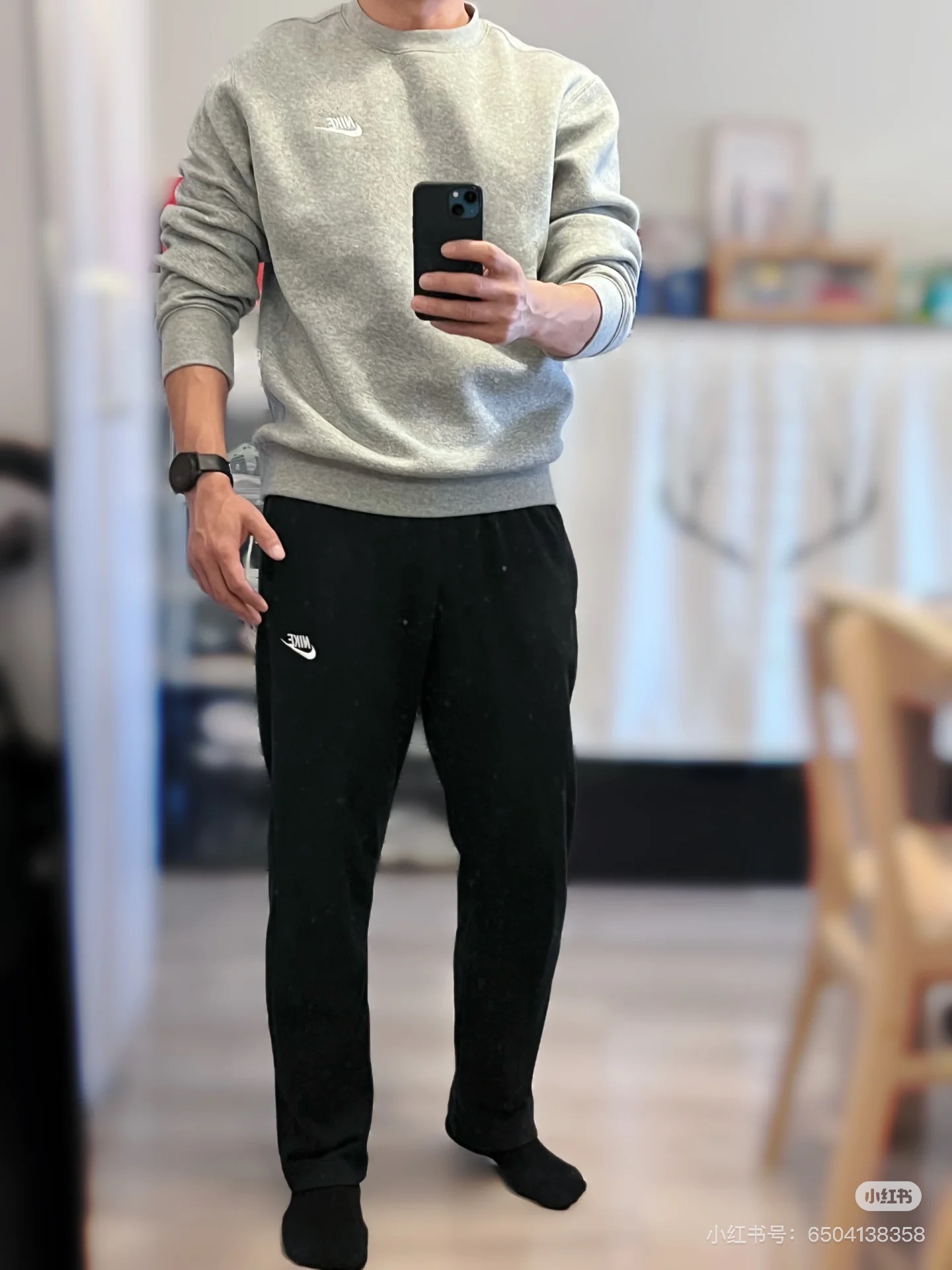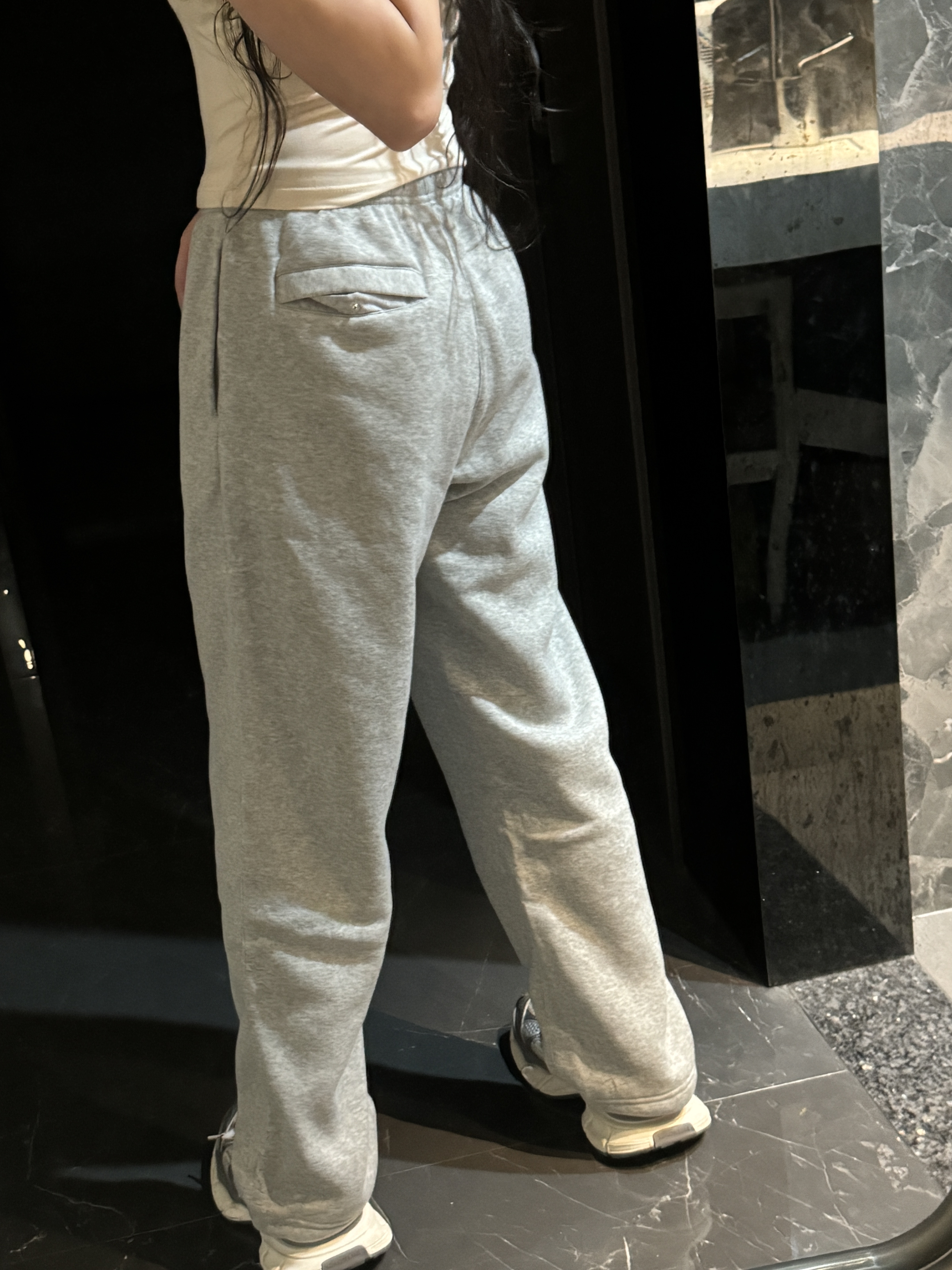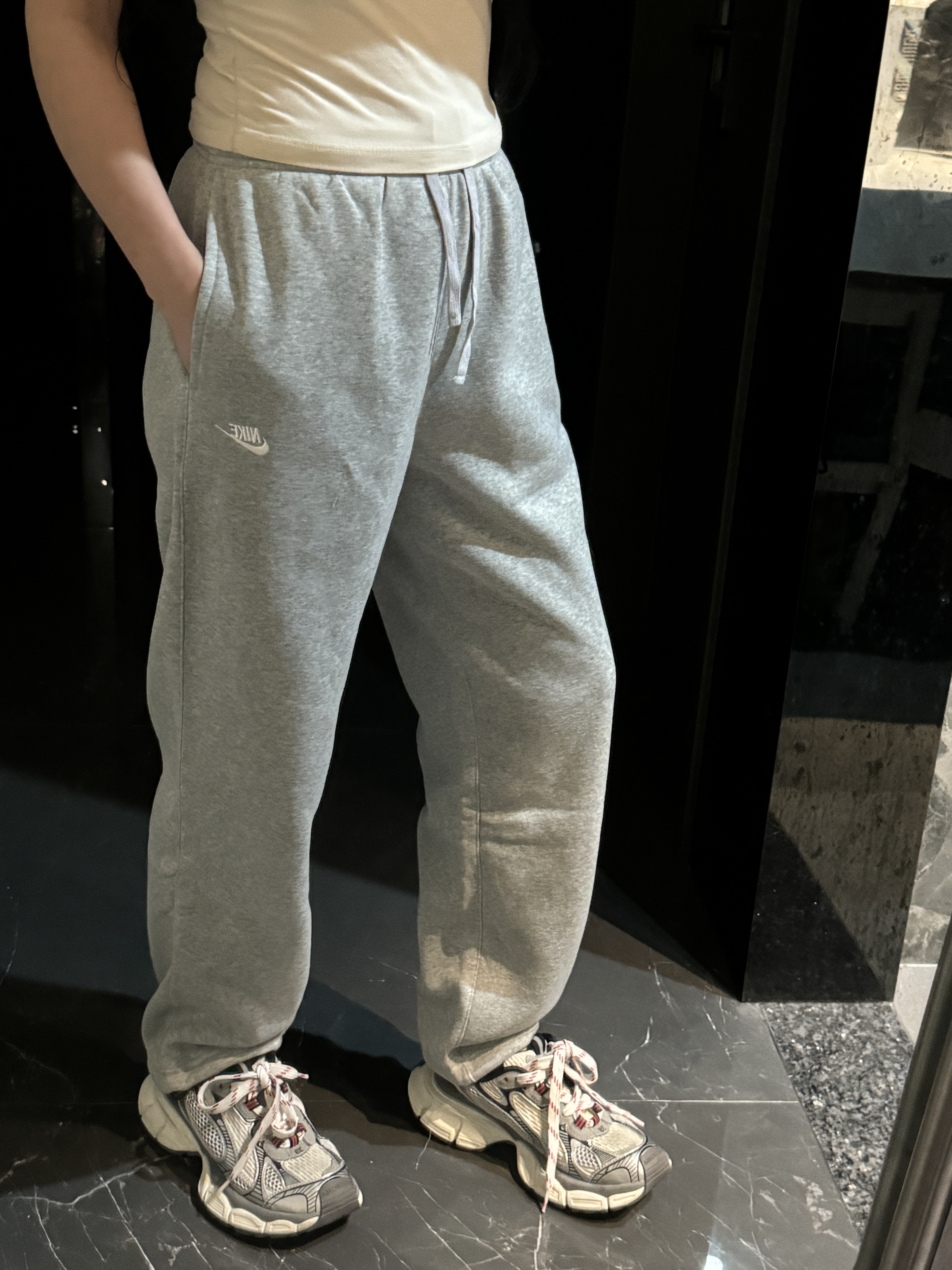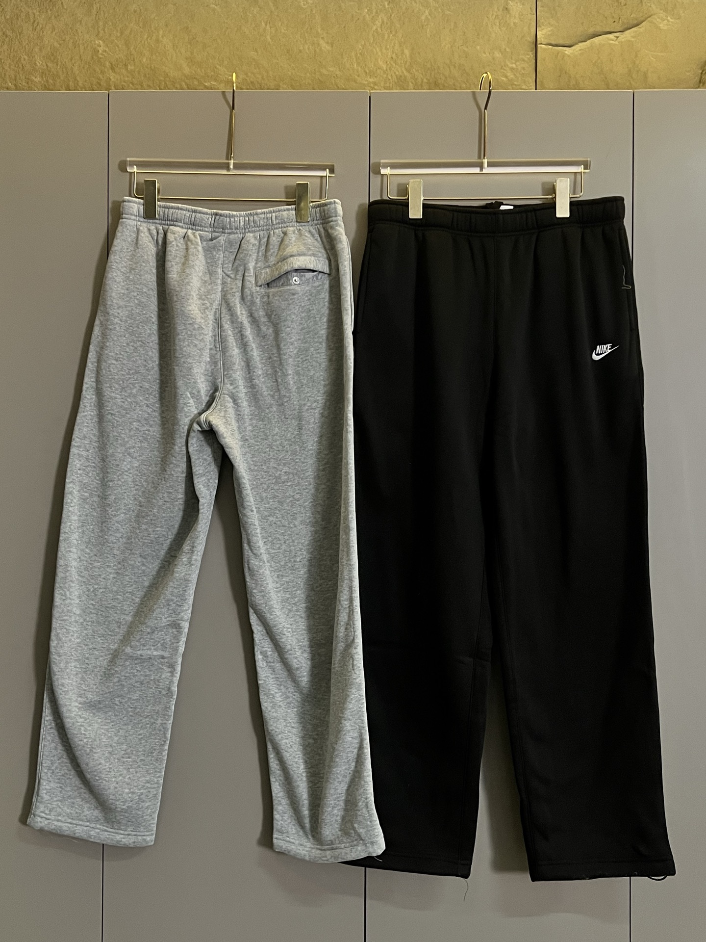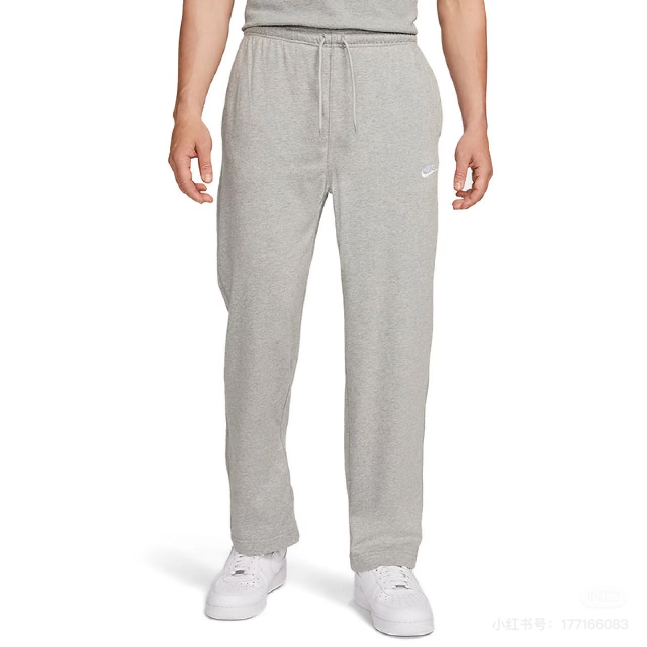 N&ike Club 系带百搭直筒休闲阔腿裤 男女同款 黑灰色👉采用100纯棉面料,内里加一层薄绒 看起来舒适且有一定厚度 裤型为直筒宽松设计,适合日常休闲穿着,•裤腰是松紧带+抽绳设计😎,方便调节,腿外侧有白色的经典耐克小勾(Swoosh)刺绣Logo裤脚是直筒剪裁带猪鼻扣,没有明显的收脚设计。
