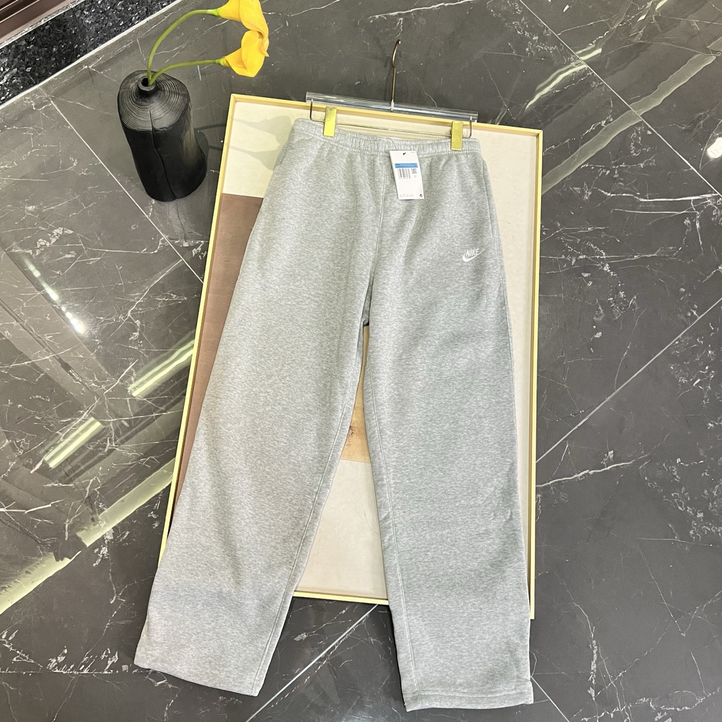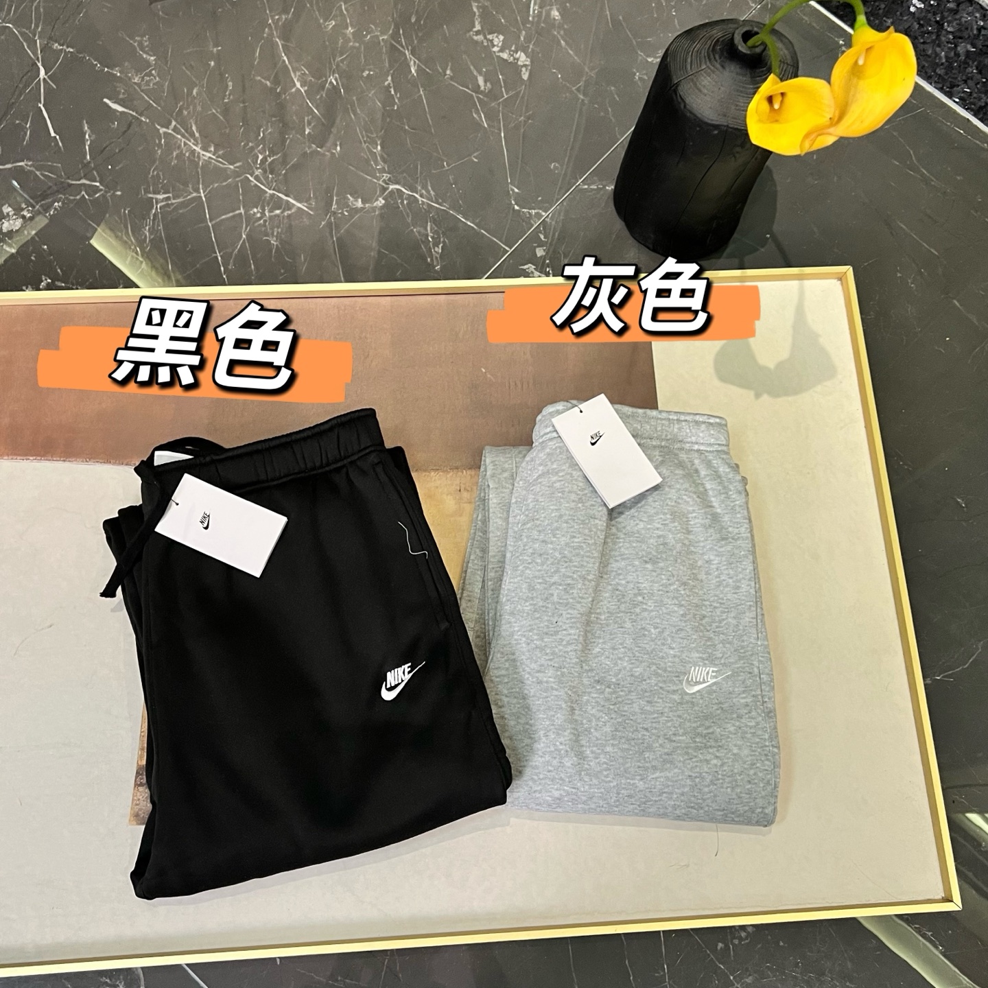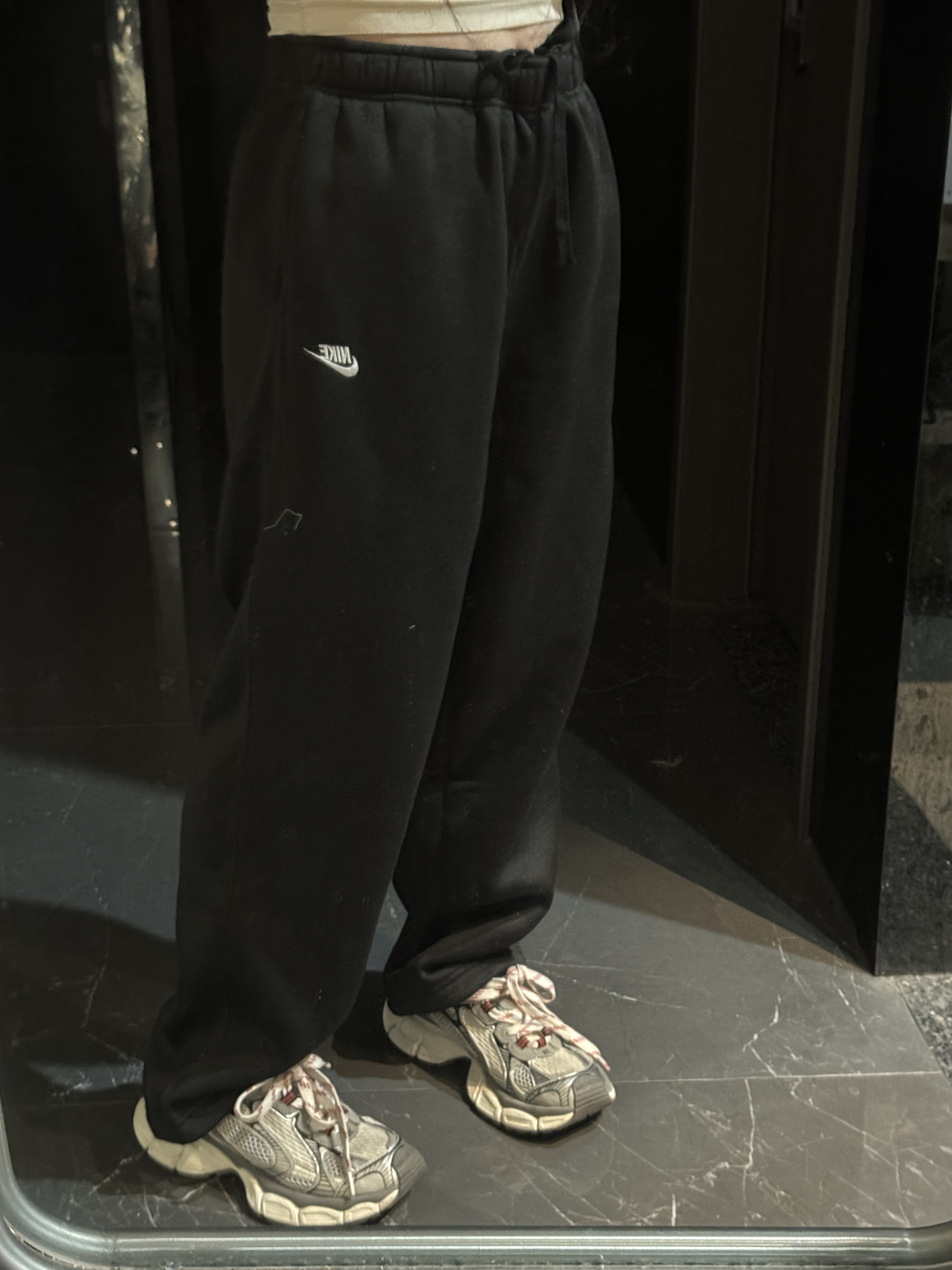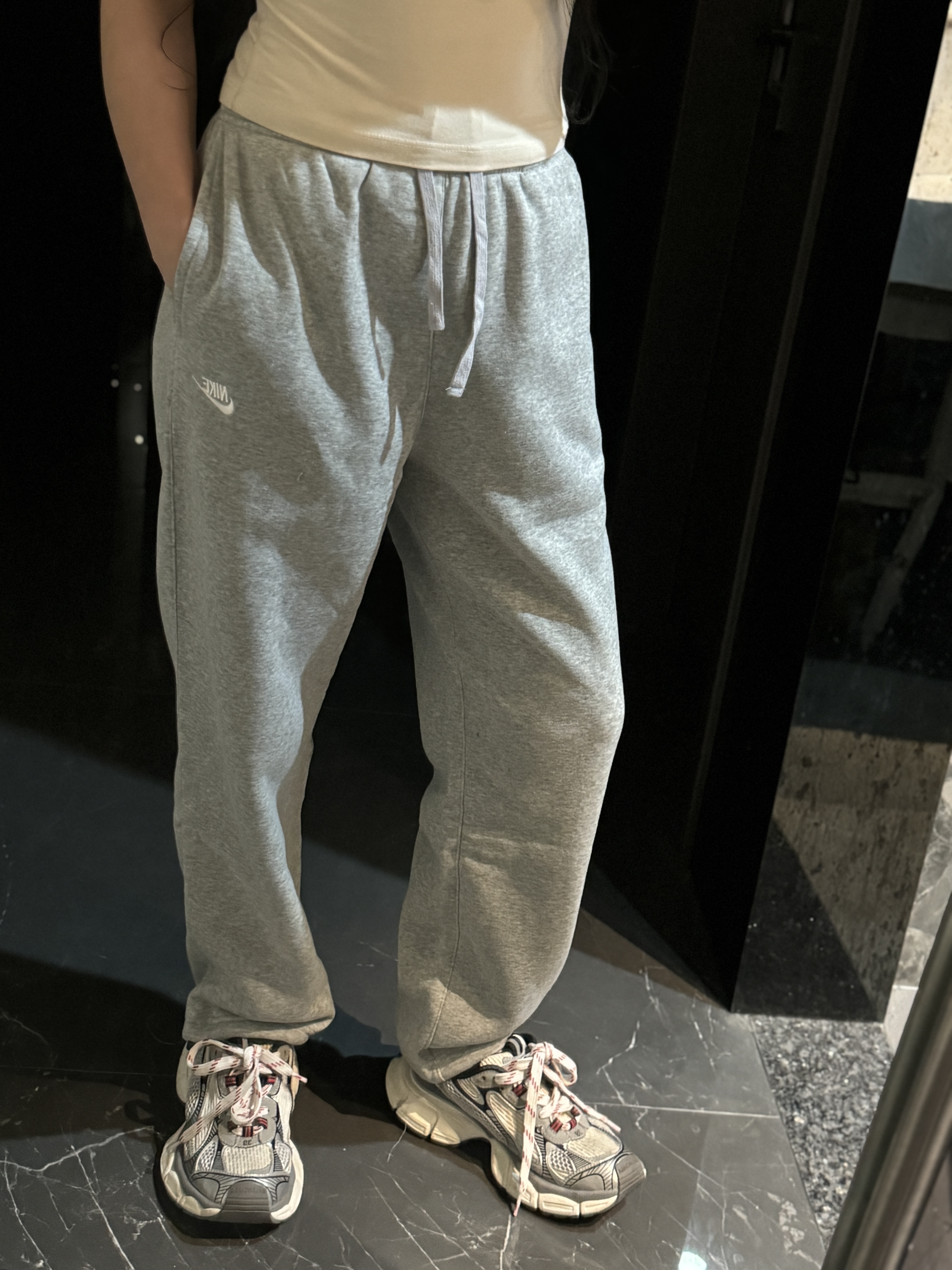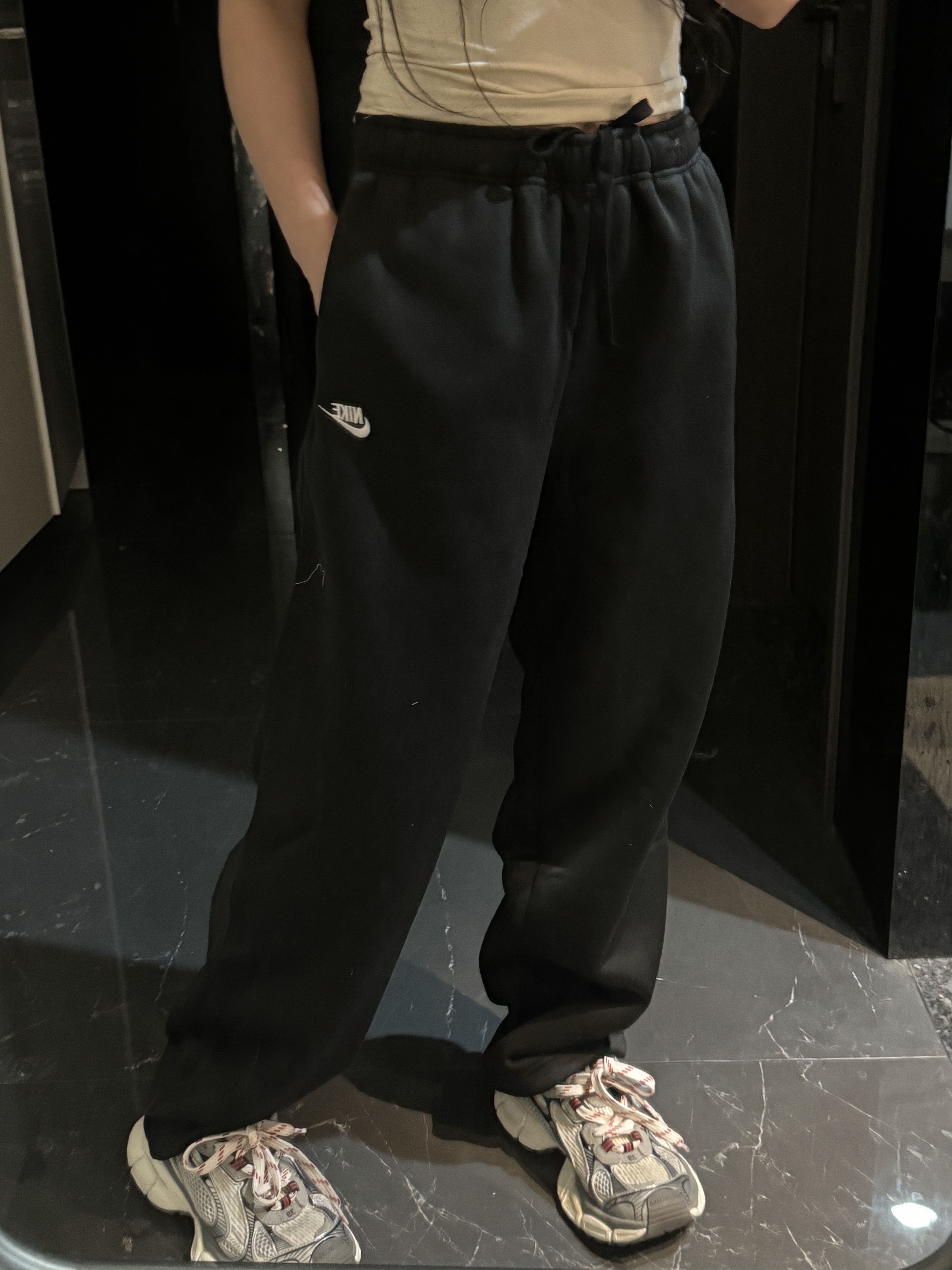 N&ike Club 系带百搭直筒休闲阔腿裤 男女同款 黑灰色👉采用100纯棉面料,内里加一层薄绒 看起来舒适且有一定厚度 裤型为直筒宽松设计,适合日常休闲穿着,•裤腰是松紧带+抽绳设计😎,方便调节,腿外侧有白色的经典耐克小勾(Swoosh)刺绣Logo裤脚是直筒剪裁带猪鼻扣,没有明显的收脚设计。
