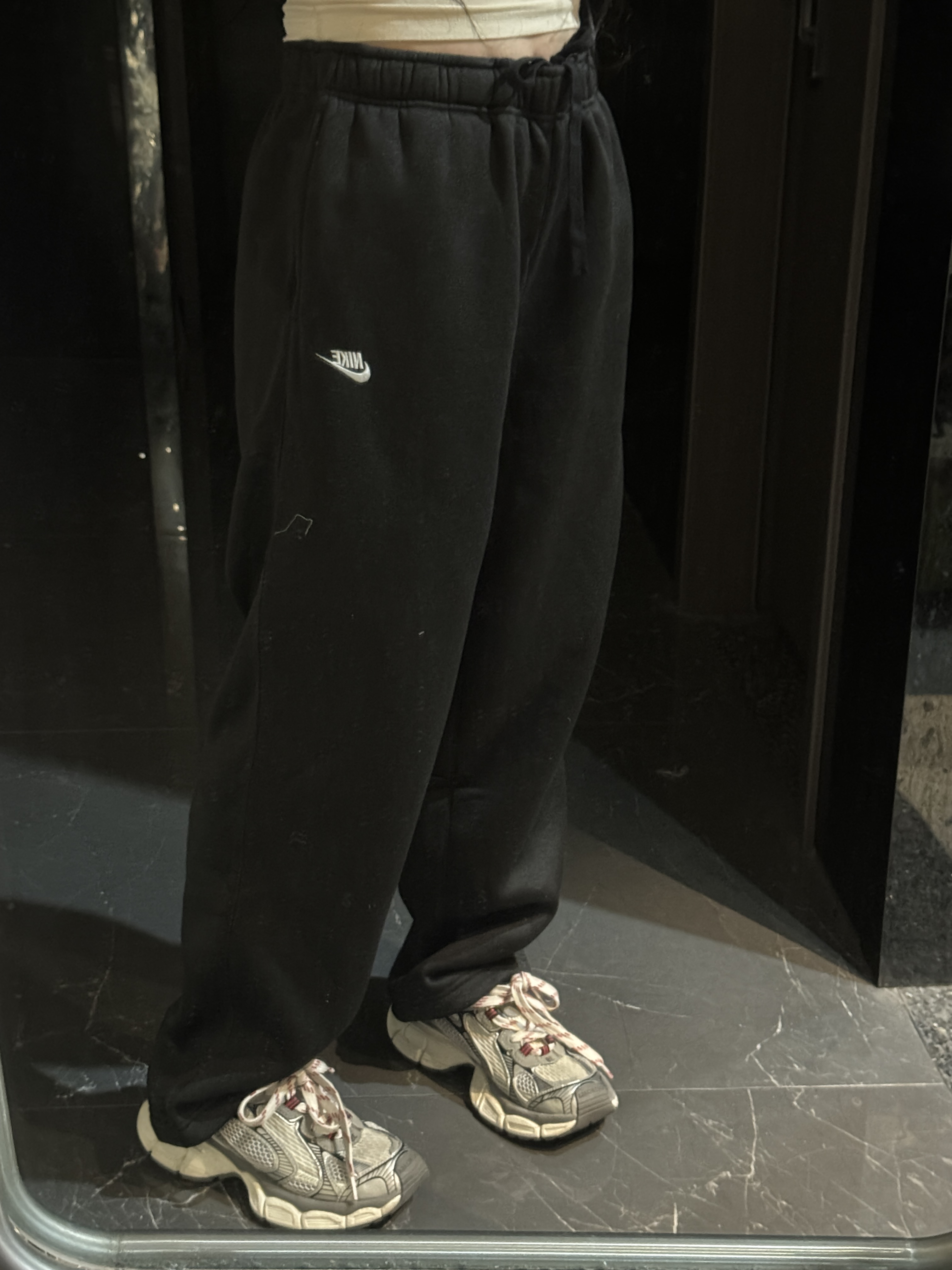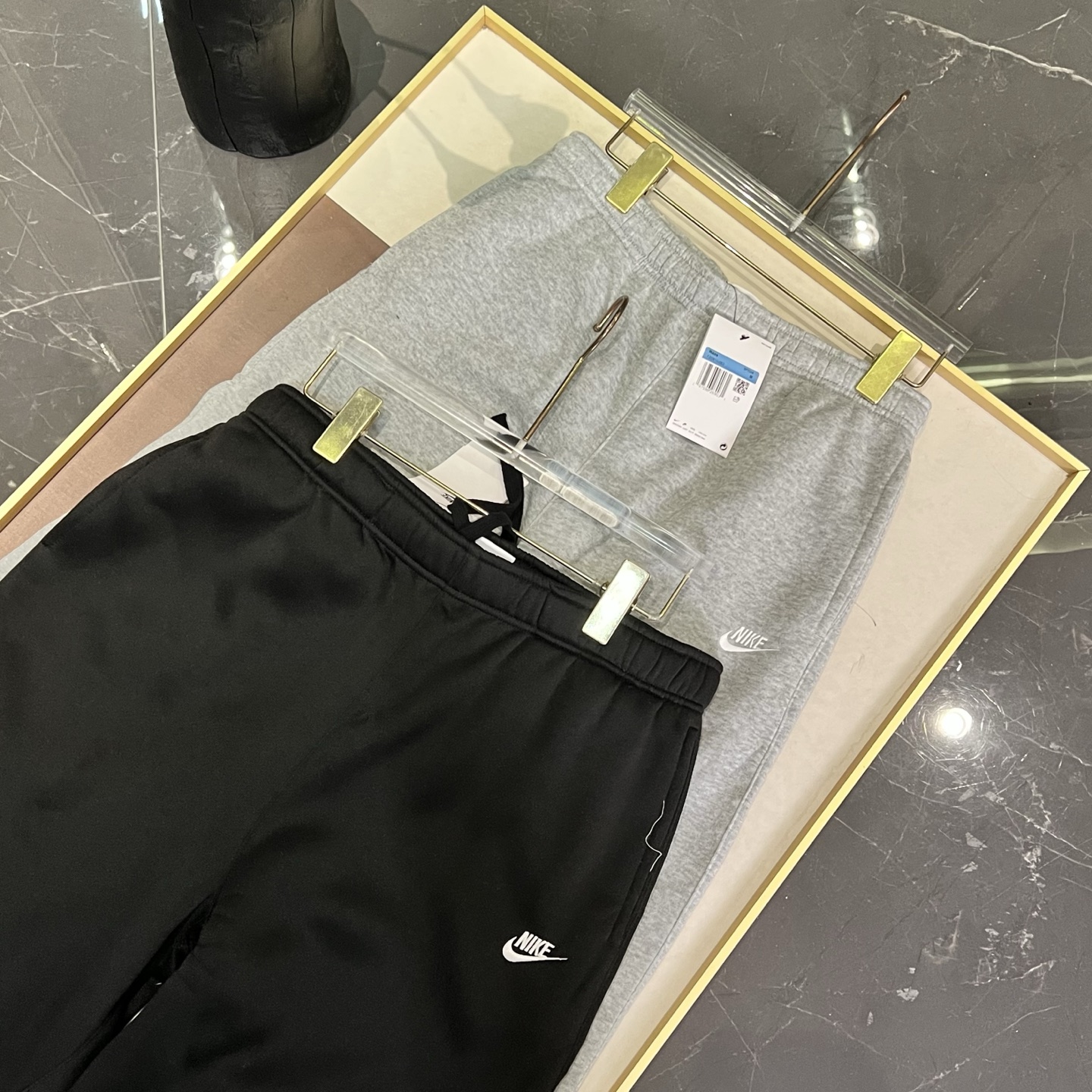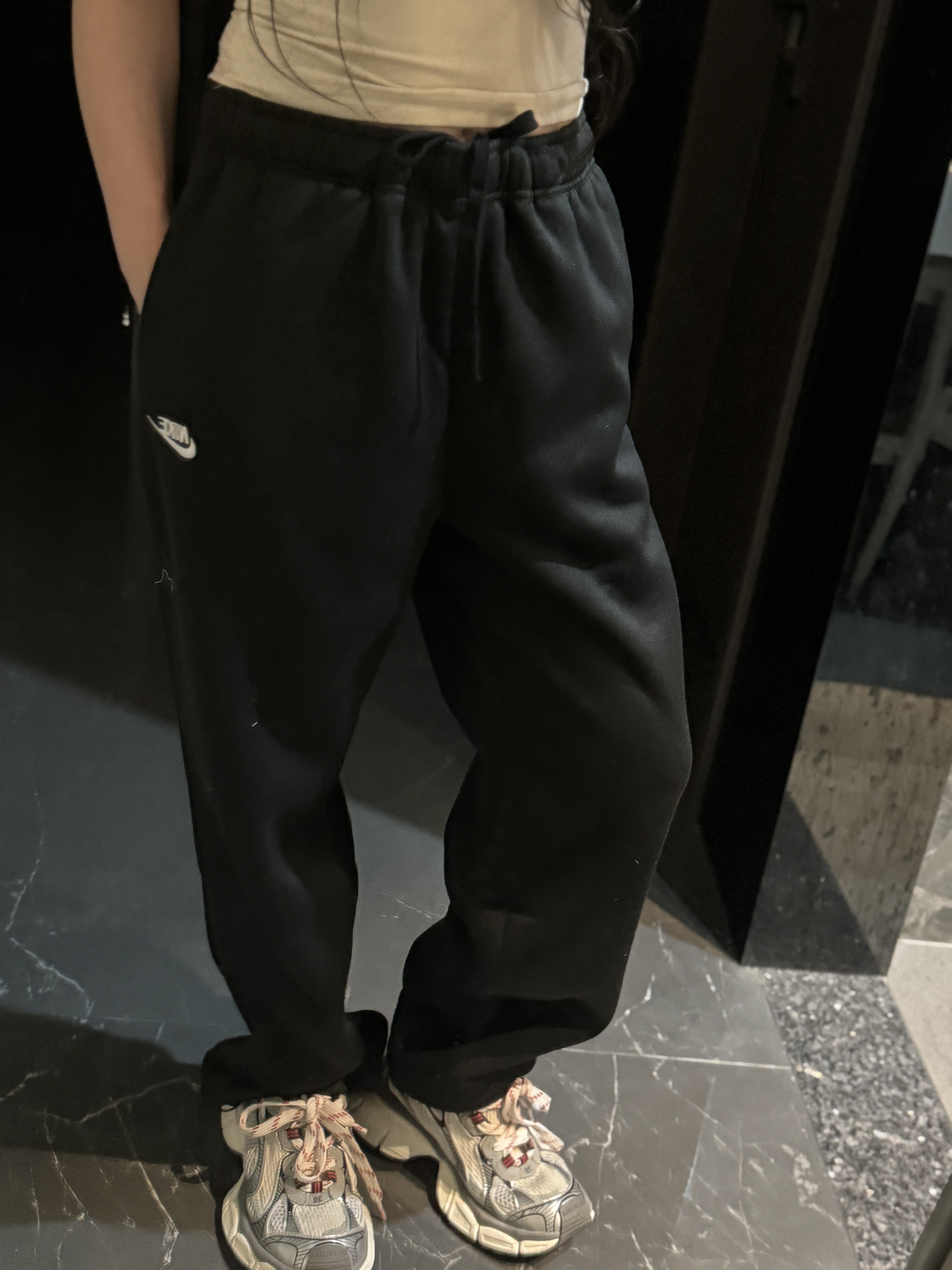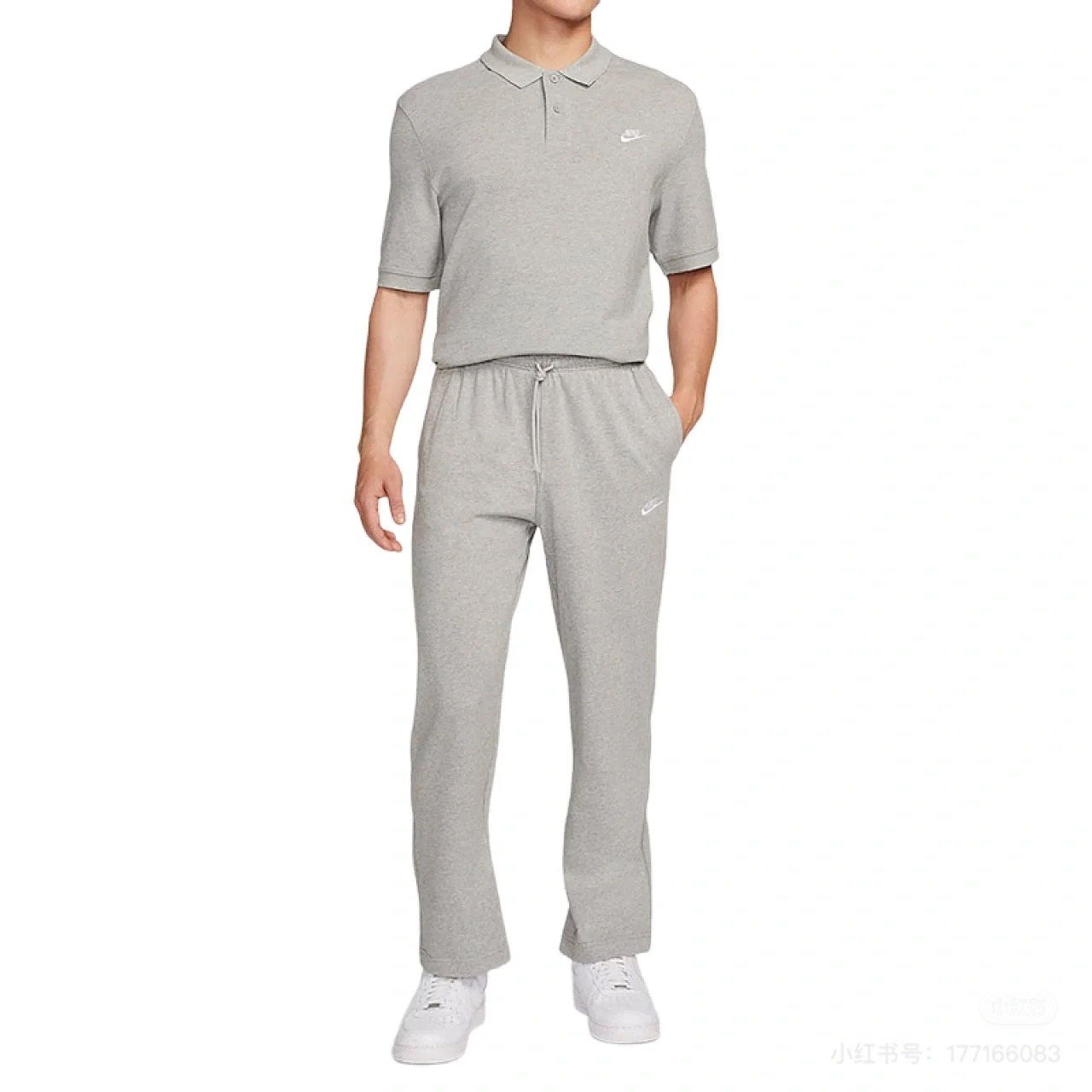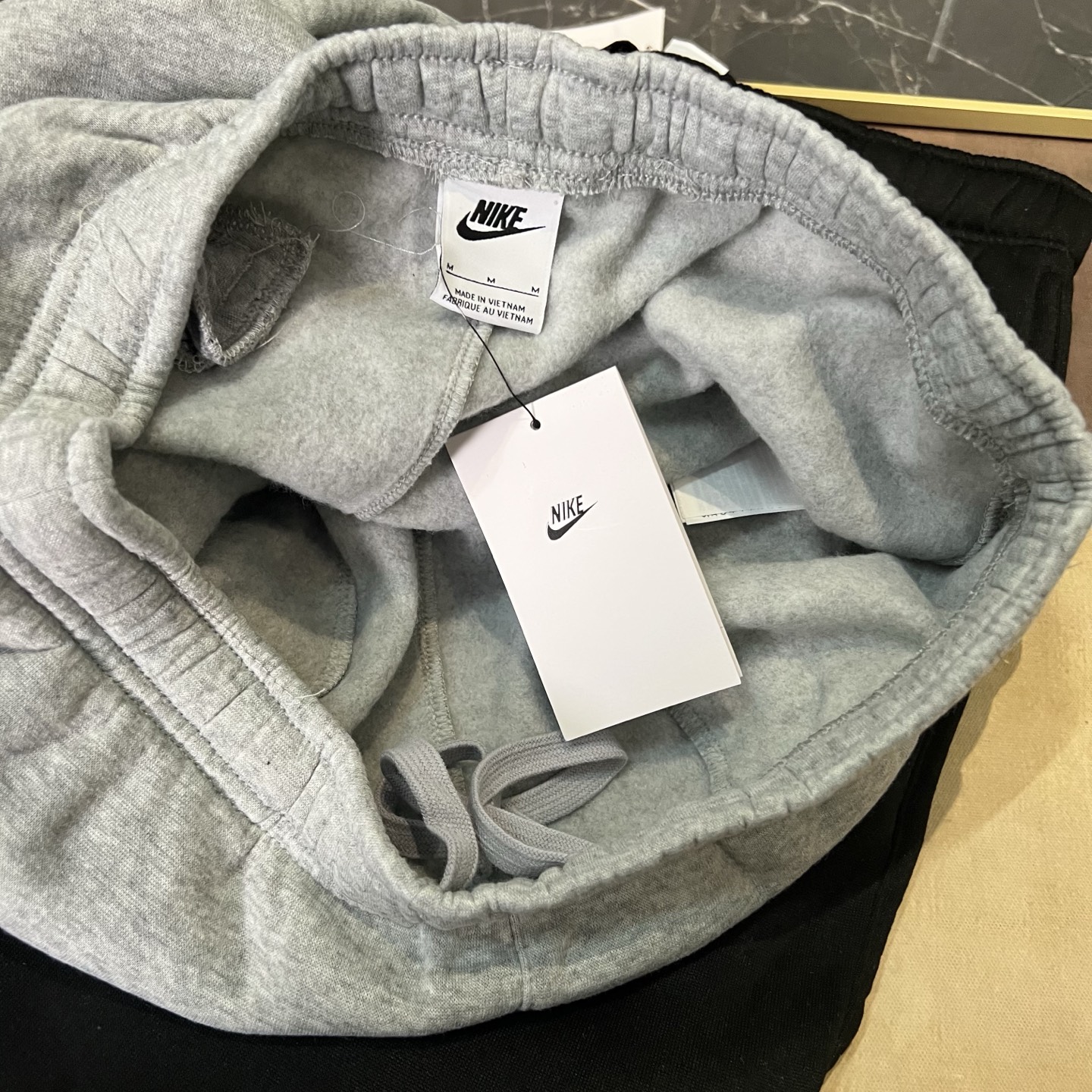 N&ike Club 系带百搭直筒休闲阔腿裤 男女同款 黑灰色👉采用100纯棉面料,内里加一层薄绒 看起来舒适且有一定厚度 裤型为直筒宽松设计,适合日常休闲穿着,•裤腰是松紧带+抽绳设计😎,方便调节,腿外侧有白色的经典耐克小勾(Swoosh)刺绣Logo裤脚是直筒剪裁带猪鼻扣,没有明显的收脚设计。
