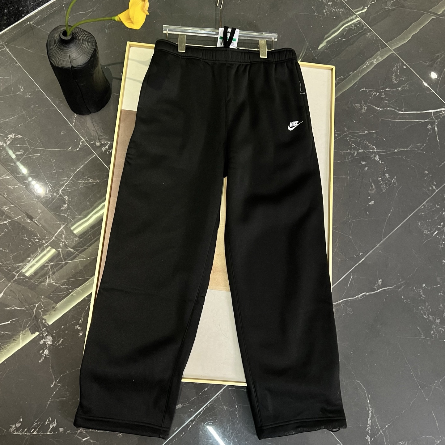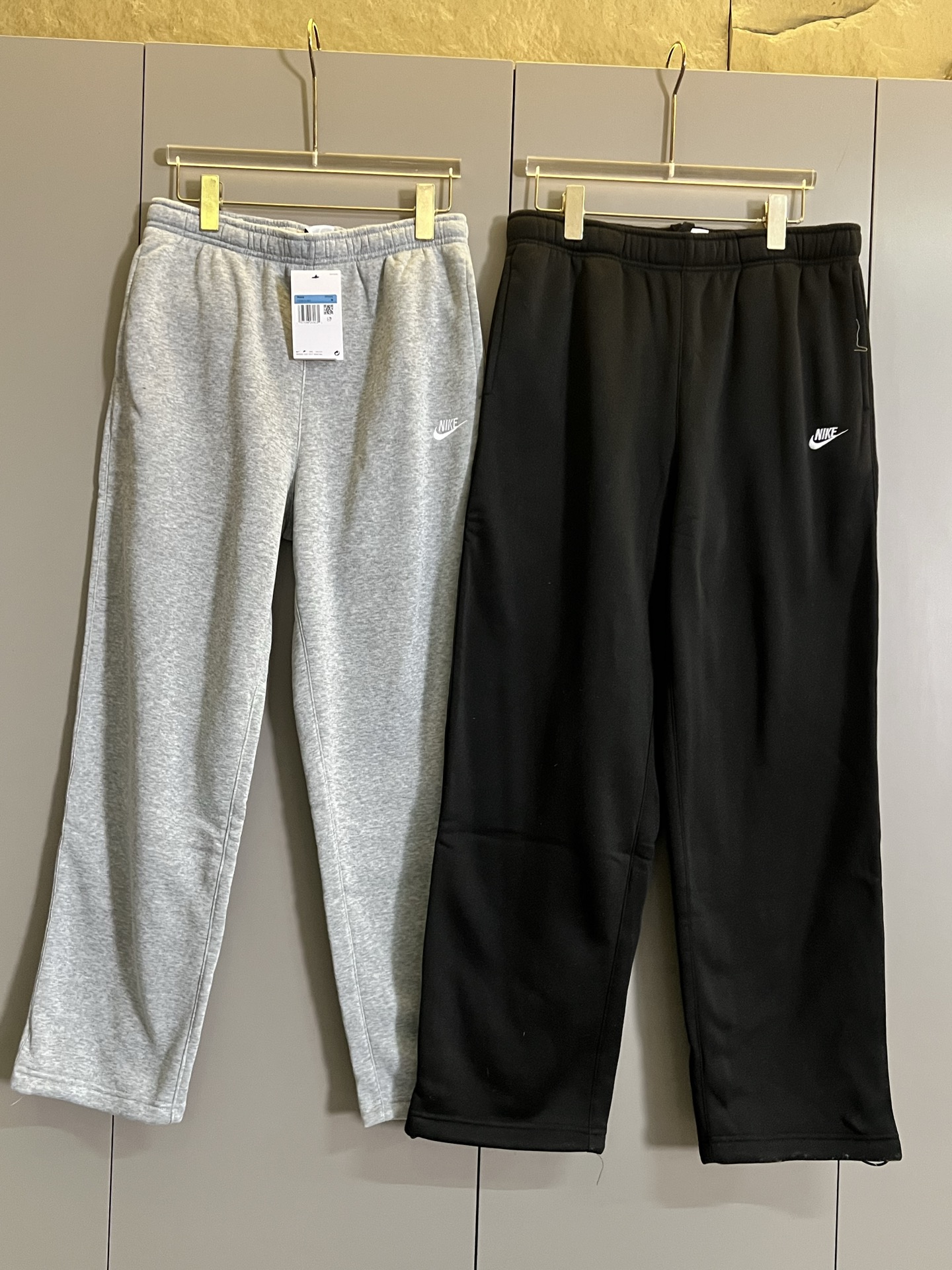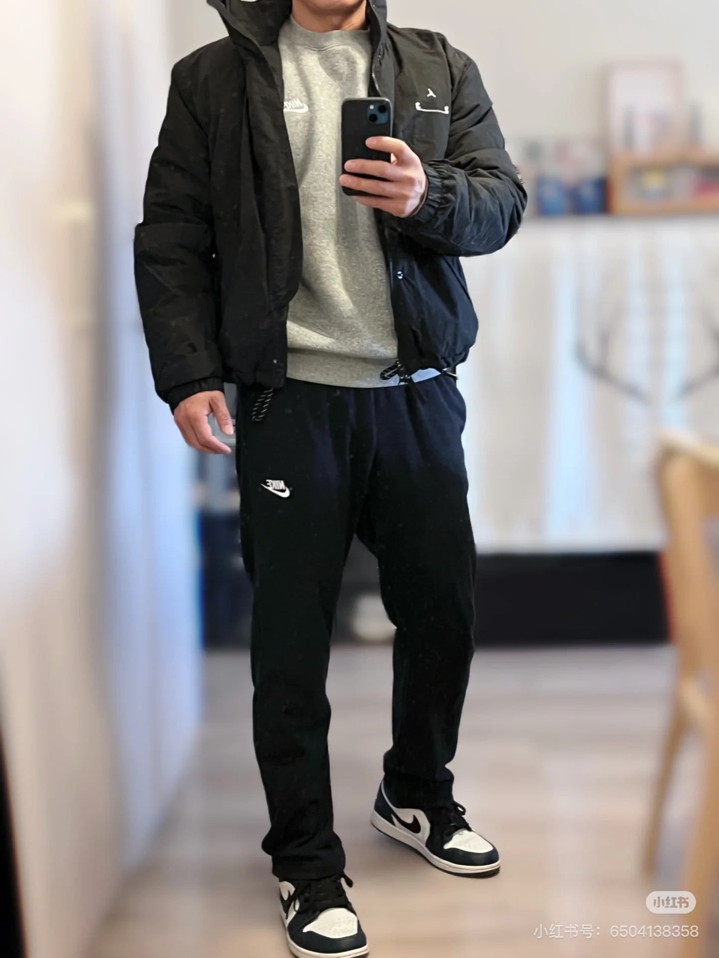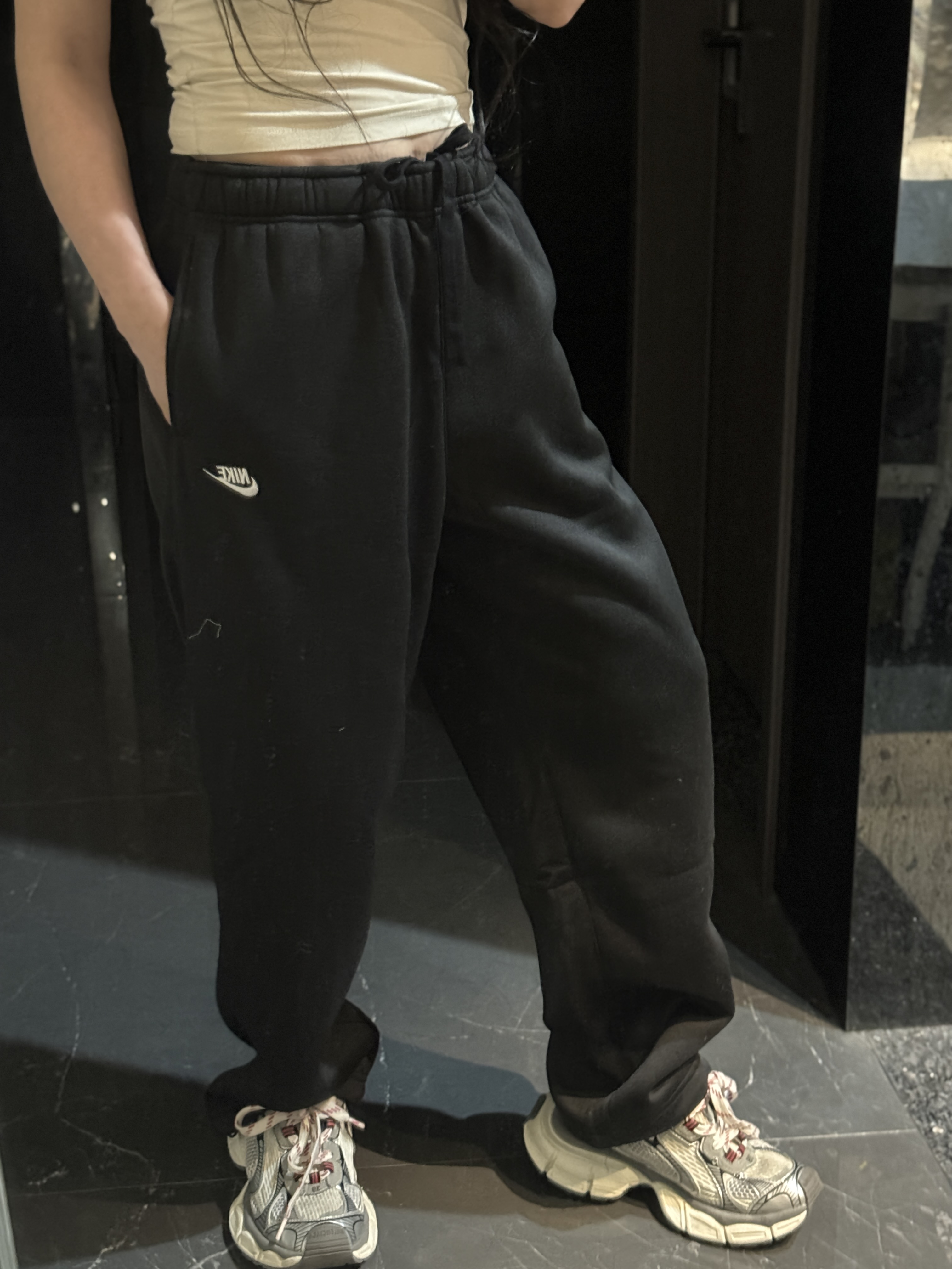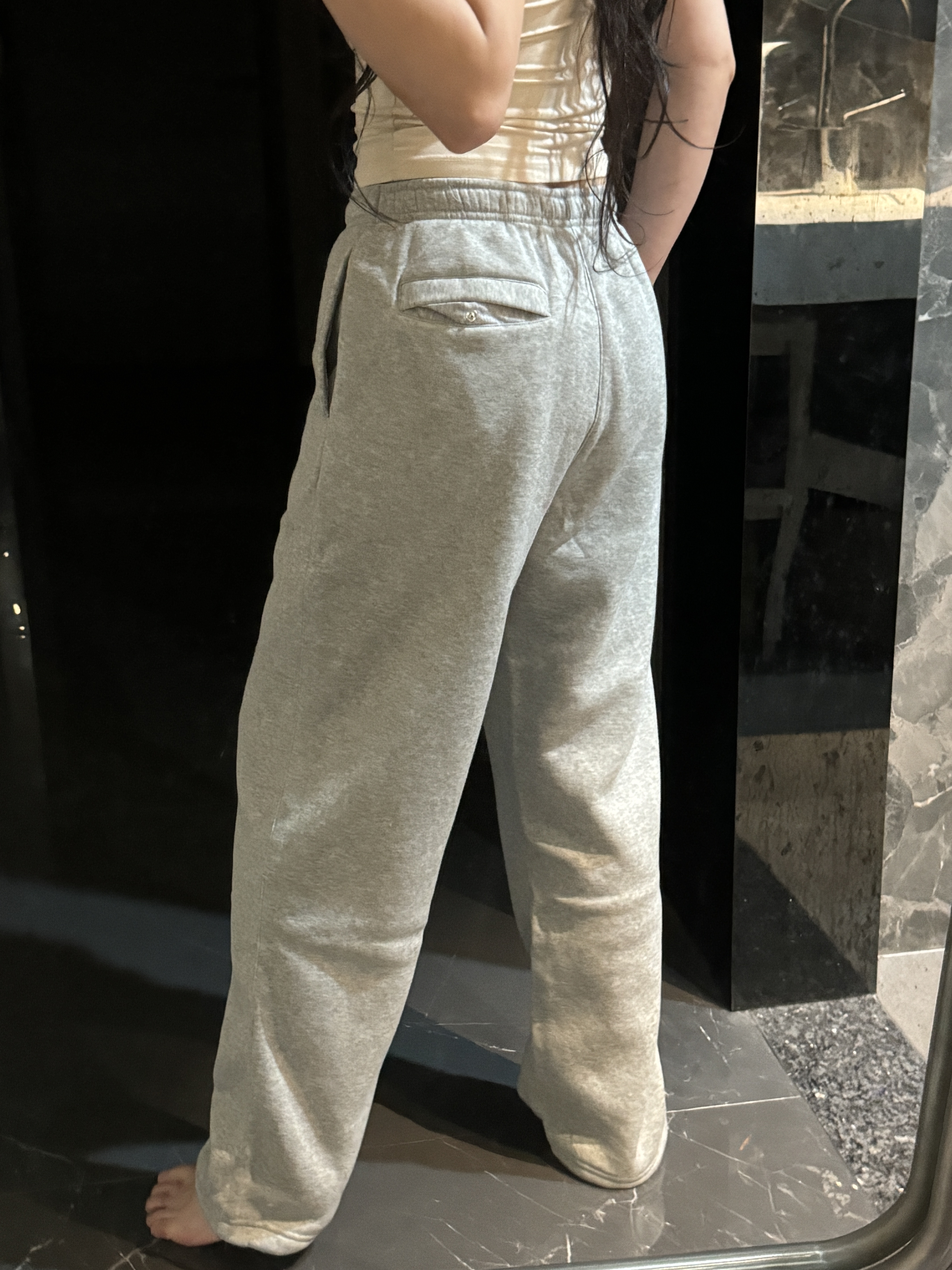 N&ike Club 系带百搭直筒休闲阔腿裤 男女同款 黑灰色👉采用100纯棉面料,内里加一层薄绒 看起来舒适且有一定厚度 裤型为直筒宽松设计,适合日常休闲穿着,•裤腰是松紧带+抽绳设计😎,方便调节,腿外侧有白色的经典耐克小勾(Swoosh)刺绣Logo裤脚是直筒剪裁带猪鼻扣,没有明显的收脚设计。