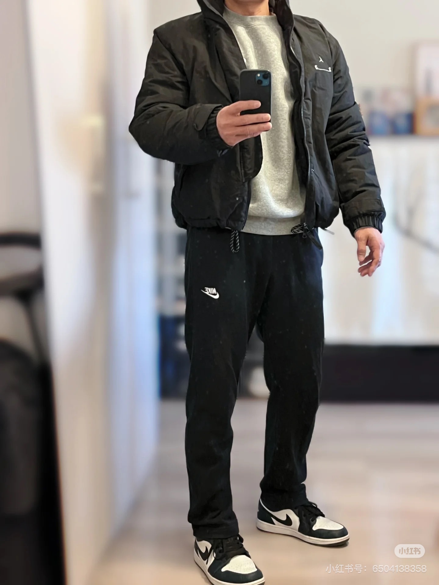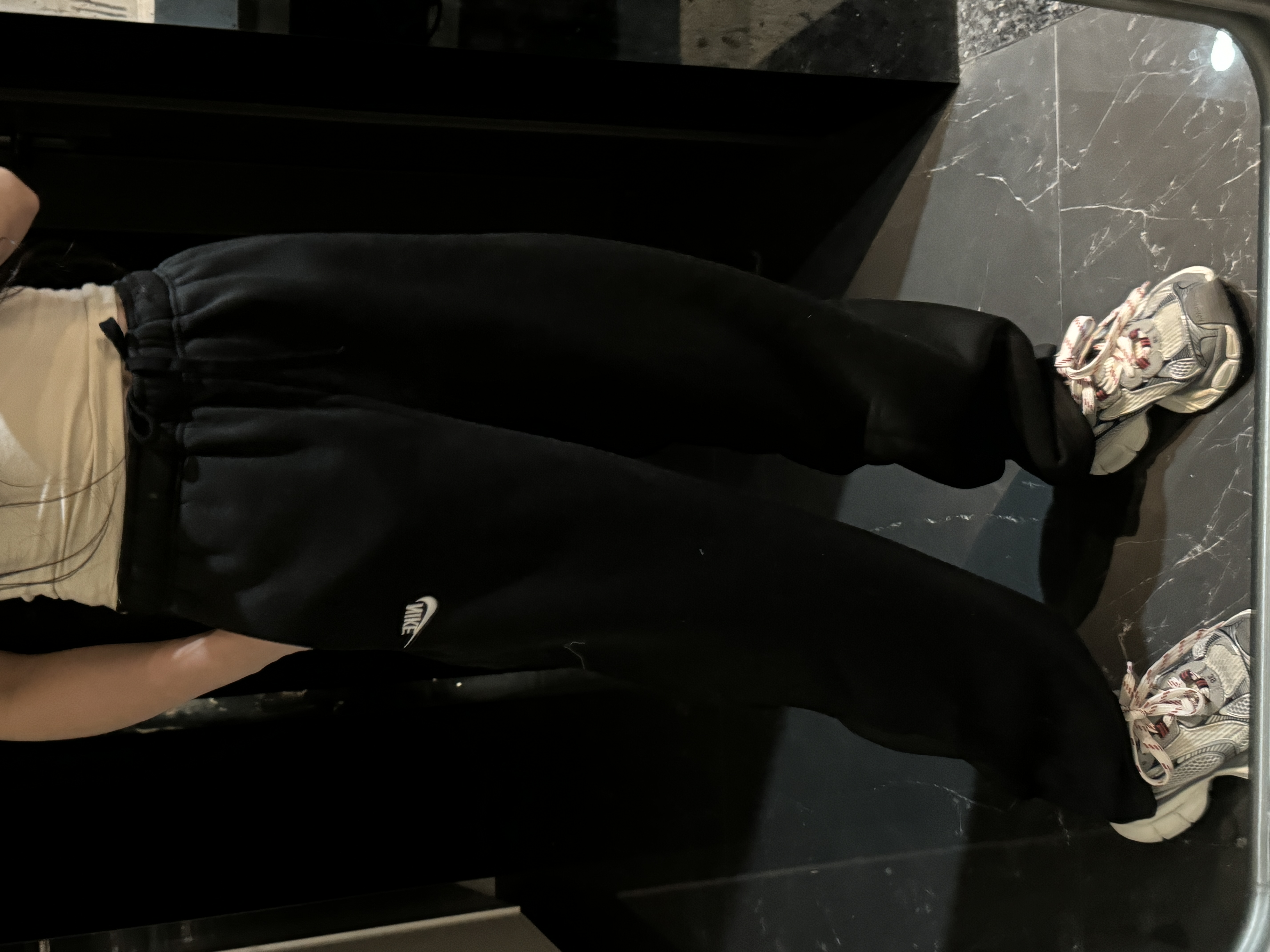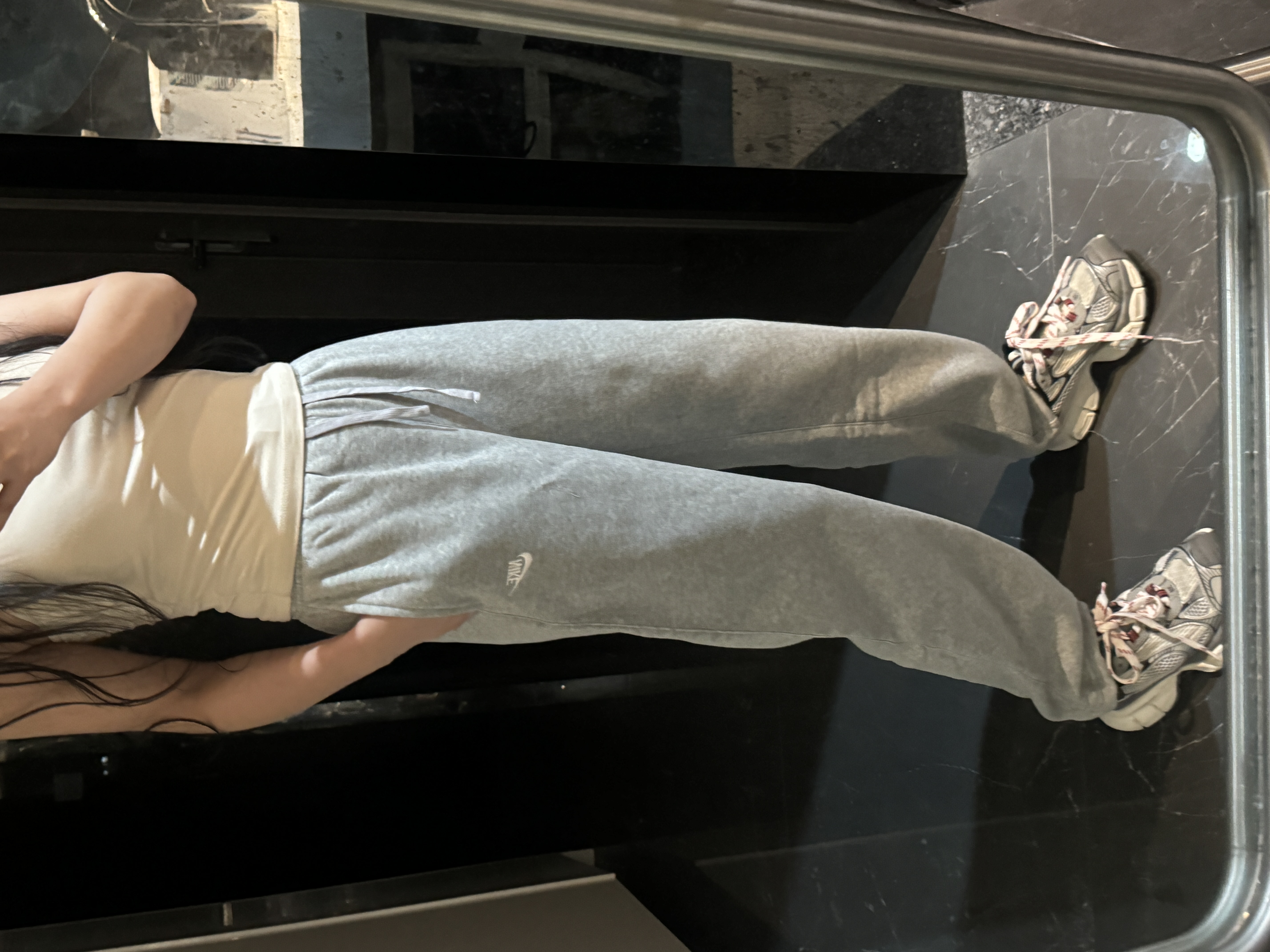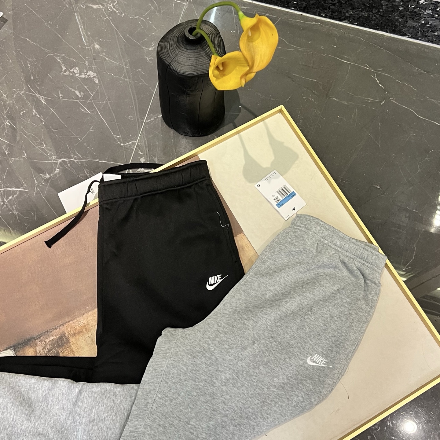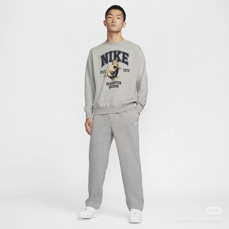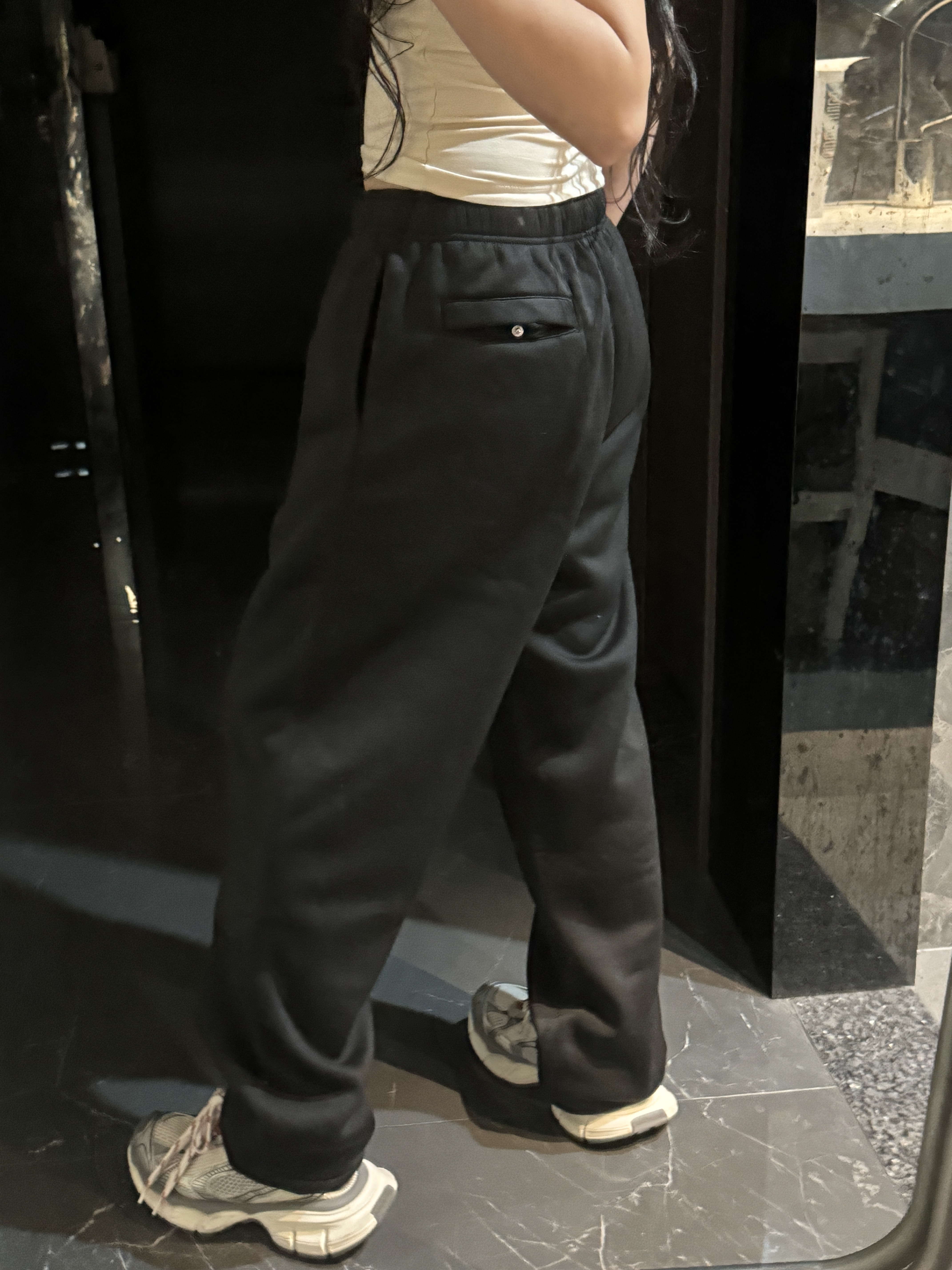 N&ike Club 系带百搭直筒休闲阔腿裤 男女同款 黑灰色👉采用100纯棉面料,内里加一层薄绒 看起来舒适且有一定厚度 裤型为直筒宽松设计,适合日常休闲穿着,•裤腰是松紧带+抽绳设计😎,方便调节,腿外侧有白色的经典耐克小勾(Swoosh)刺绣Logo裤脚是直筒剪裁带猪鼻扣,没有明显的收脚设计。