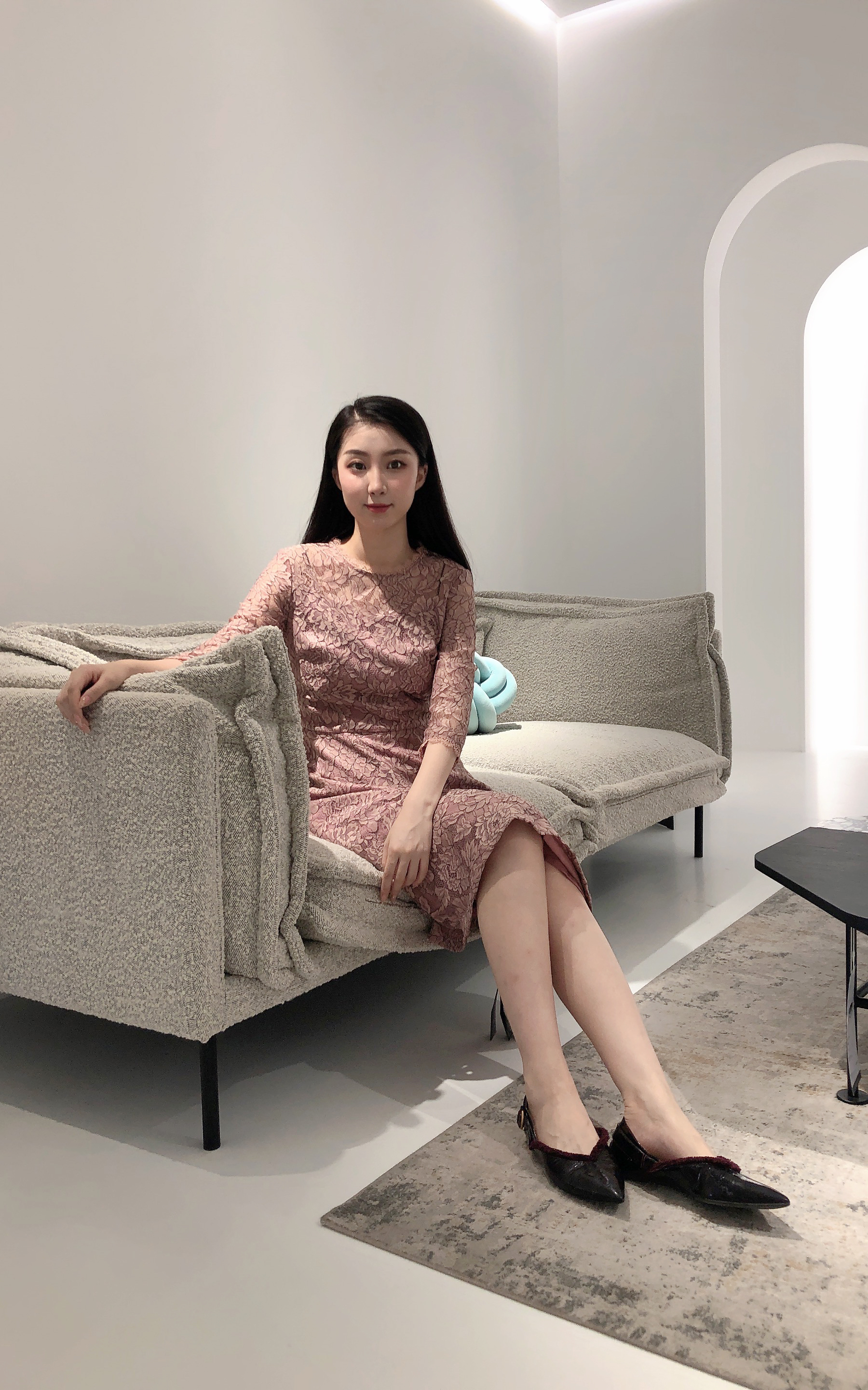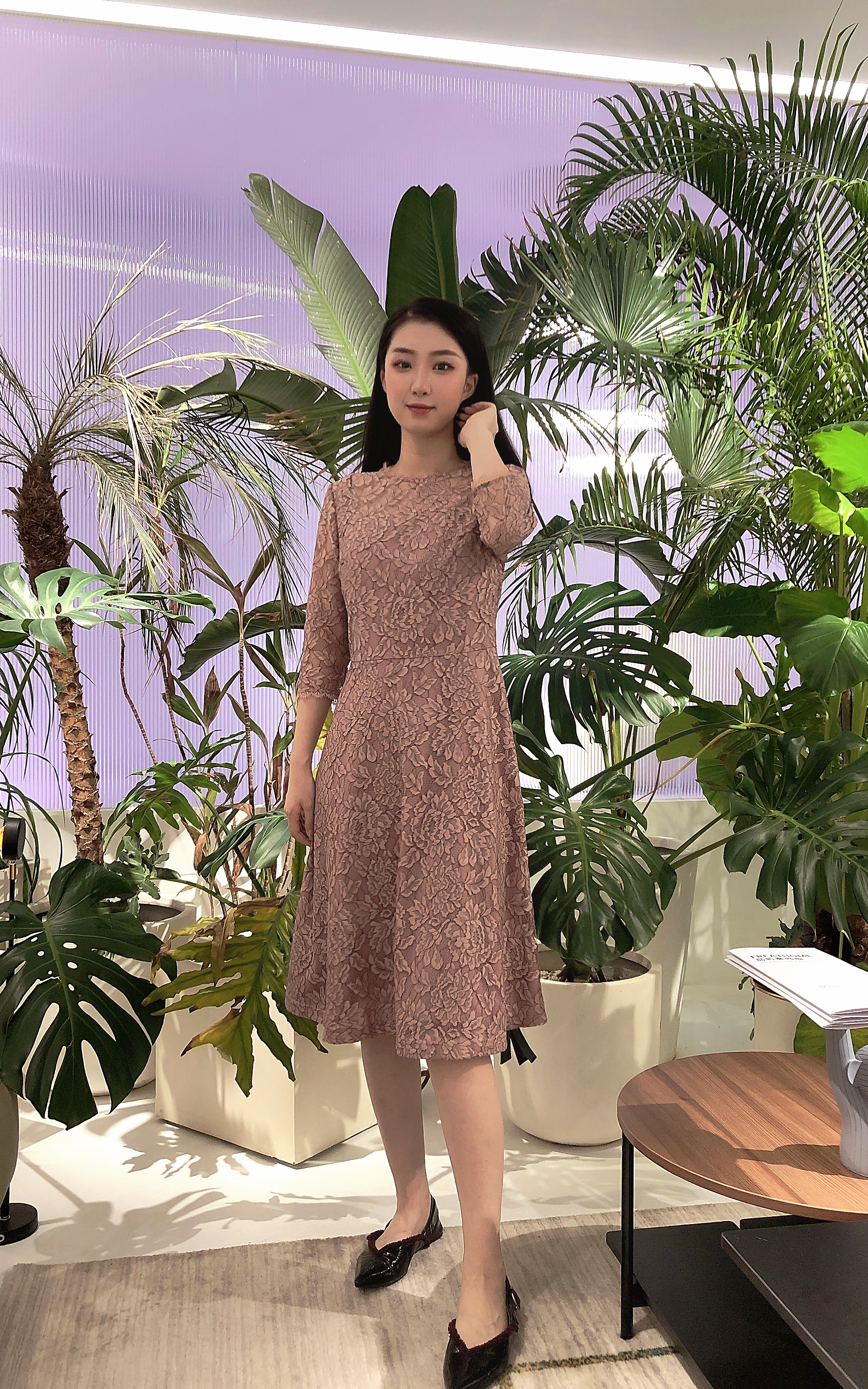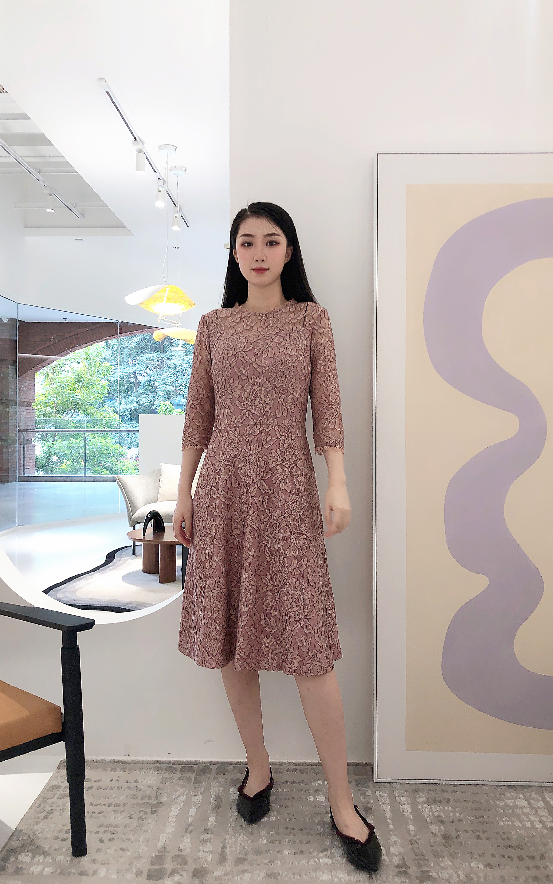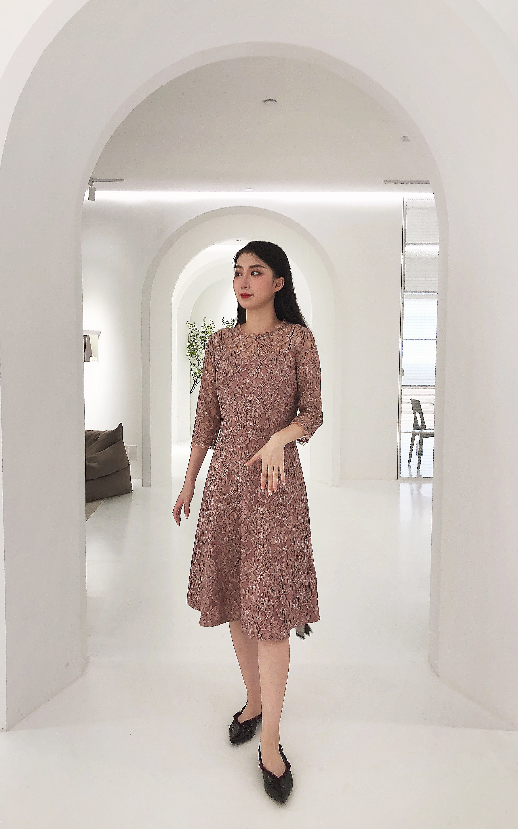 乔万尼春季蕾丝高腰修身气质名媛淑女长袖连衣裙EB3E228