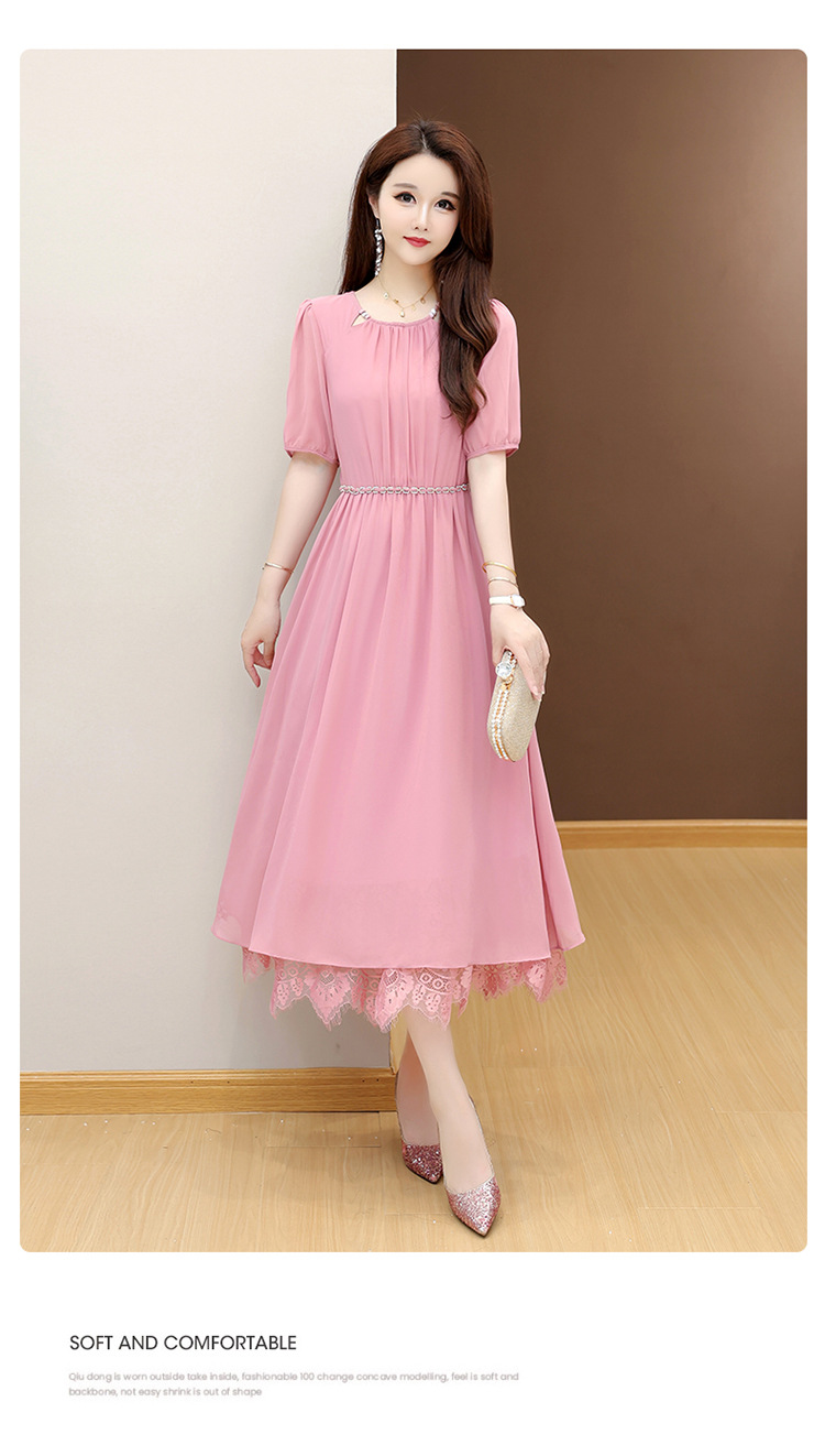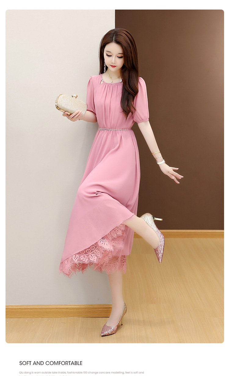 QYM 25X9532-Y雪纺连衣裙百褶裙时尚拼结蕾丝下摆中长裙 商品图0