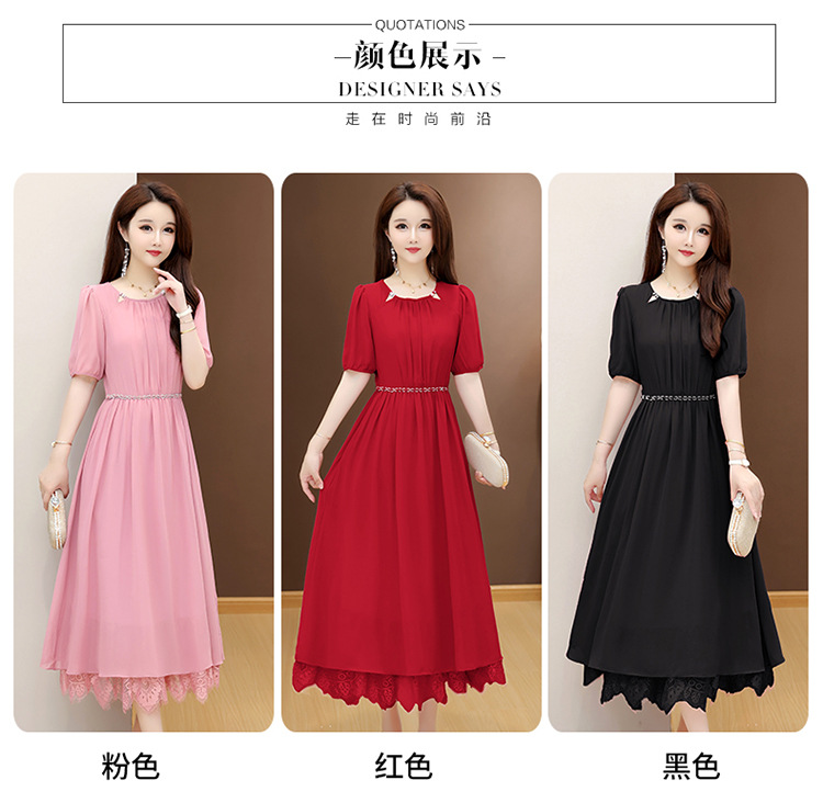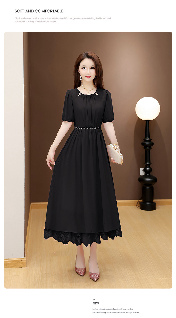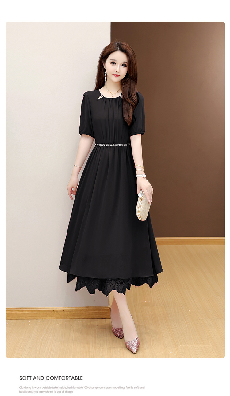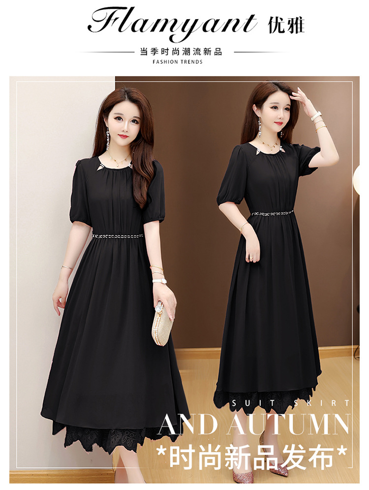 QYM 25X9532-Y雪纺连衣裙百褶裙时尚拼结蕾丝下摆中长裙 商品图1
