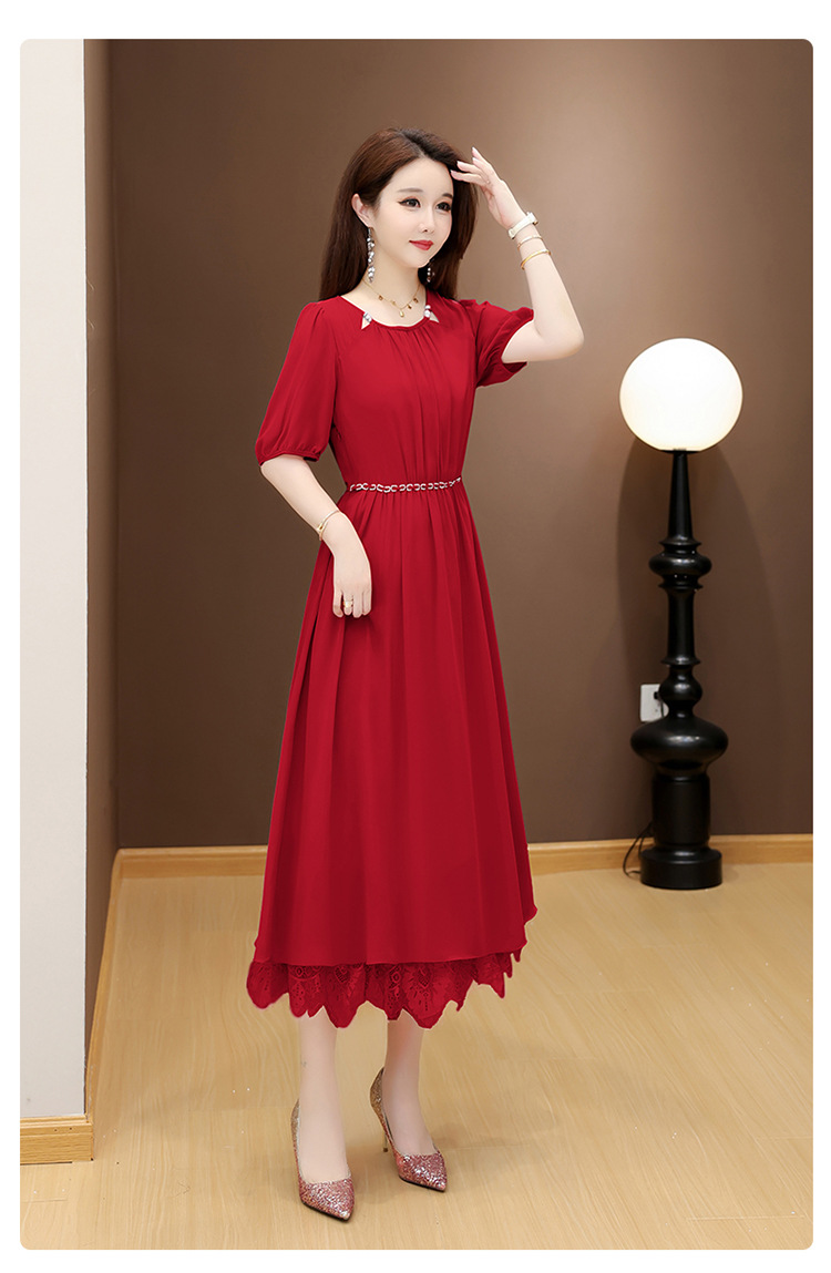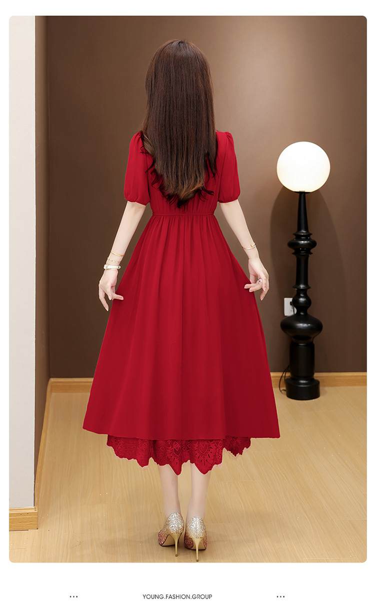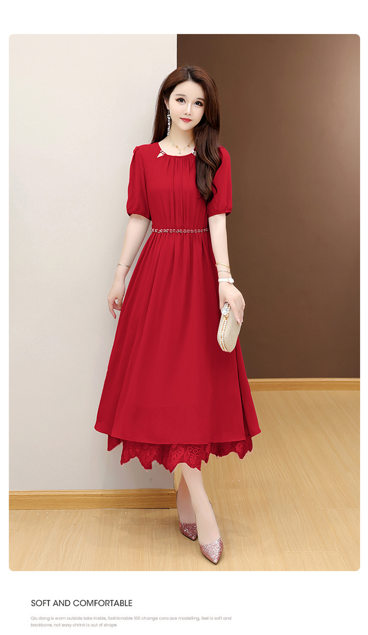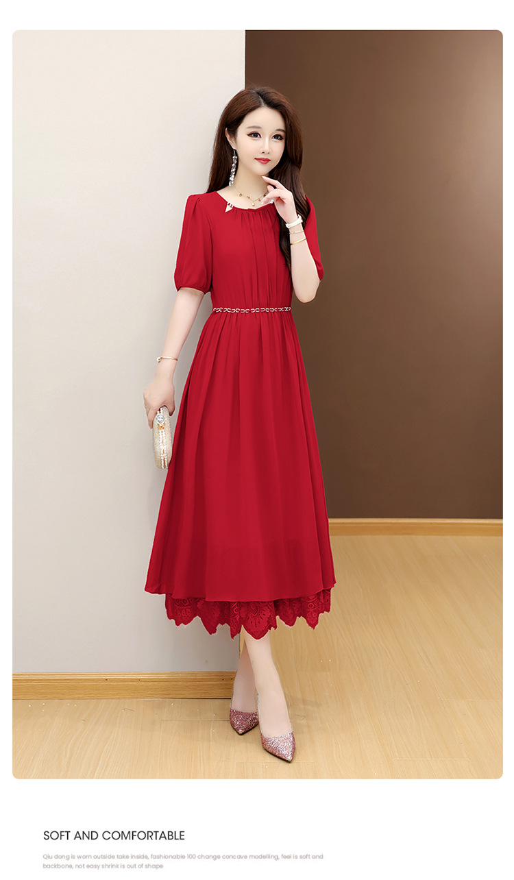 QYM 25X9532-Y雪纺连衣裙百褶裙时尚拼结蕾丝下摆中长裙 商品图1