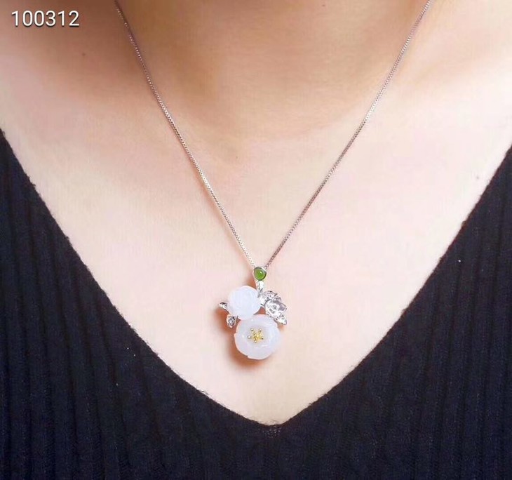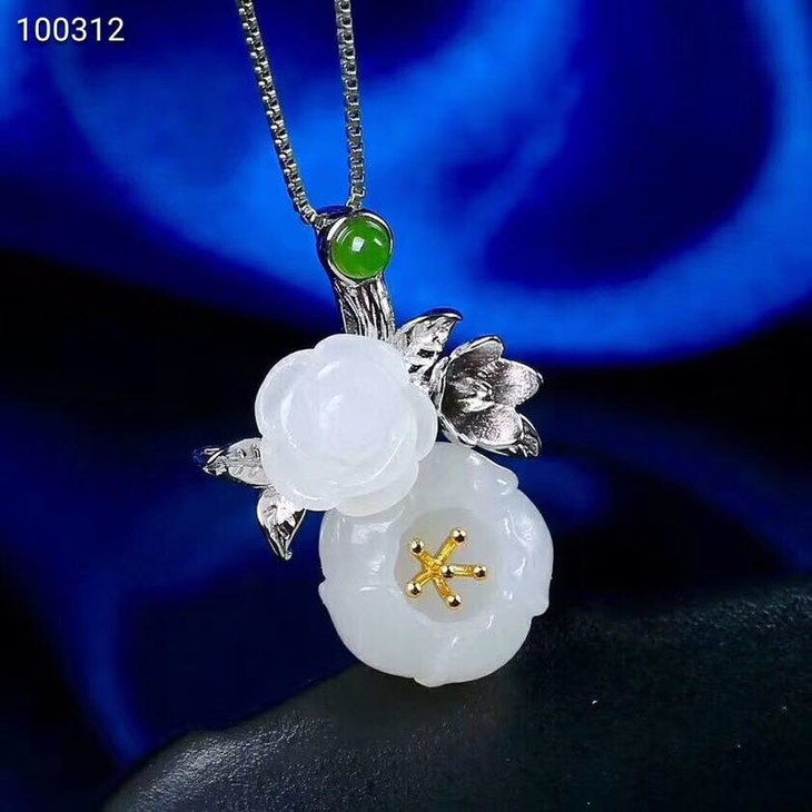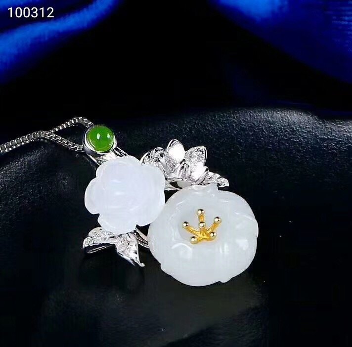s925银镶和田玉玫瑰花吊坠,玉质干净细腻,白度一级,裸石尺寸10x14mm,带银链子。