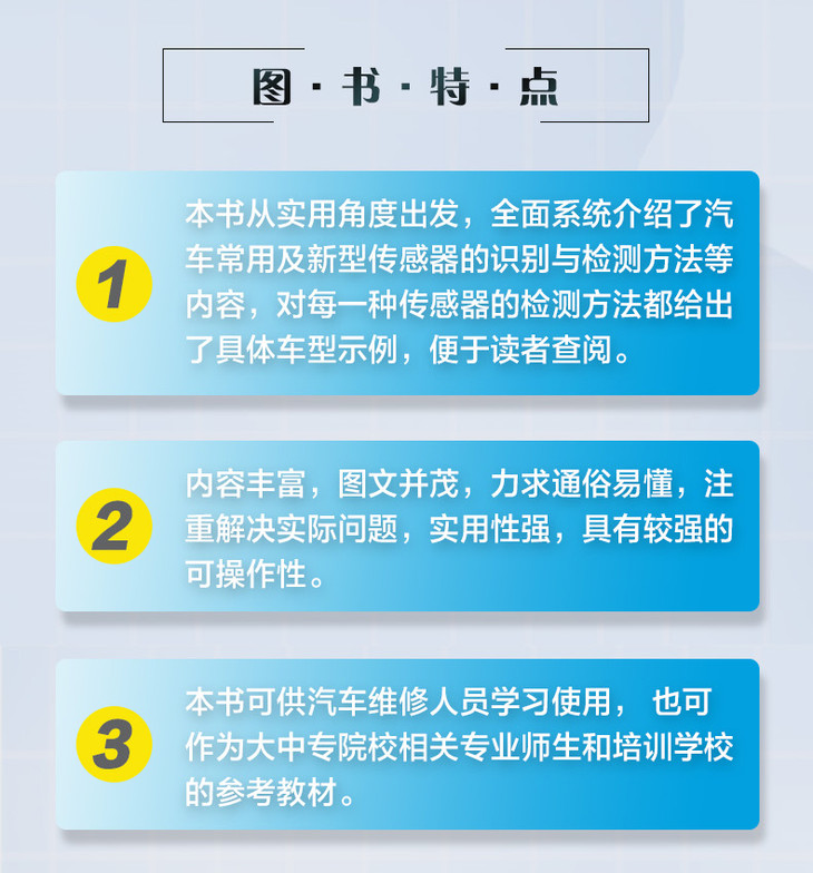 本书从实用角度出发,全面系统地介绍了汽车常用及新型传感器的识别与检测方法等内容。