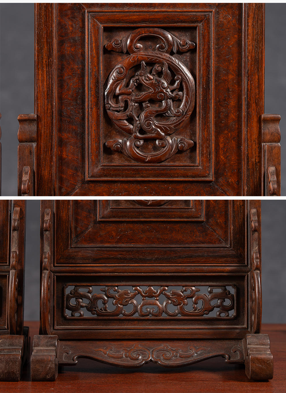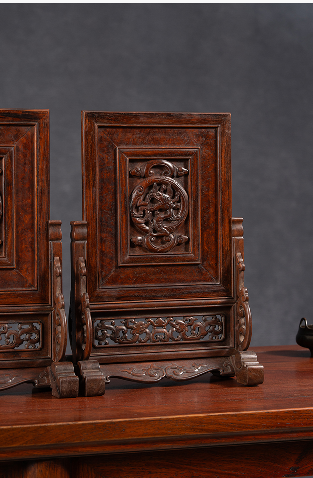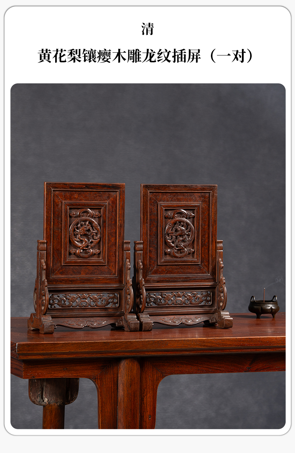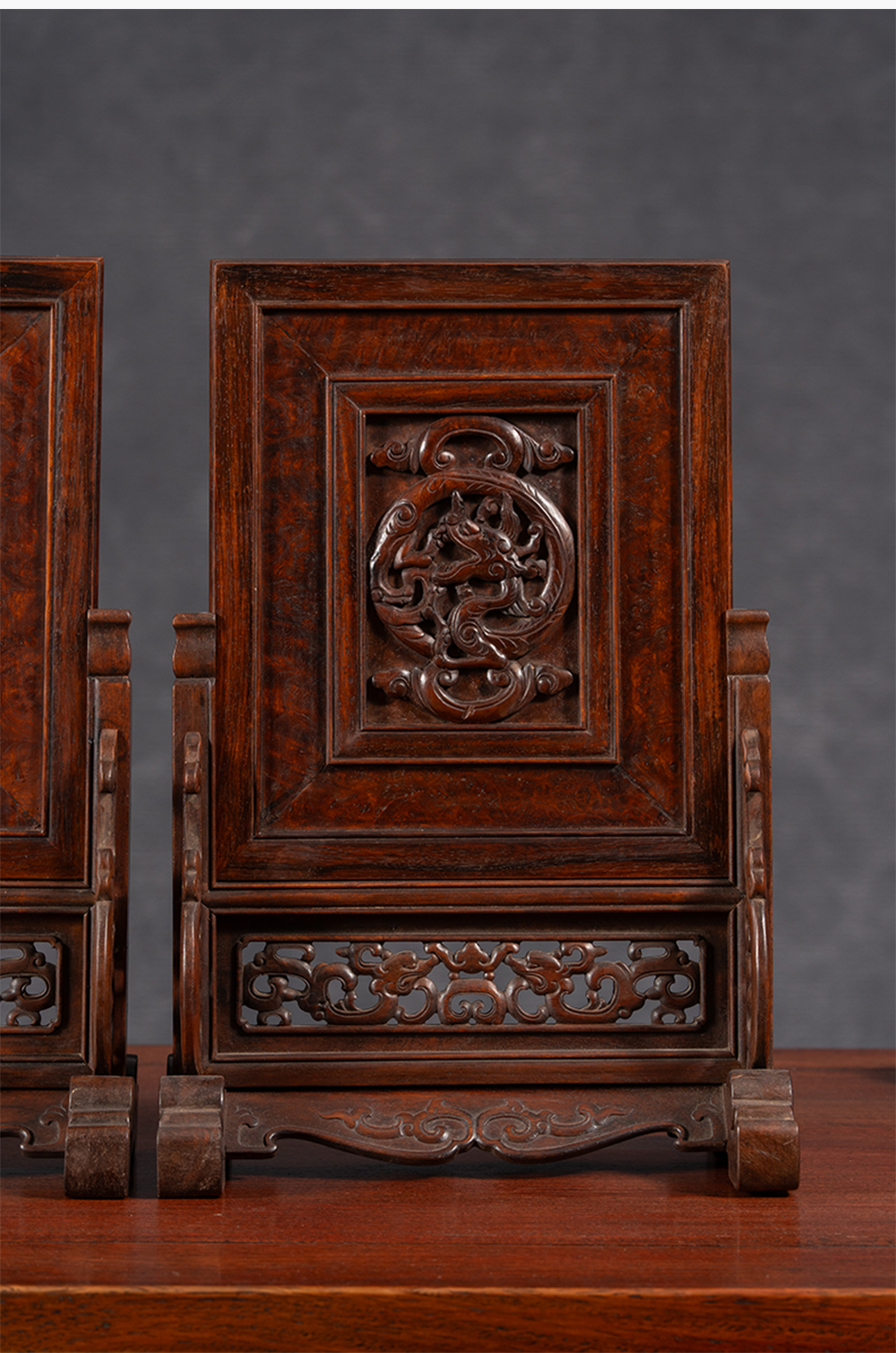 清 黄花梨镶瘿木雕龙纹插屏(一对)