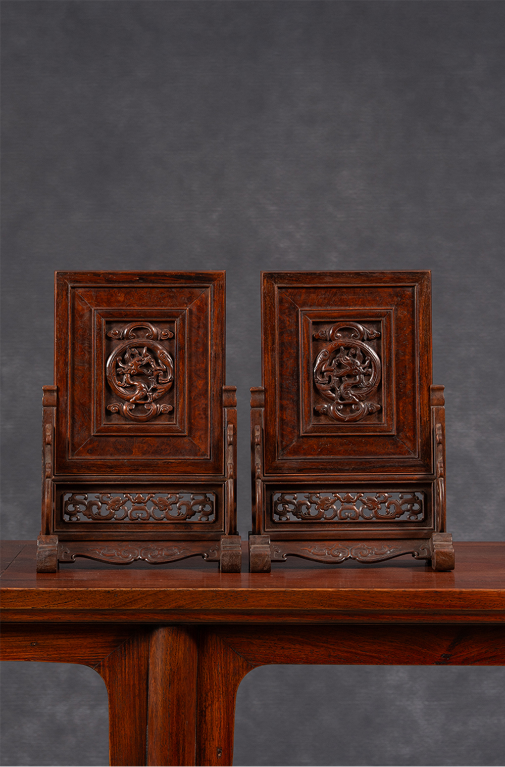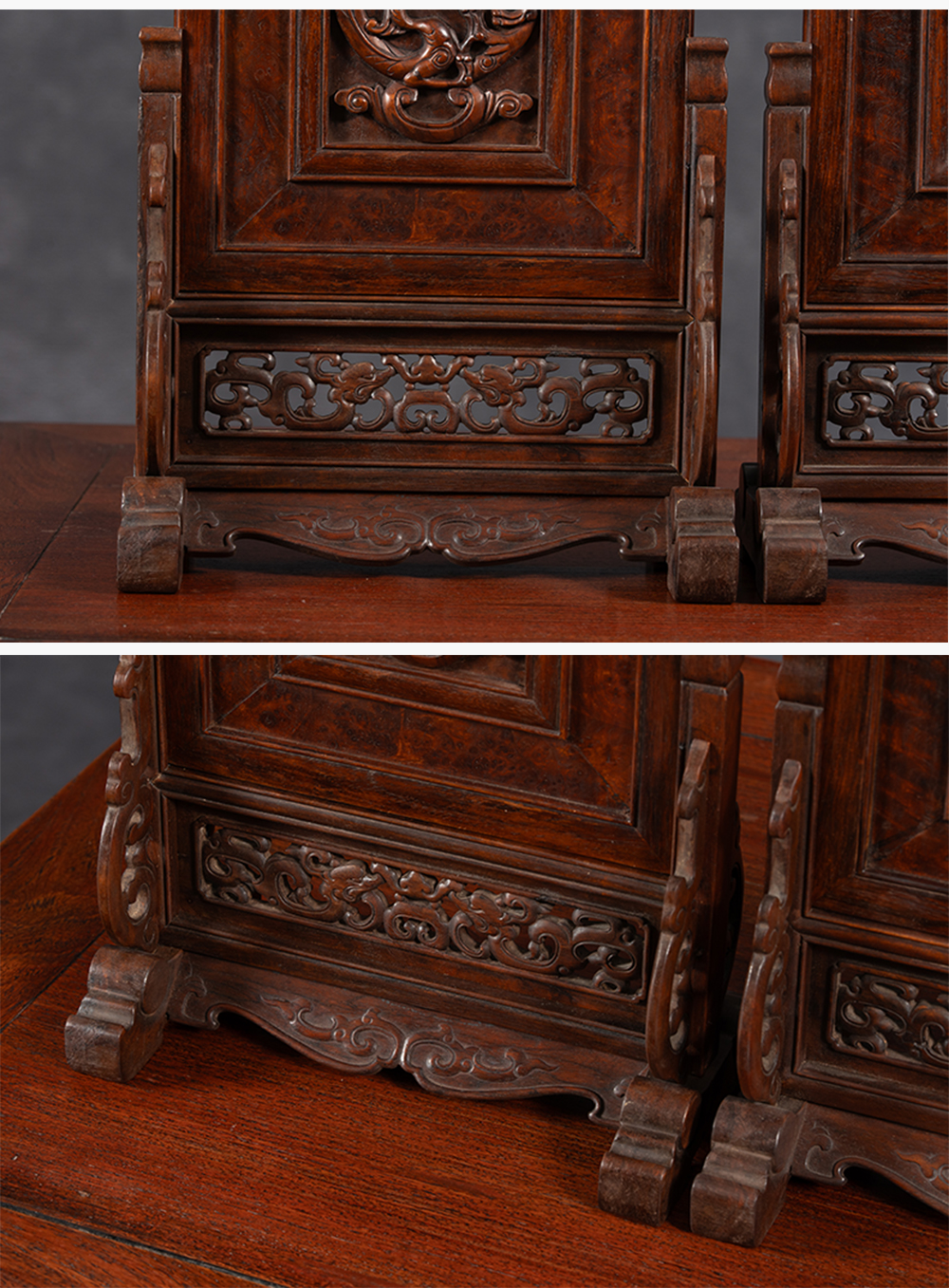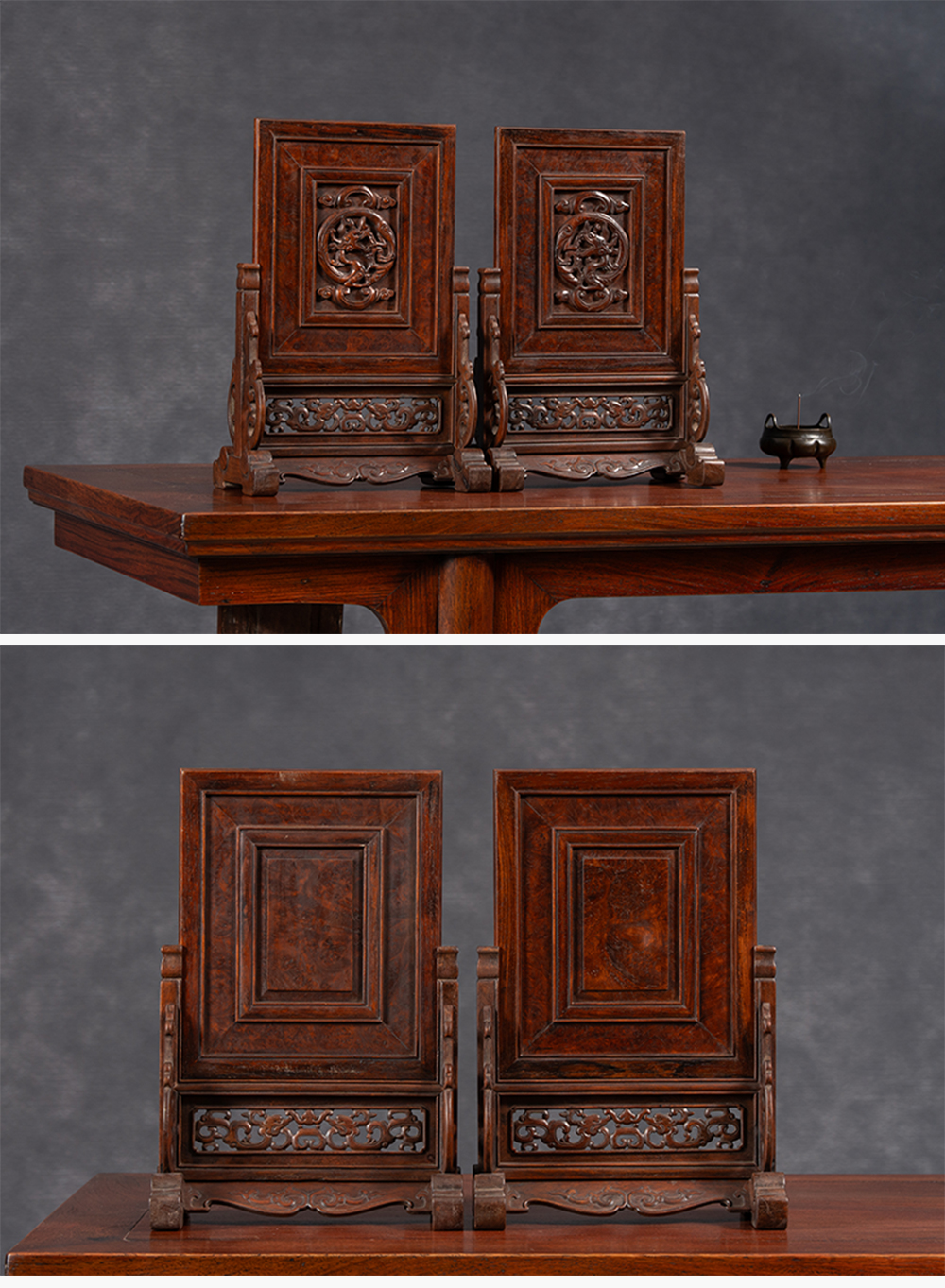 清 黄花梨镶瘿木雕龙纹插屏(一对)