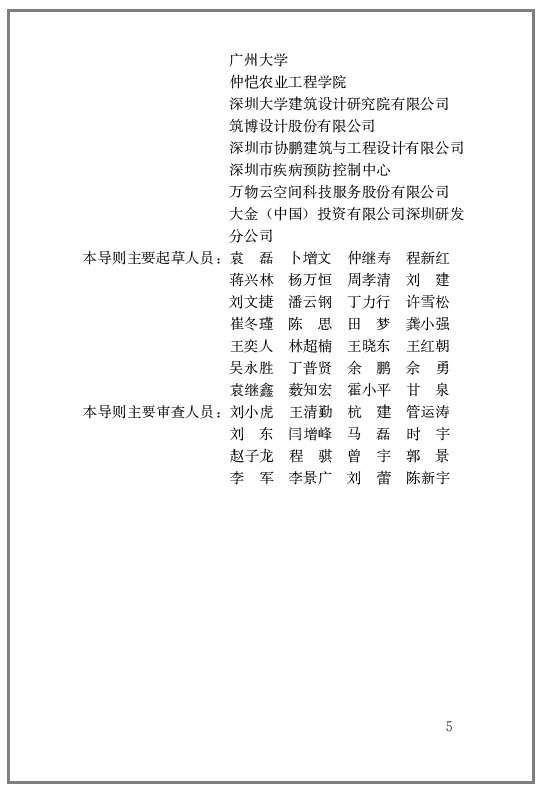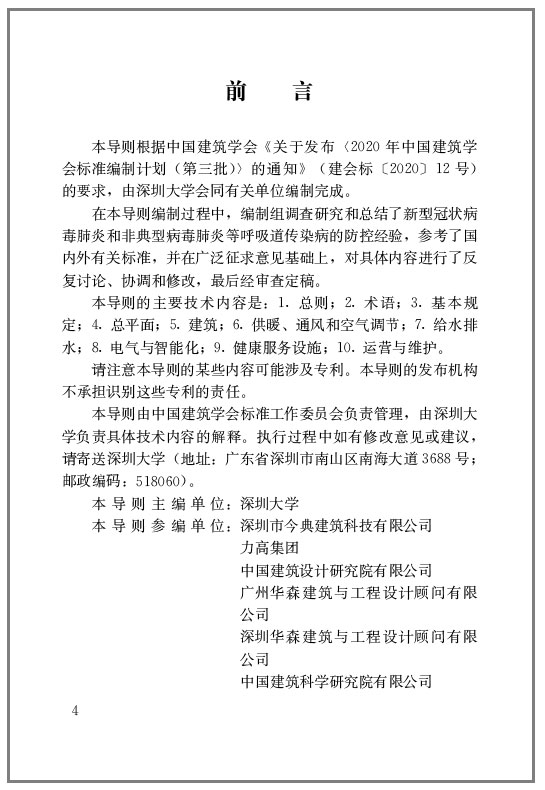 本导则根据中国建筑学会《关于发布<2020年中国建筑学会标准编制计划(第三批)>的通知》(建会标〔2020〕12号)的要求,由深圳大学会同有关单位编制完成。 在本导则编制过程中,编制组调查研究和总结了新型冠状病毒肺炎和非典型病毒肺炎等呼吸道传染病的防控经验,参考了国内外有关标准,并在广泛征求意见基础上,对具体内容进行了反复讨论、协调和修改,最后经审查定稿。 本导则的主要技术内容是:总则,术语,基本规定,总平面,建筑,供暖、通风和空气调节,给水排水,电气与智能化,健康服务设施,运营与维护。