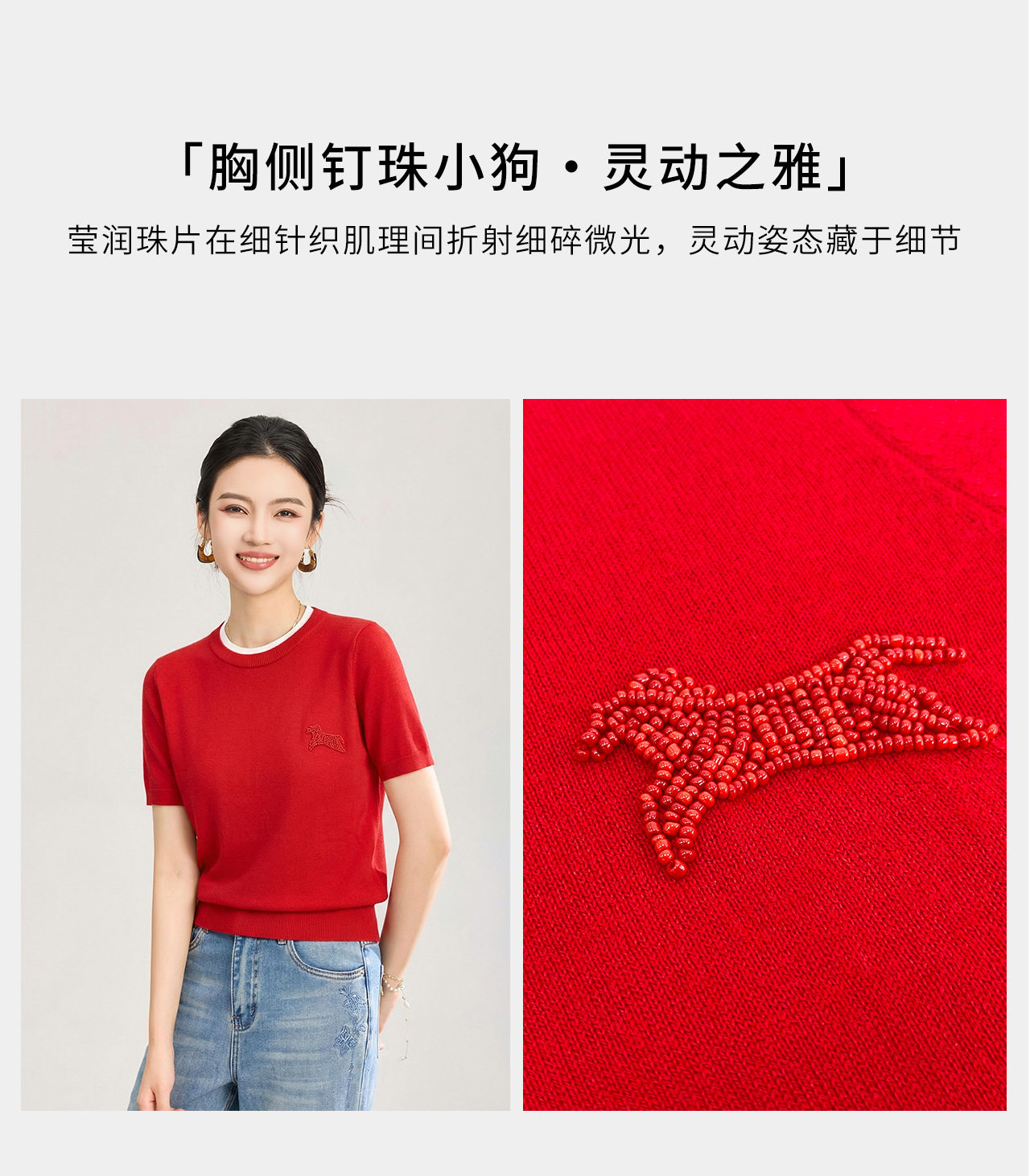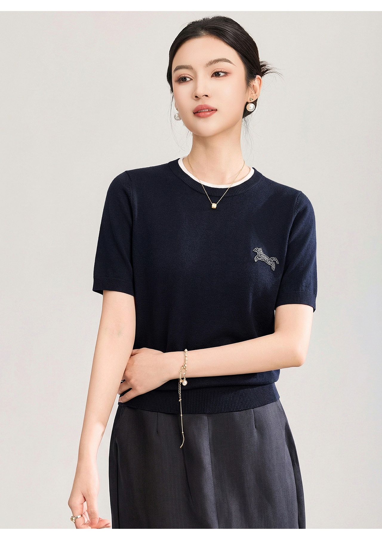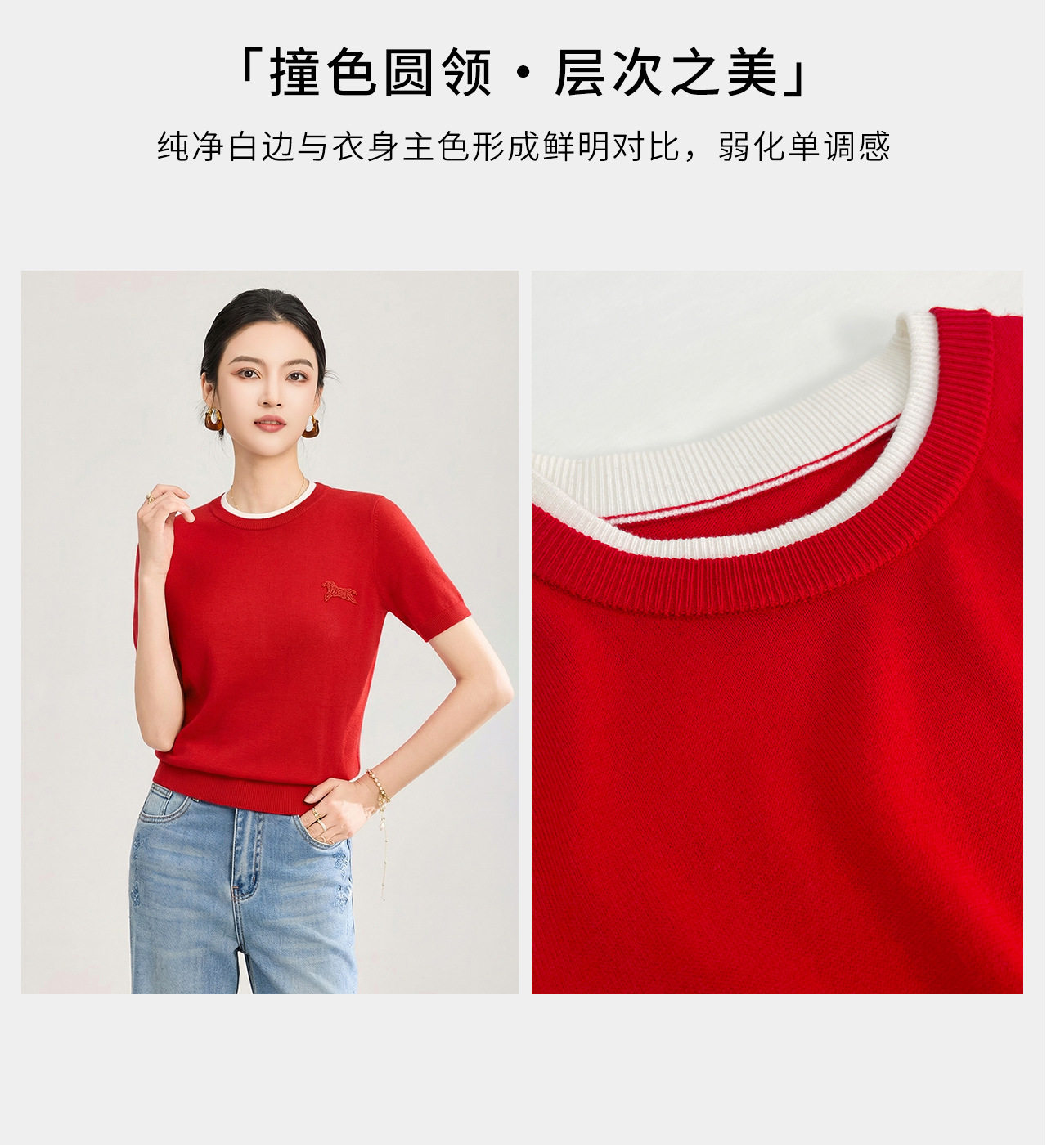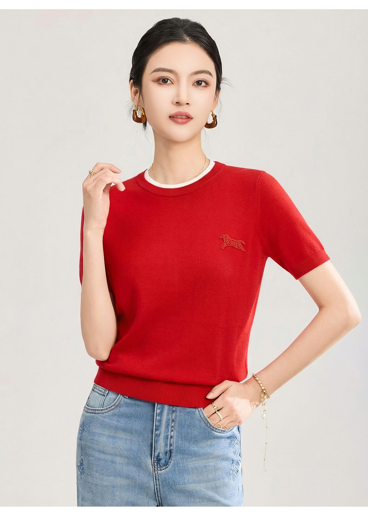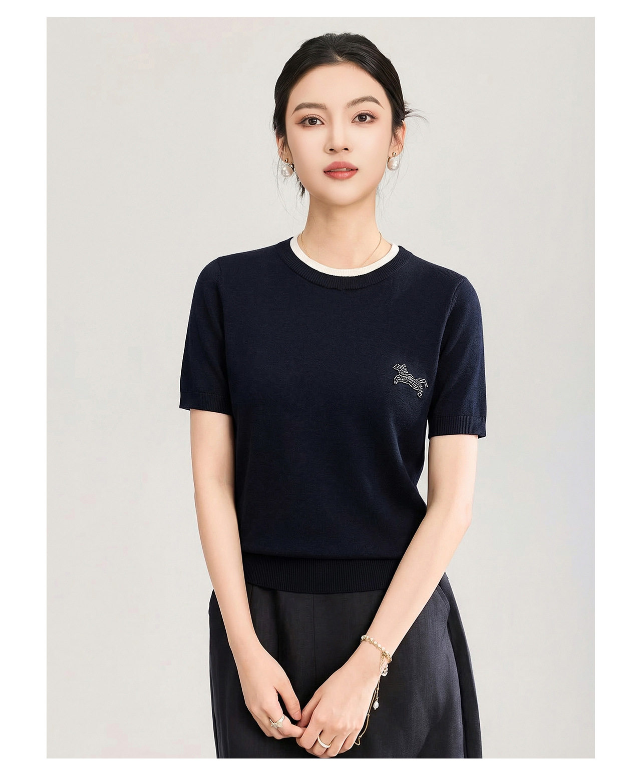 「高货wl」全新升级【铂金会员174/天猫229/差价55】(02328)洛诗琳美丽诺羊毛假两件针织T恤2026春夏小马钉珠短袖上衣