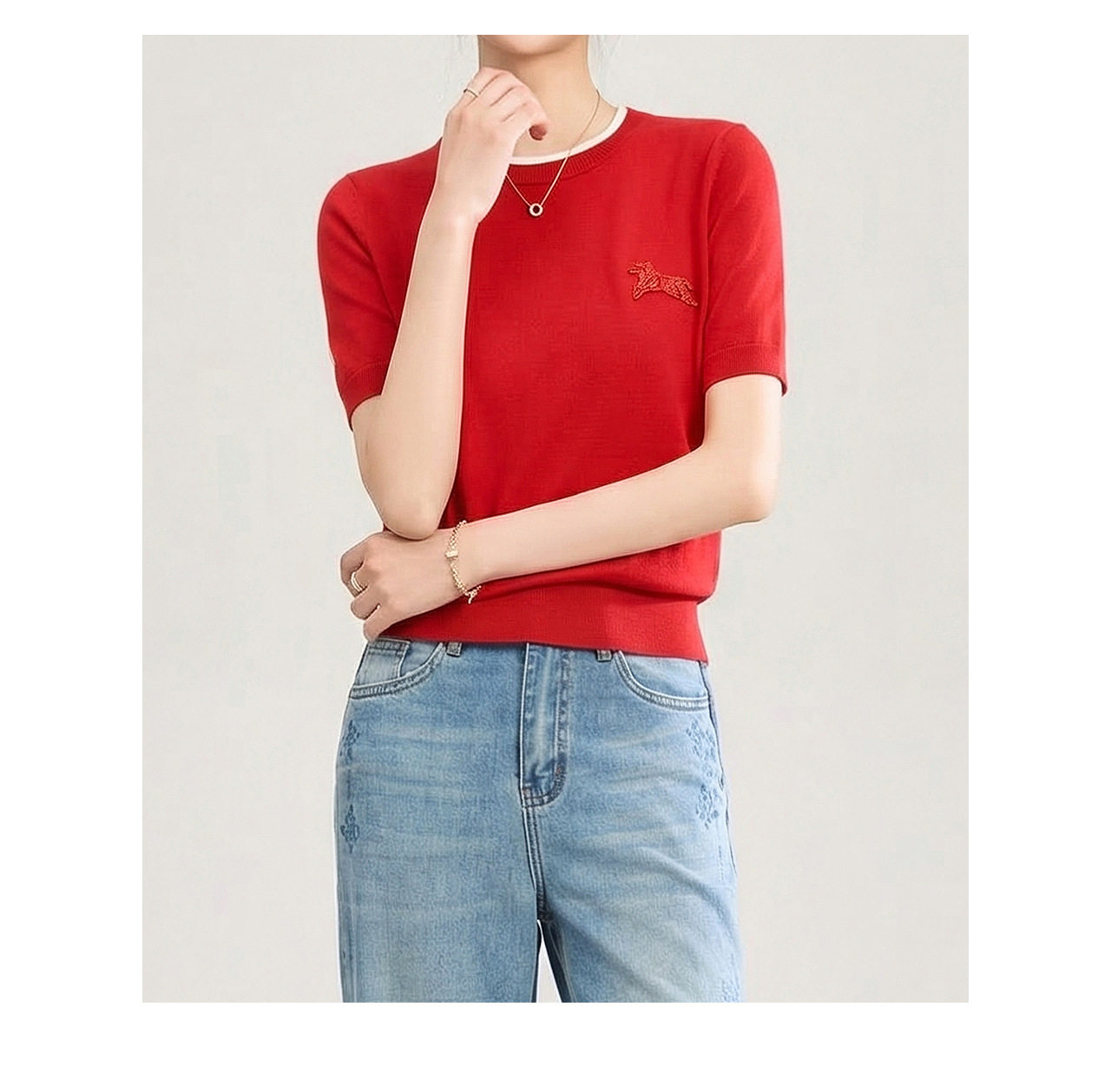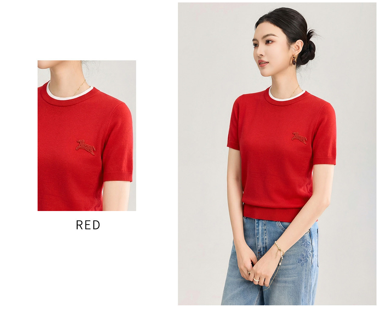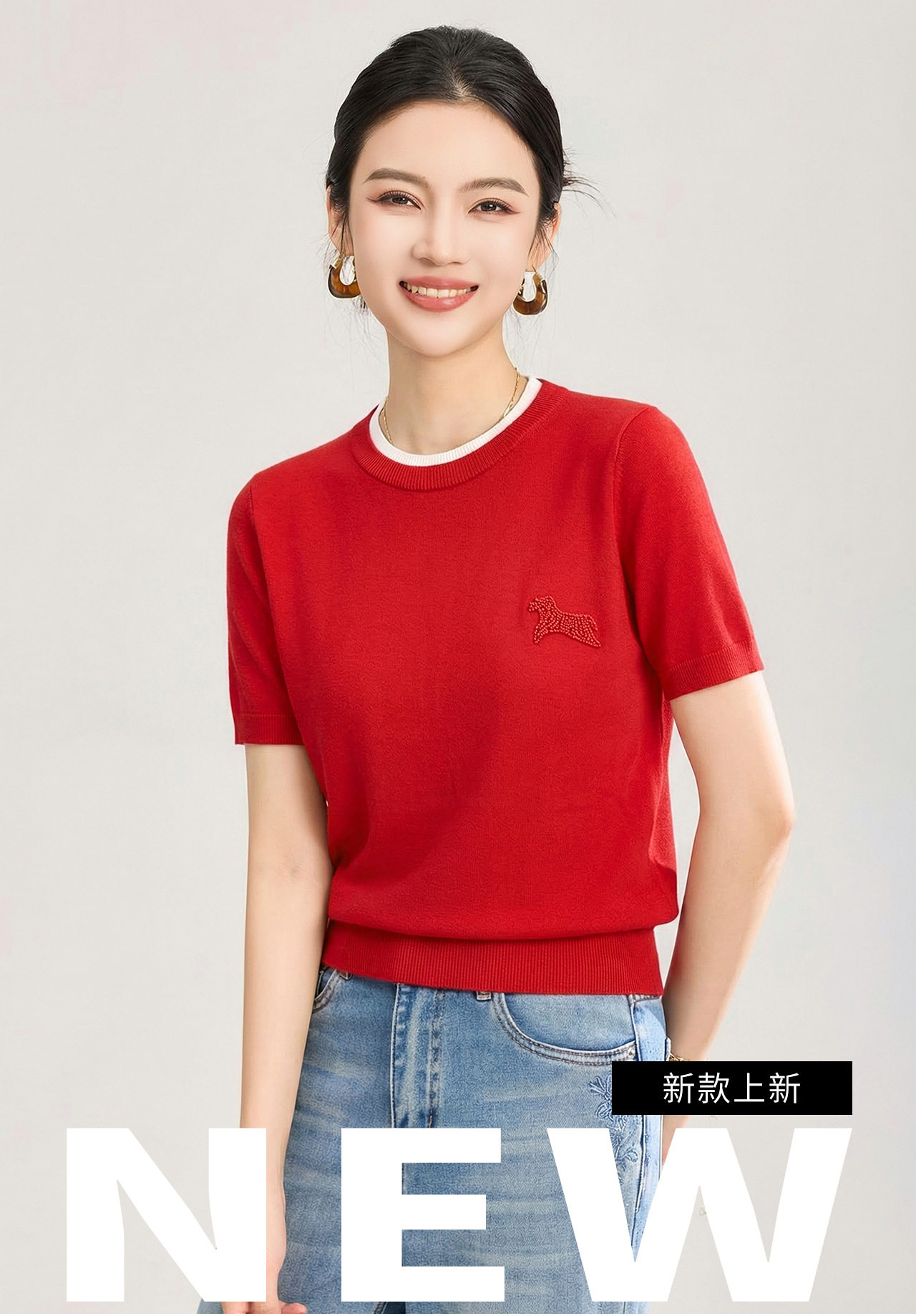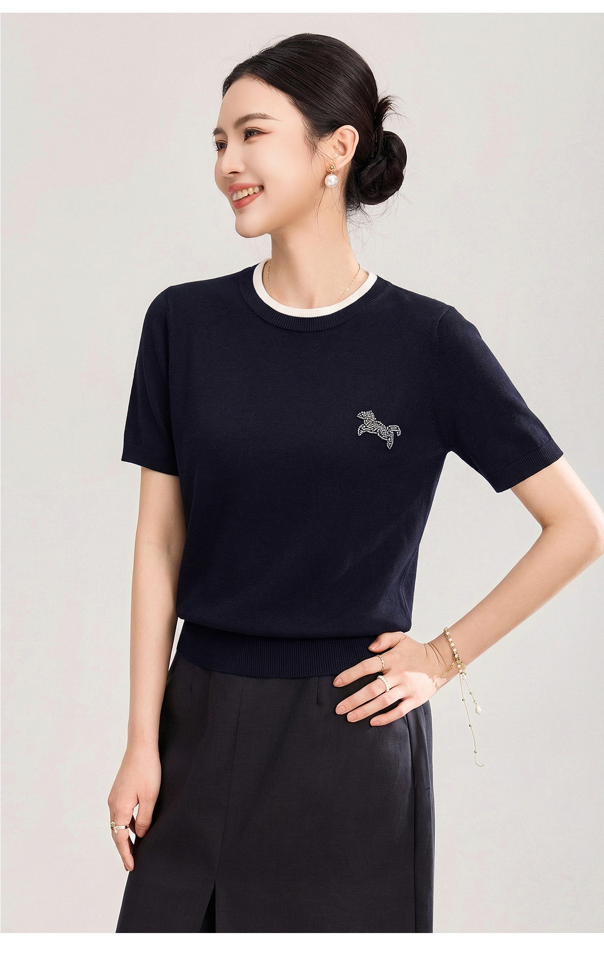 「高货wl」全新升级【铂金会员174/天猫229/差价55】(02328)洛诗琳美丽诺羊毛假两件针织T恤2026春夏小马钉珠短袖上衣