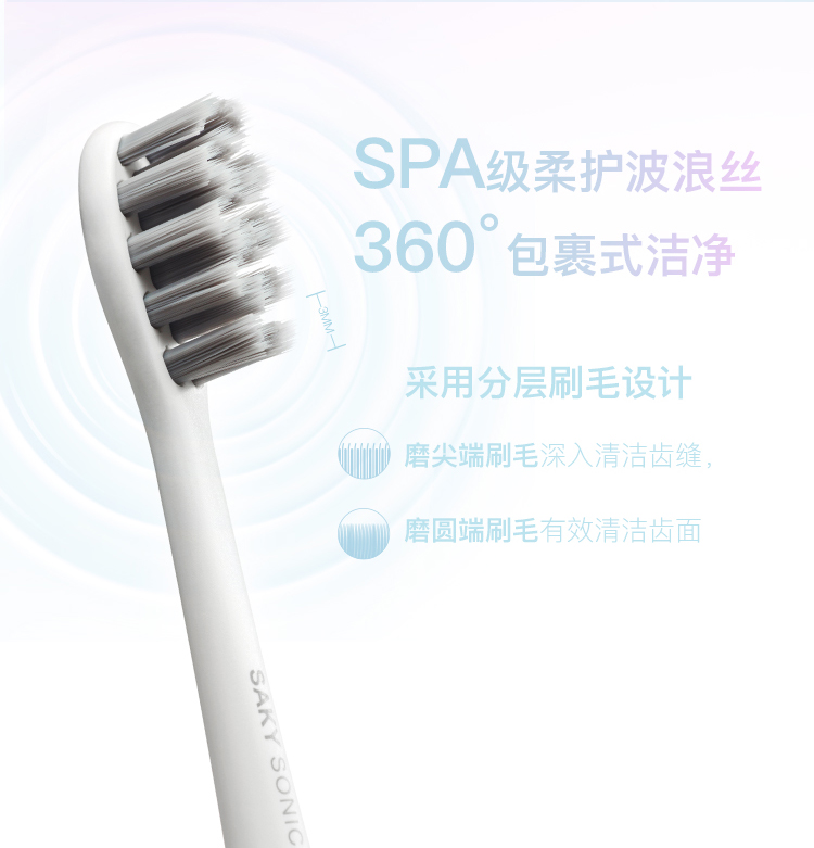 ▲E1刷毛——分层刷毛设计,磨尖端深入齿缝。磨圆端清洁表面