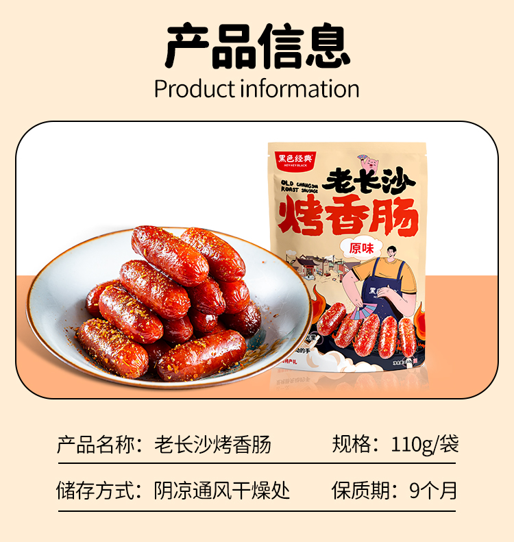 【小吃零食】黑色经典老长沙烤香肠经典原味110g/袋 真实大肉粒 口口爆汁