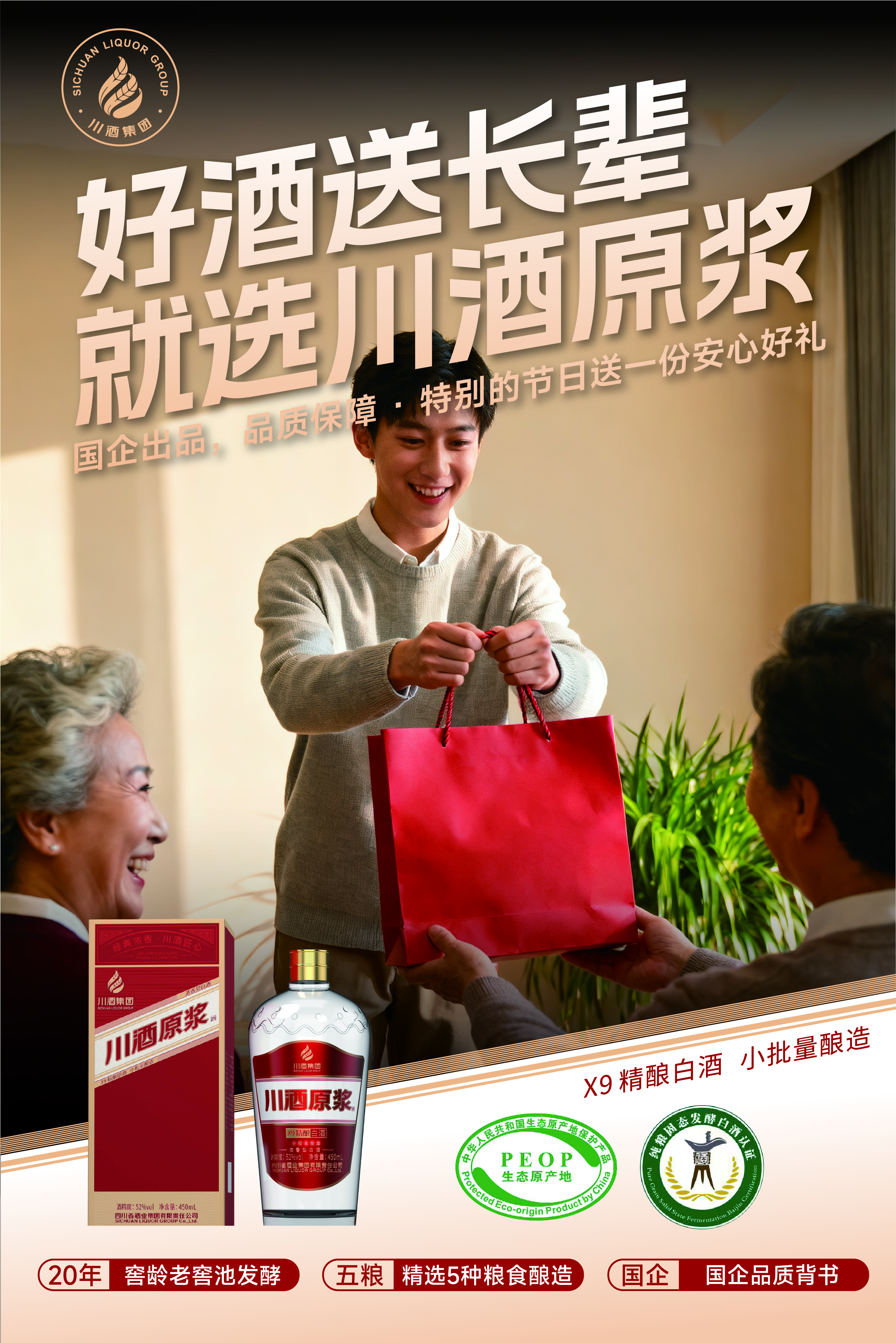 国企名品,<纯粮固态发酵><生态原产地>双标认证,优质基酒,20年老酒调香。
