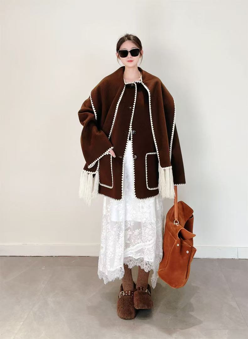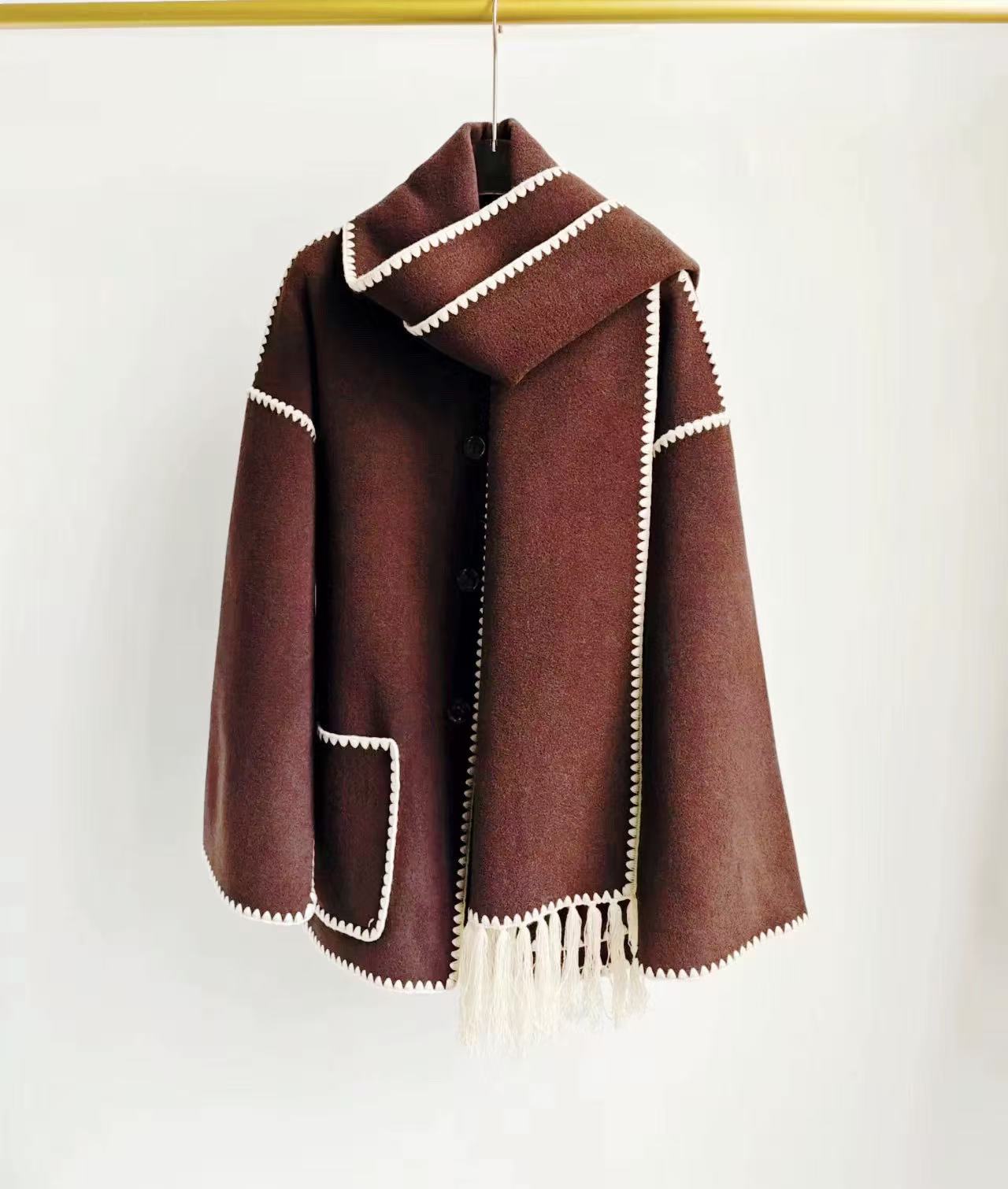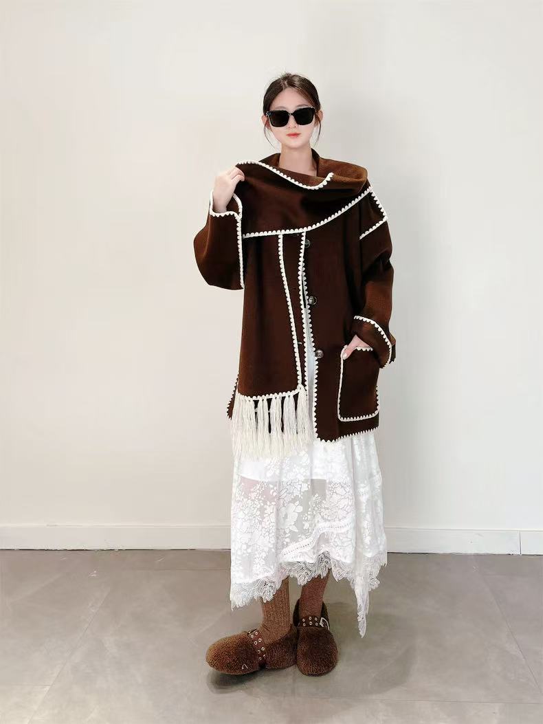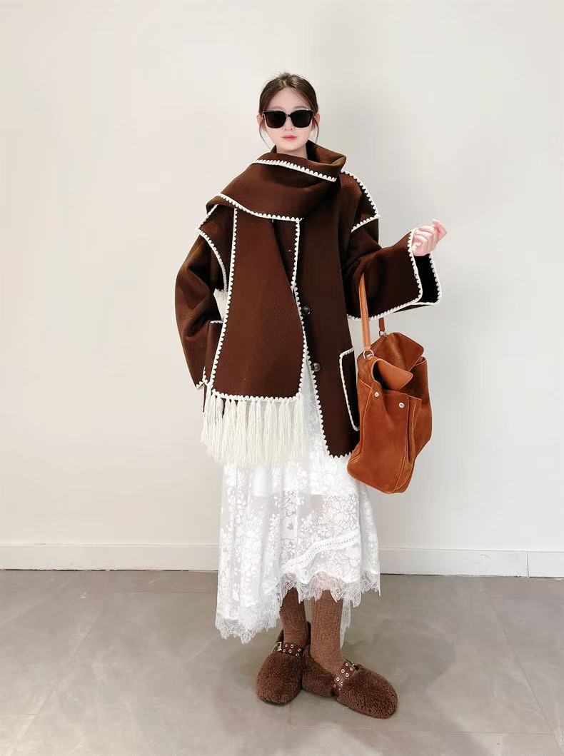 【高端系列】(赠送围巾)手工定制888贝壳绣80%高支澳洲羊毛中长双面尼大衣外套-喜出