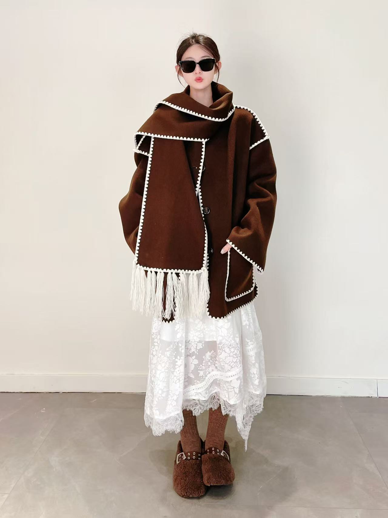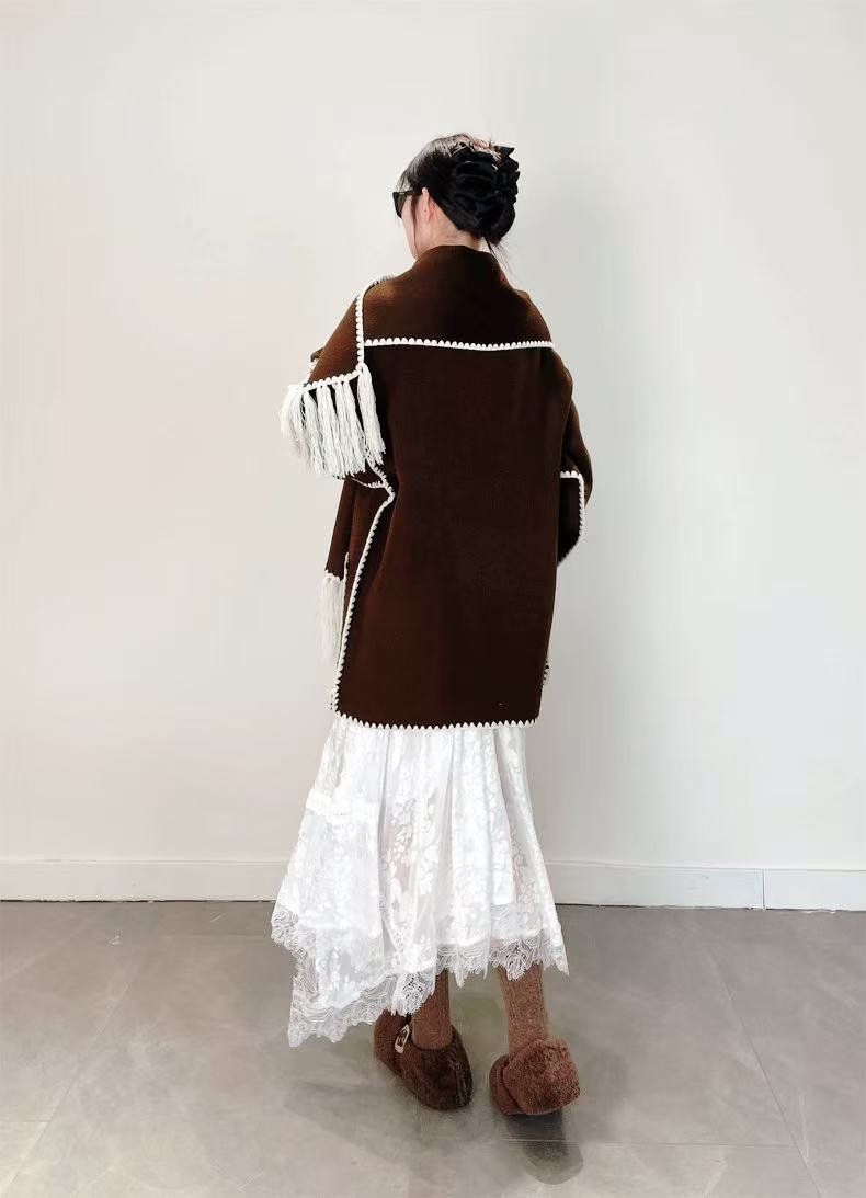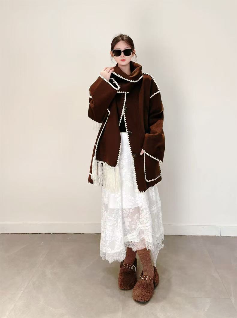 【高端系列】(赠送围巾)手工定制888贝壳绣80%高支澳洲羊毛中长双面尼大衣外套-喜出