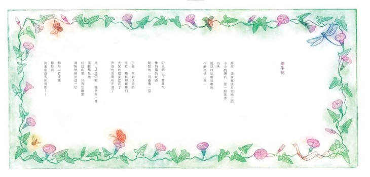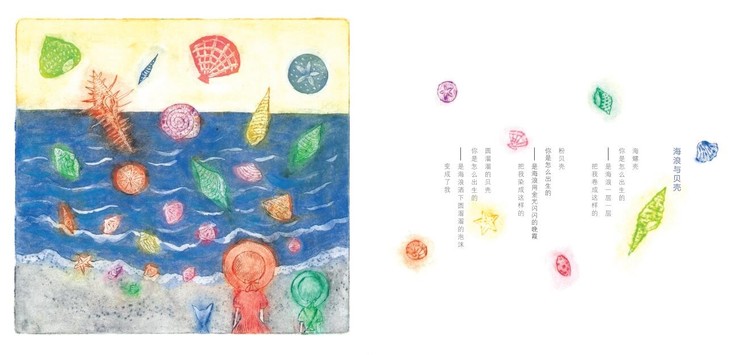 也许可以这么说,只有优秀的童诗才能成就优秀的插图,如果童诗失败了,那么再好的绘画也无法弥补这种裂隙,这也是童诗绘本存在的本真。绘本的形式在于它构造了一个极具诱惑的立场——在短暂庇护儿童心灵的同时,也在铺展未来可供塑造他们的东西,比如色彩、线条、故事中释放出来的语言奇迹等。