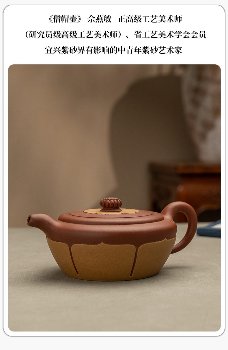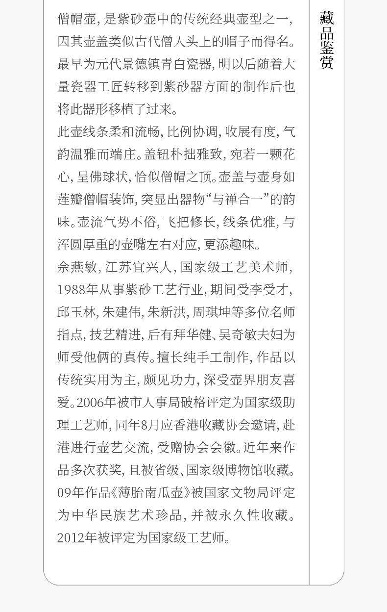 《僧帽壶》 佘燕敏 正高级工艺美术师(研究员级高级工艺美术师)、省工艺美术学会会员、宜兴紫砂界有影响的中青年紫砂艺术家