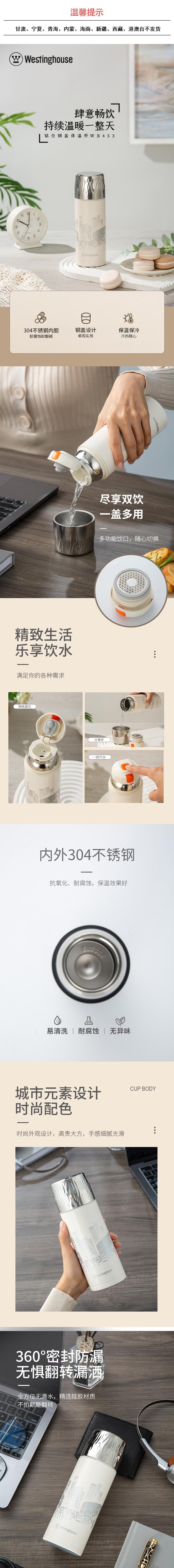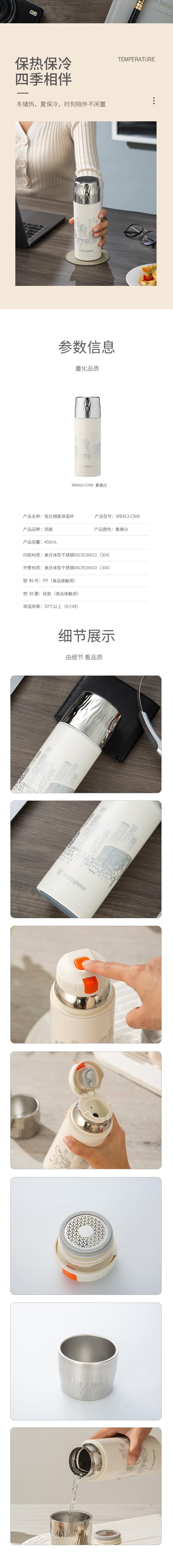 西屋 铭仕钢盖保温杯素雅白450mL WB453-CNW