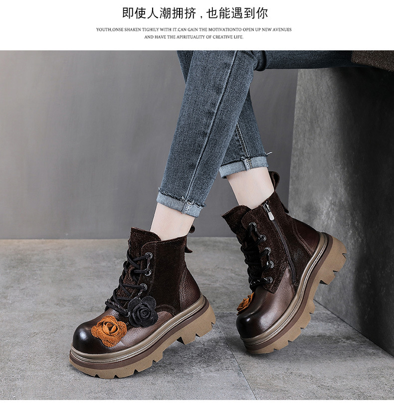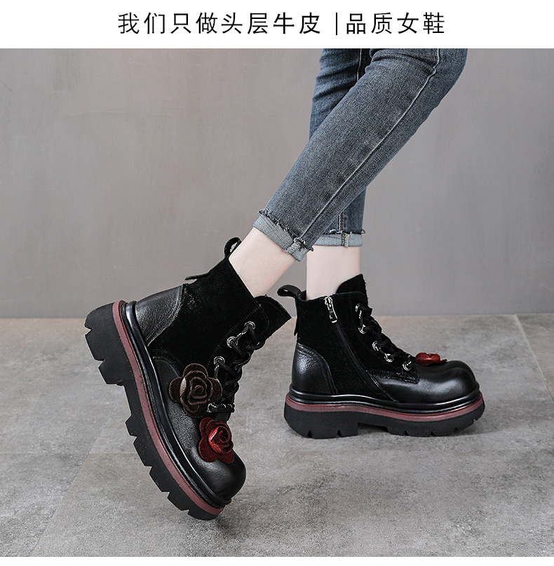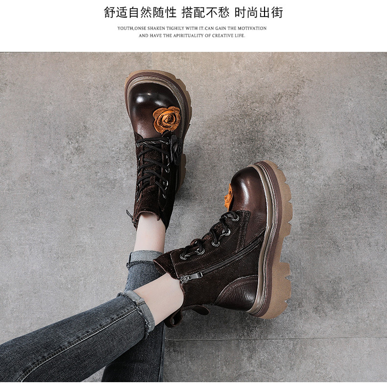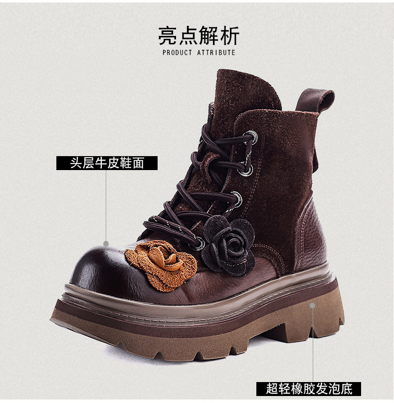 YR 2956头层牛皮复古厚底马丁靴花朵短靴厚底休闲高帮靴 商品图0
