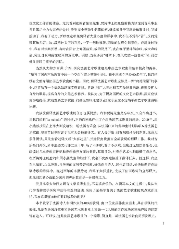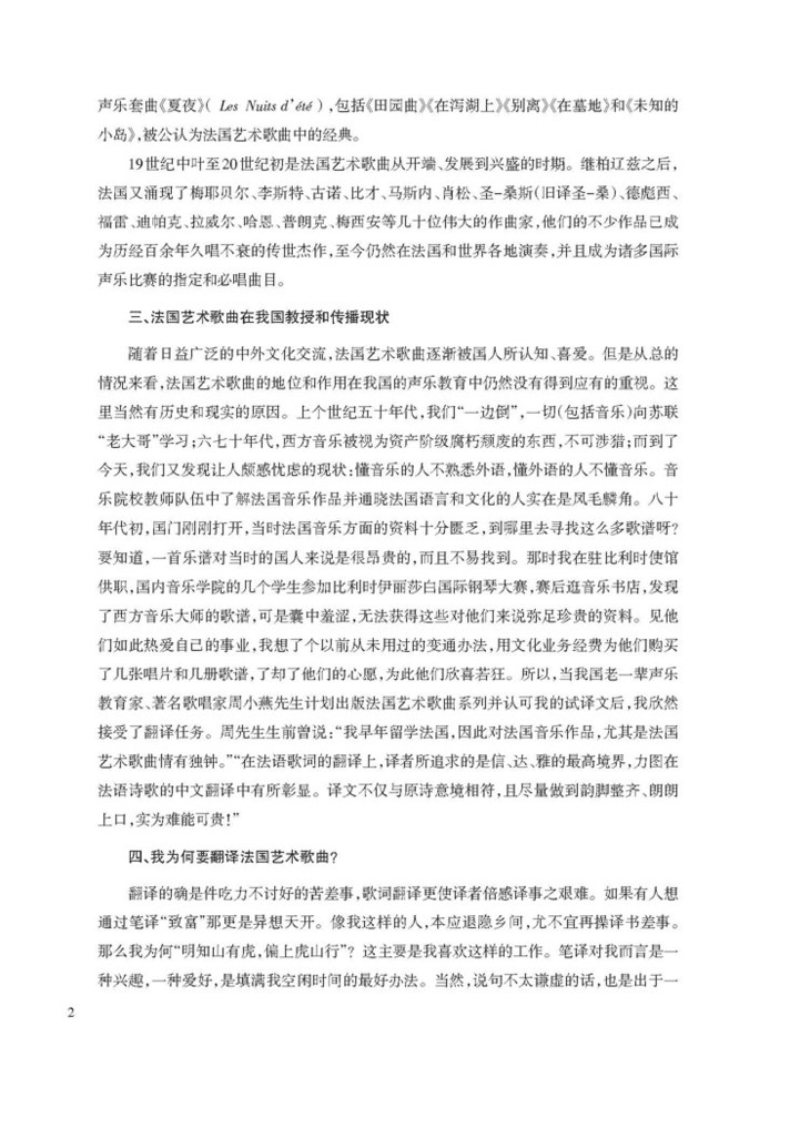我早年留学法国,因此对法国音乐作品,尤其是法国艺术歌曲情有独钟。新中国成立已经60多年了,我们还没有完整介绍法国艺术歌曲的书籍。在我有生之年终能看到这样一部著作在国内出版,深感欣慰!选编、翻译法国艺术歌曲应该是一种“功德无量”的事,历史将证明这一工作的重要意义。