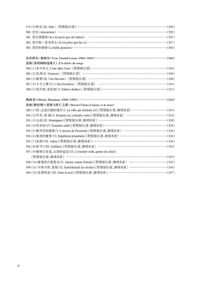 《法国艺术歌曲400首》(一至四册)由我国著名声乐家施恒先生、贾涛博士选编,由中华人民共和国文化部资深法语专家陈伯祥教授担当译词工作,全书由歌词原文、字对字译词、中文译文、电子乐谱、示范演唱构成。不仅是法国艺术歌曲的一个缩影,也是一部法国艺术歌曲简明发展史。