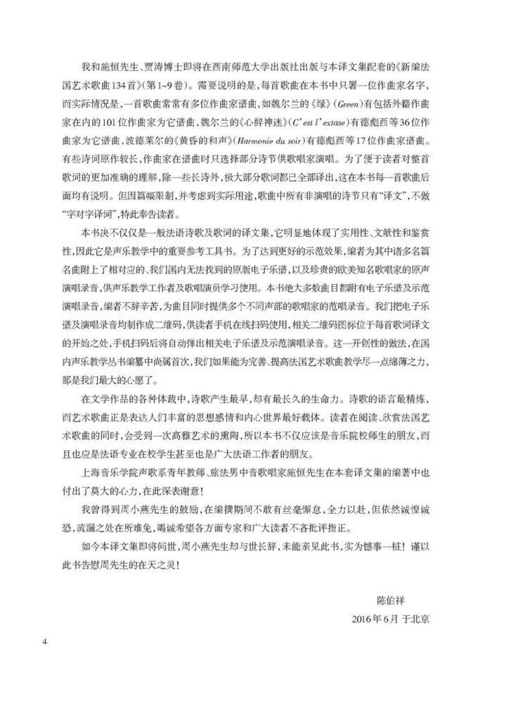收到先生的译稿后,我仔细拜读了您的每一篇译文,真是感叹万分!我既赞叹译文,更钦佩先生严谨治学的精神,在当今华语国家及地区,罕有他人企及,可歌可赞!最感欣慰的是,我能协助先生完成大部头的《法国艺术歌曲400首》译作,忘年之交,学界幸事,实乃三生有幸!