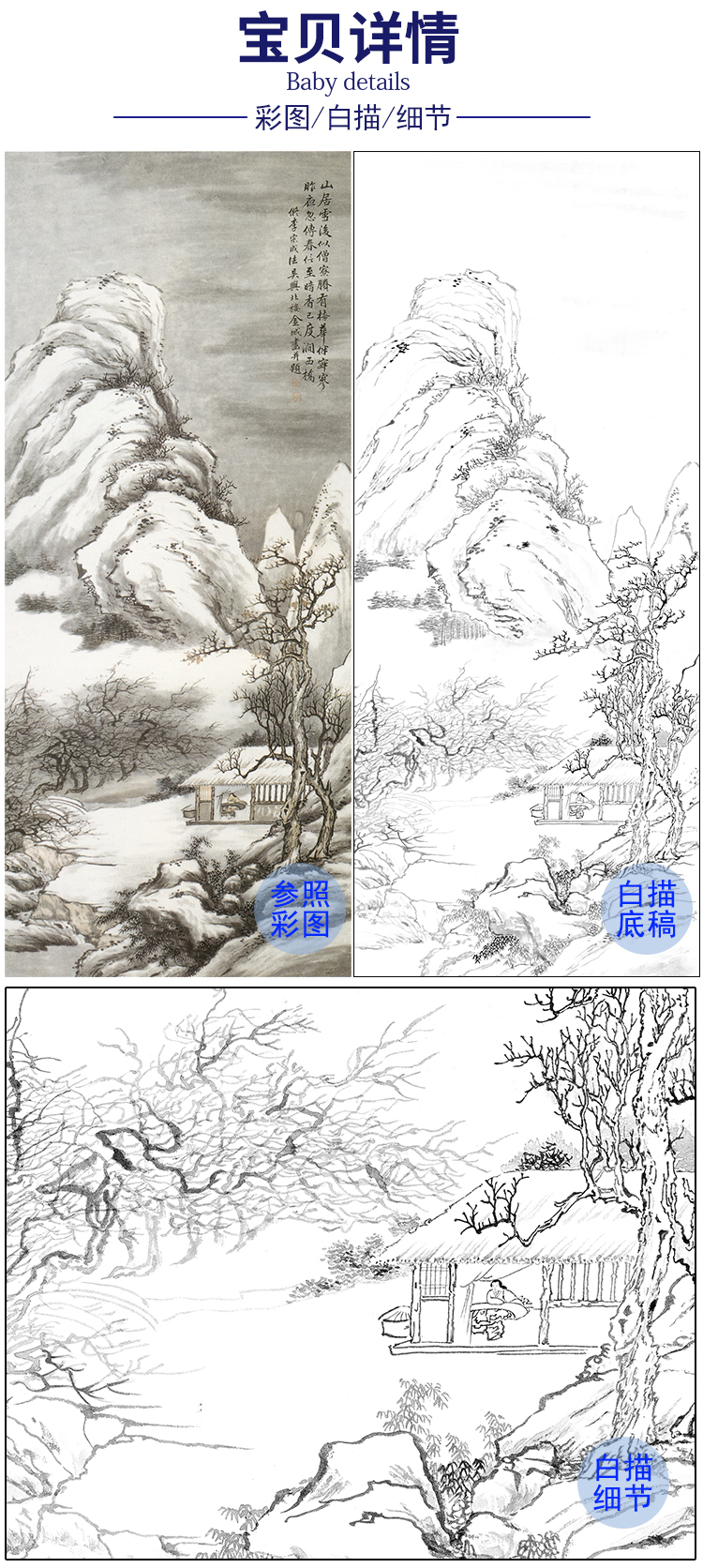 竖幅工笔山水人物白描底稿-金城-《山居雪后图》-多种白描尺寸可选-JS11