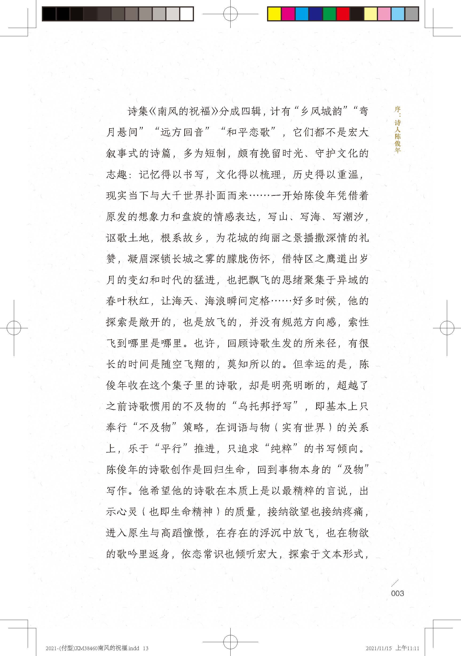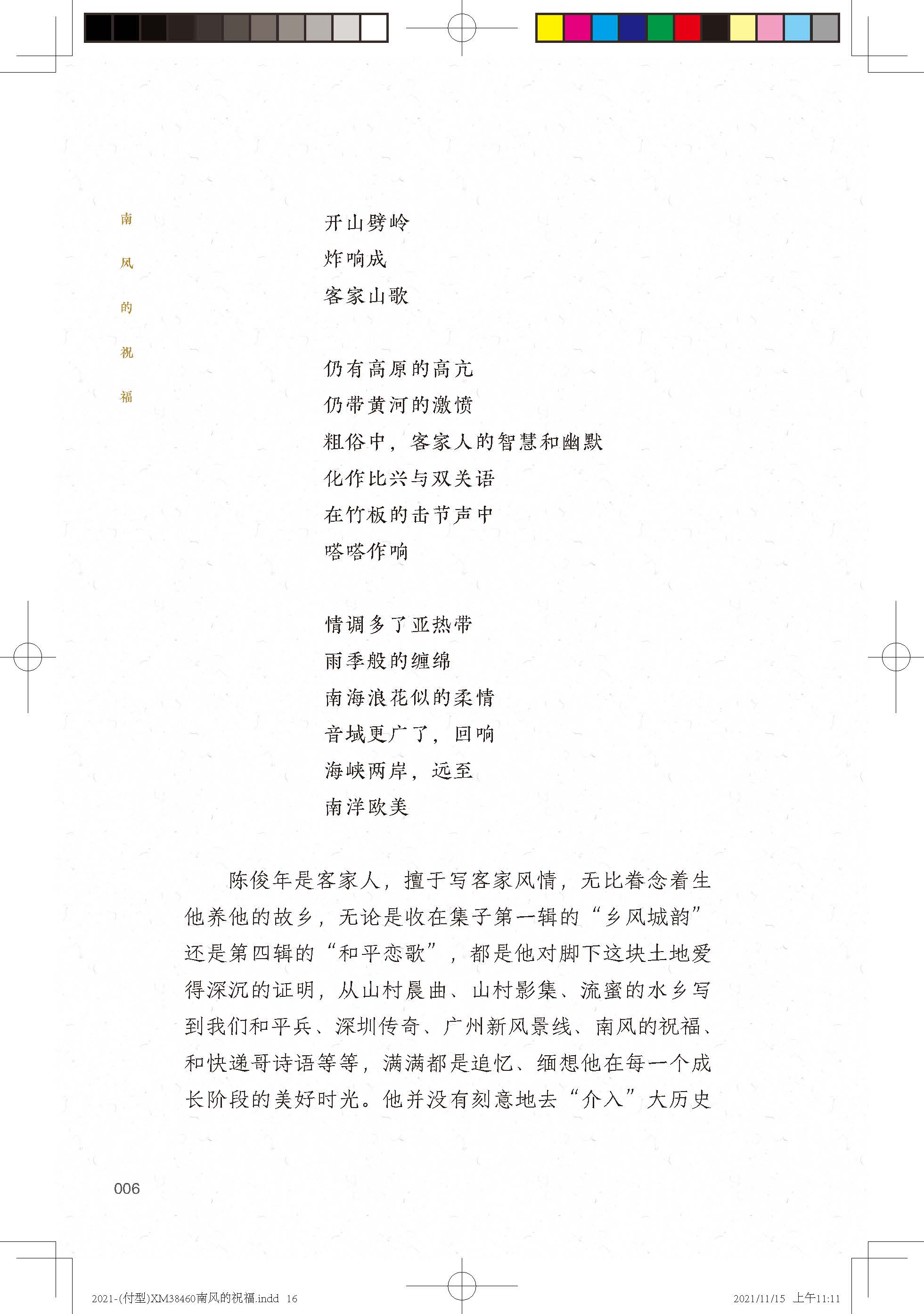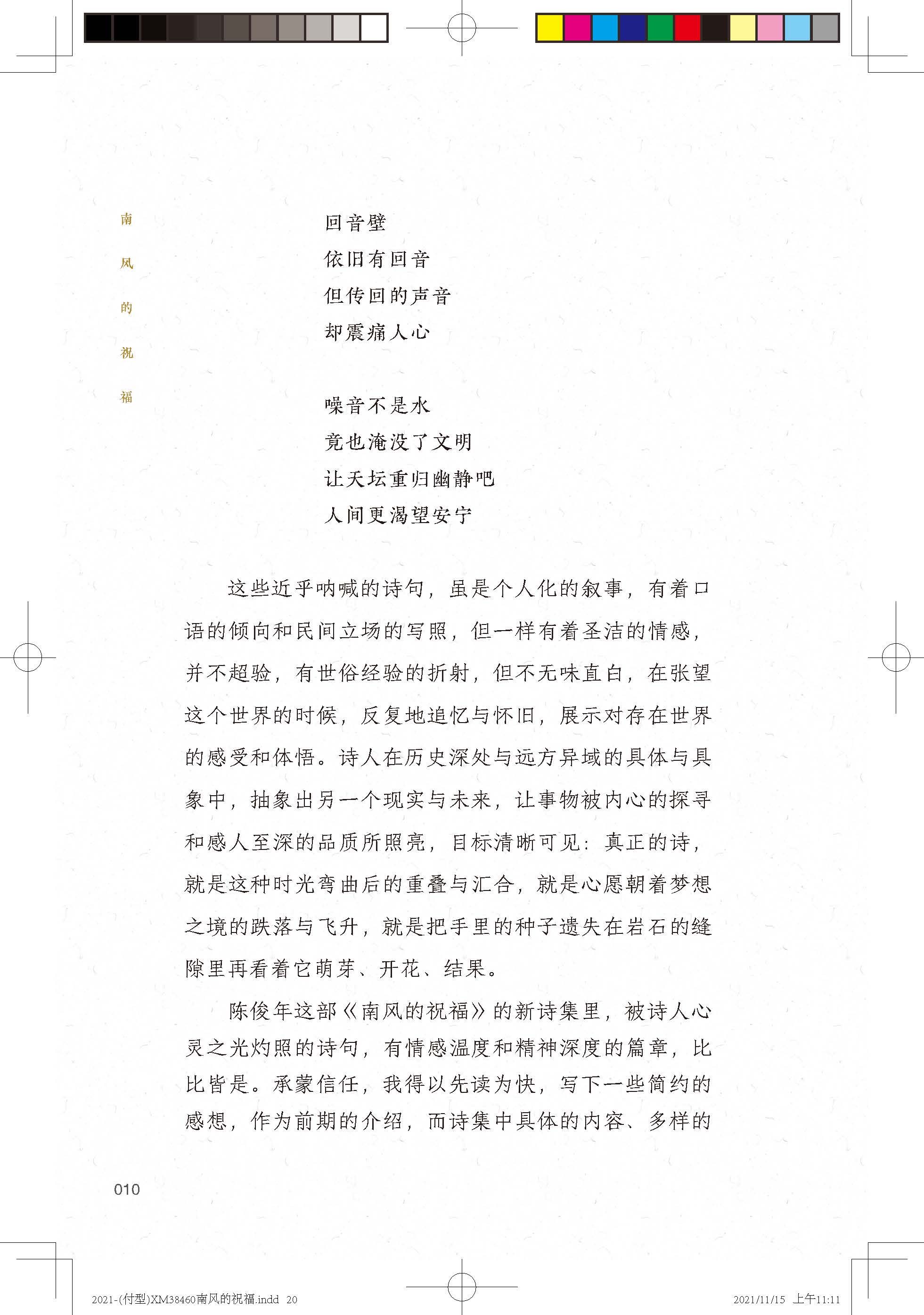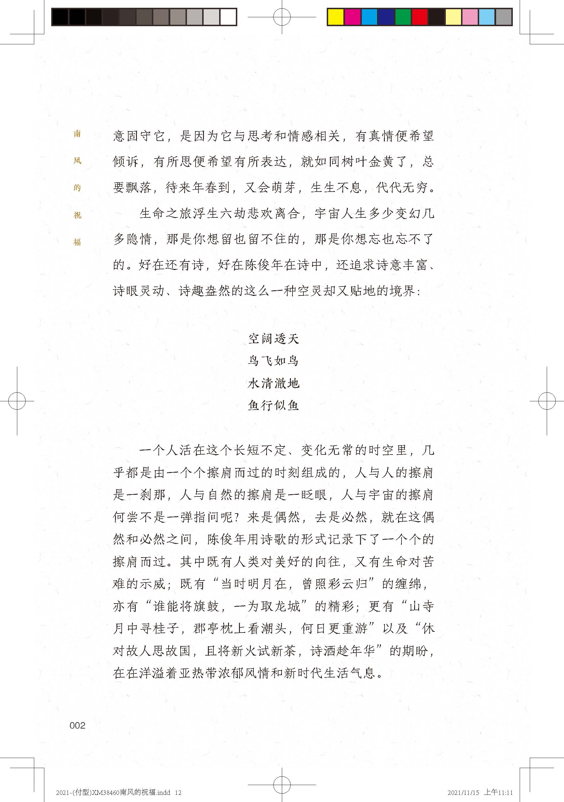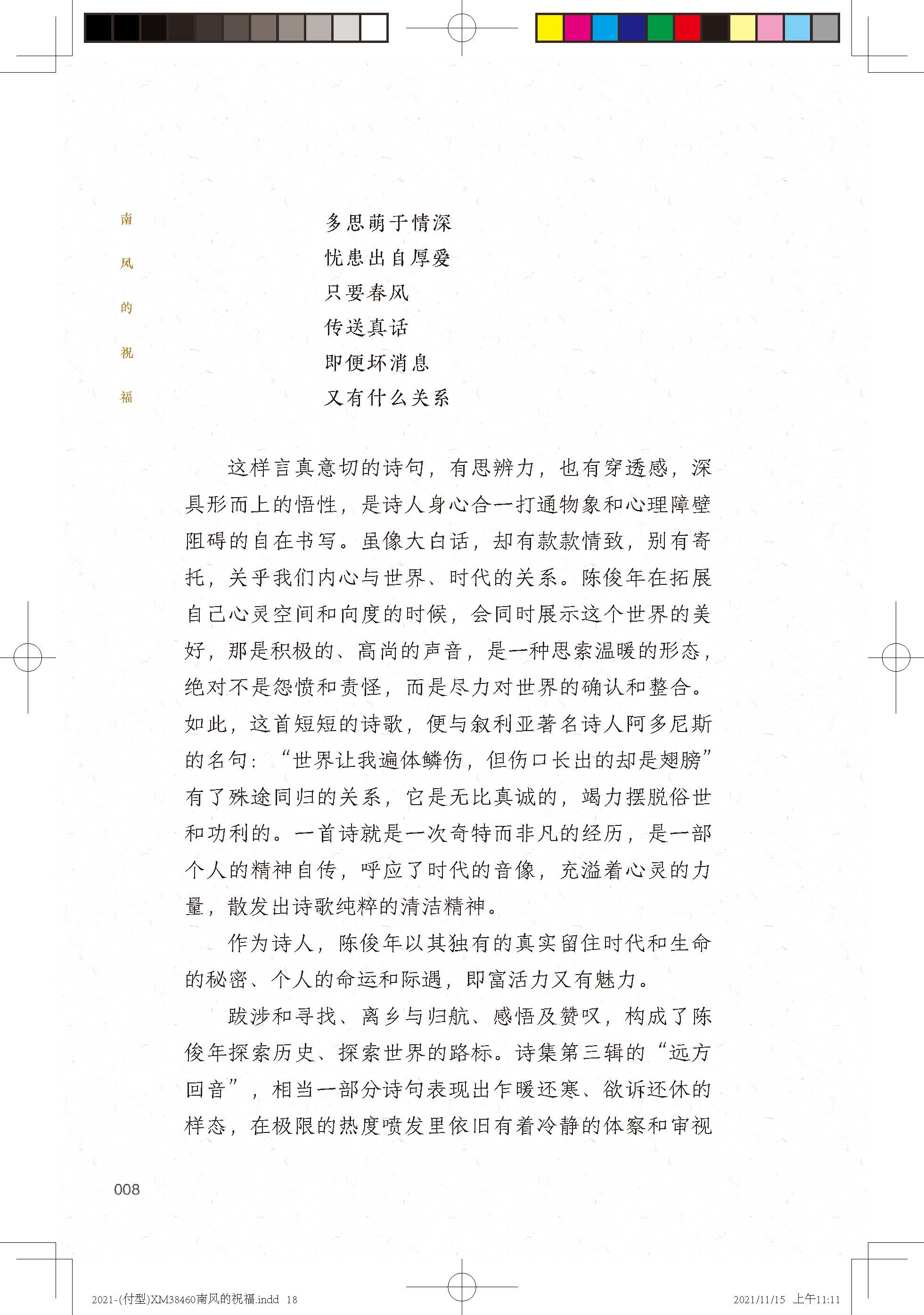作者在《南风的祝福》中,用诗歌书写了作为一个文化人和出版家,对故乡、对旅途、对时代、对人生的经历和感悟,为其丰富的人生阅历赋予了浓浓的诗意,仿佛在用文字展开一幅宏伟又细腻的画卷。在当今这个信息过载、流量汹涌的年代,这一本蕴含着厚重情感的诗集的面世,显得尤为难能可贵。