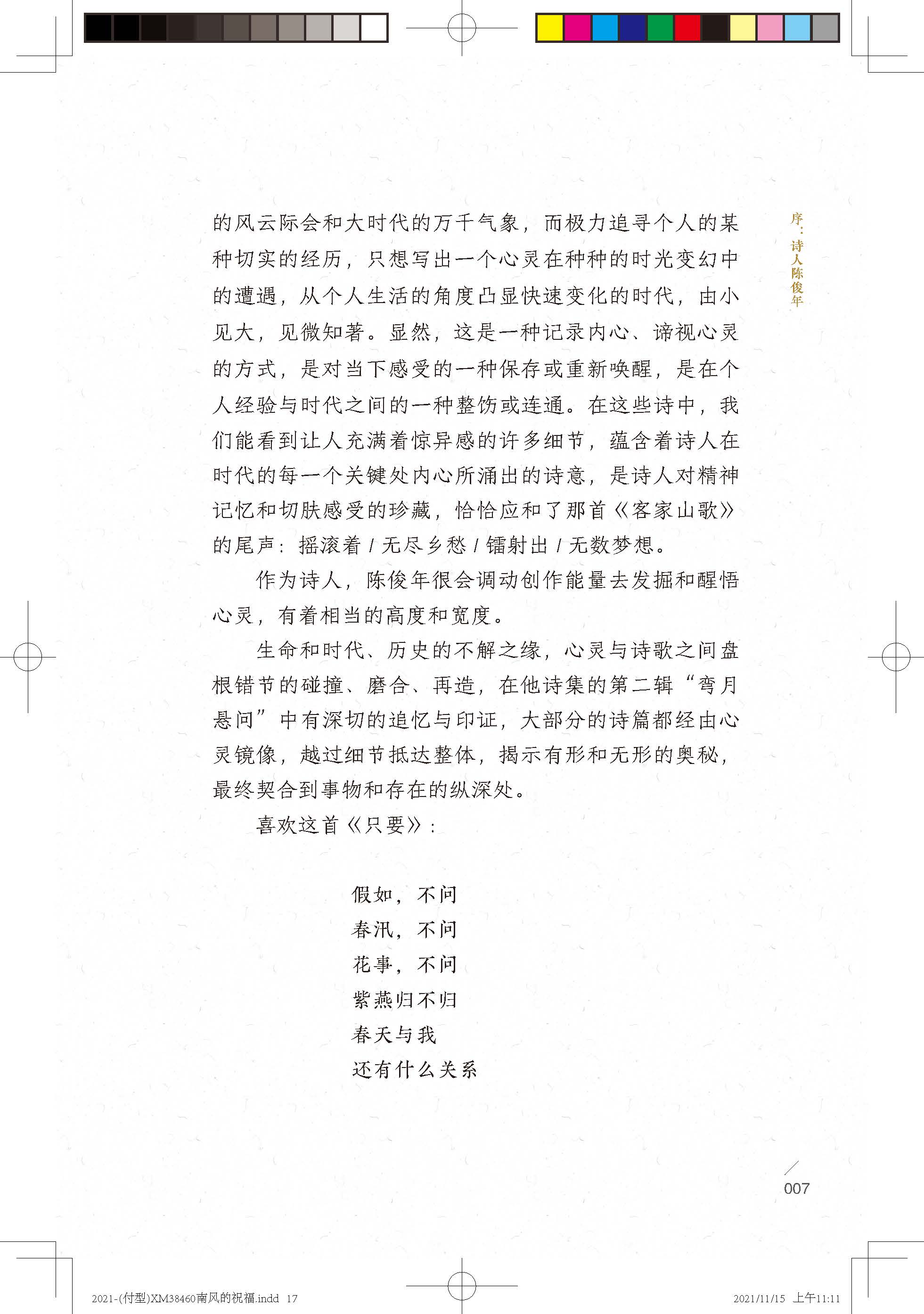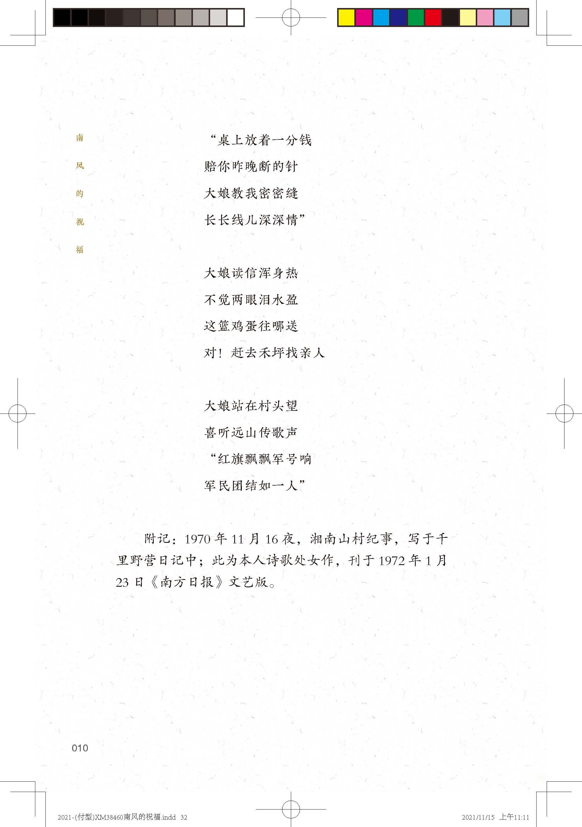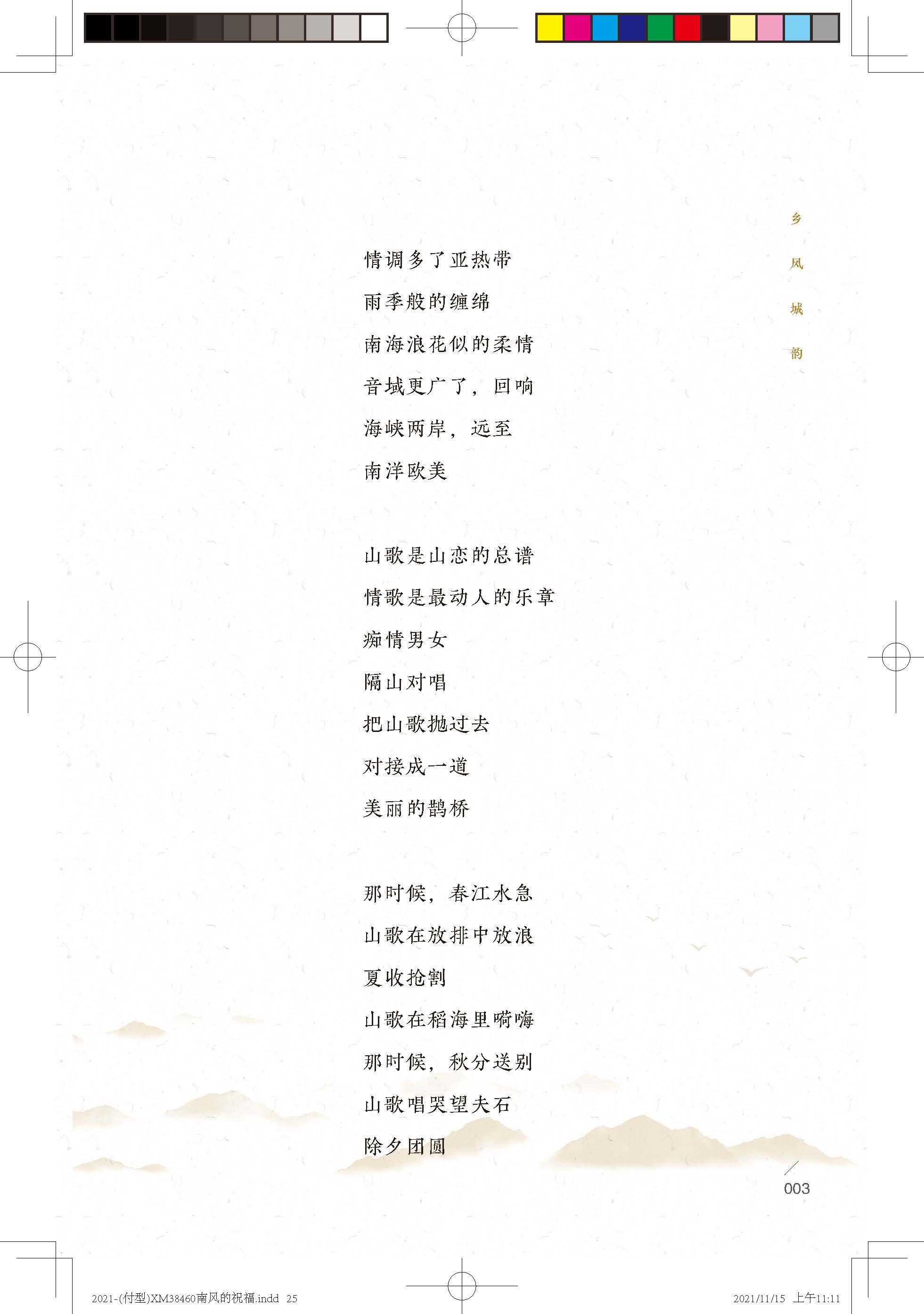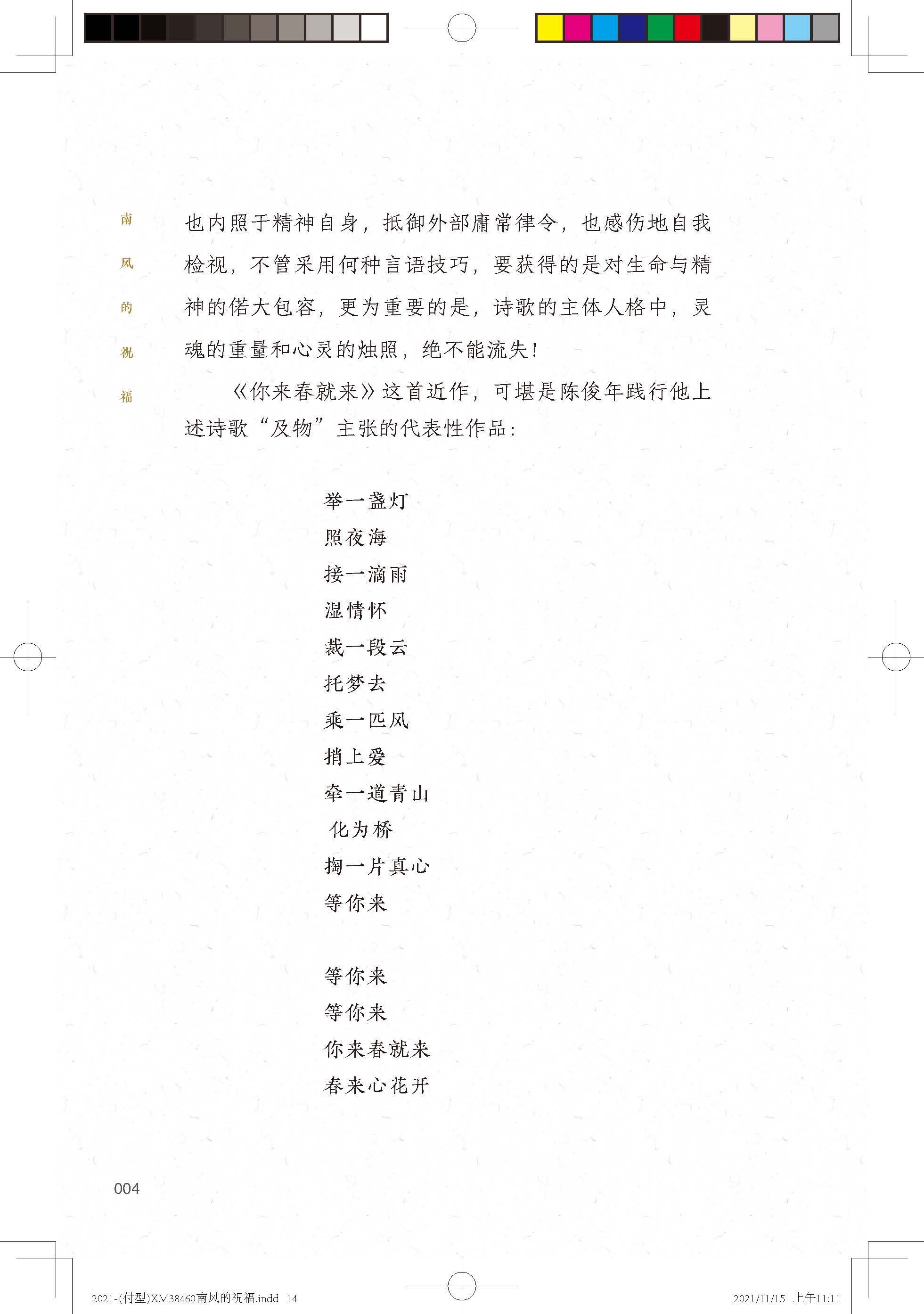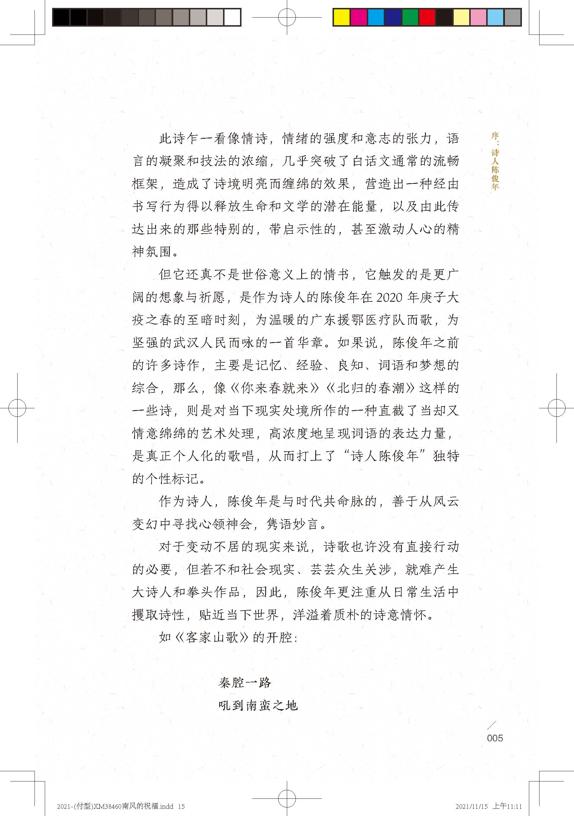 作者在《南风的祝福》中,用诗歌书写了作为一个文化人和出版家,对故乡、对旅途、对时代、对人生的经历和感悟,为其丰富的人生阅历赋予了浓浓的诗意,仿佛在用文字展开一幅宏伟又细腻的画卷。在当今这个信息过载、流量汹涌的年代,这一本蕴含着厚重情感的诗集的面世,显得尤为难能可贵。
