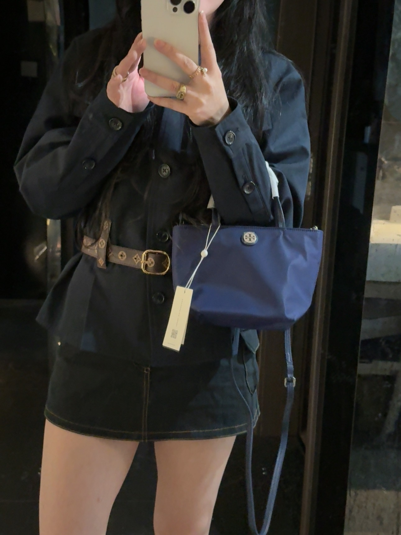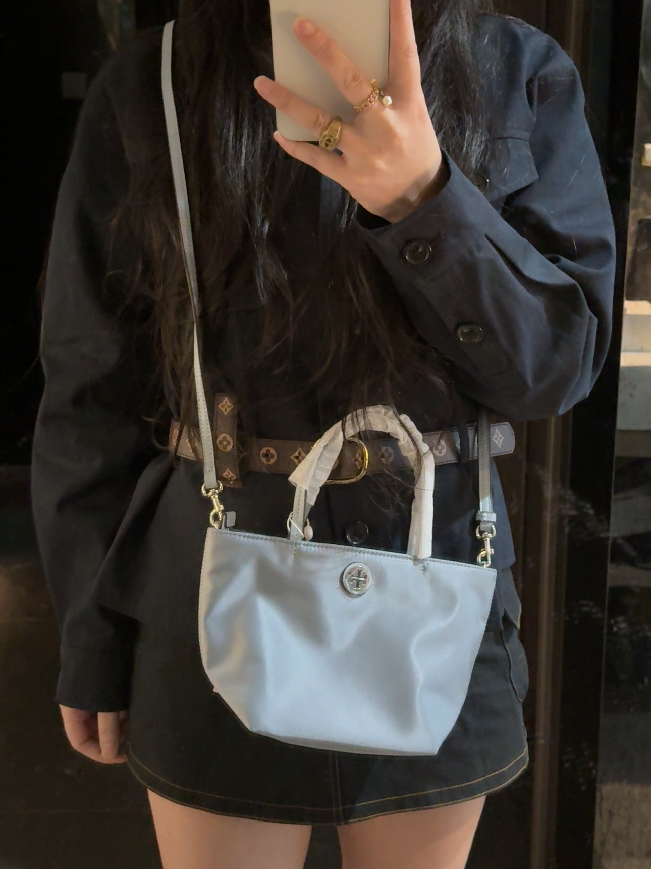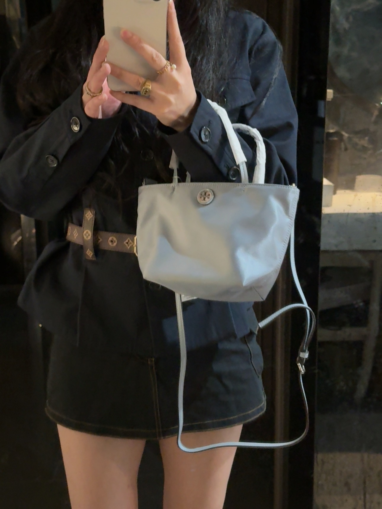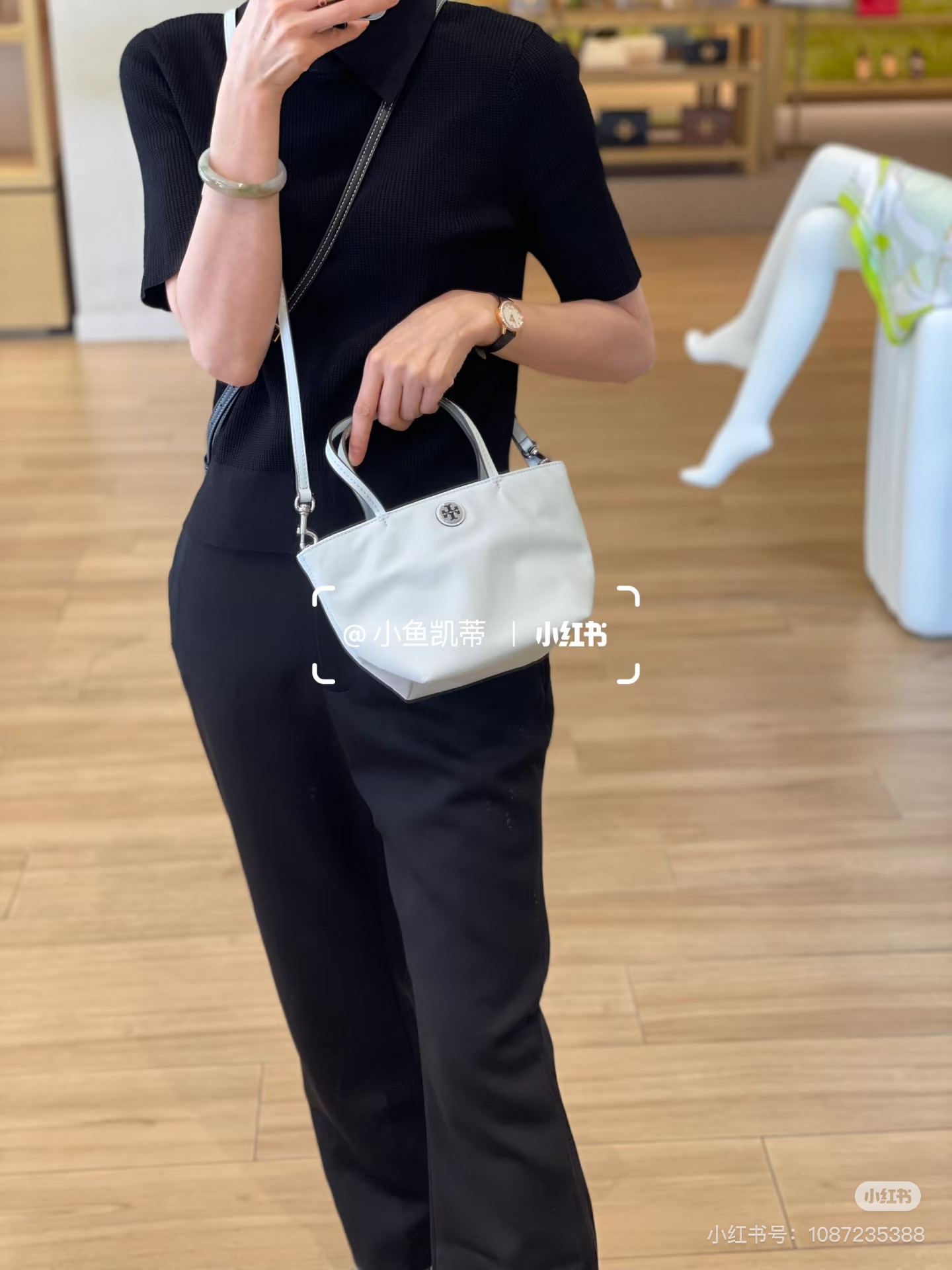 ① 材质:轻量耐造,通勤无负担 包身采用防水耐磨织物,搭配皮革饰边,自重轻到背满物品也不压肩,咖啡渍、灰尘一擦即净,通勤党/宝妈/学生党都能“粗放式使用”。 ② 容量:小身材装下大日常 别看包型秀气,内里空间足够容手机📱 水杯+mini伞+化妆包,内侧还有插袋收纳钥匙、口红,不用再翻包“寻宝”。 ③ 设计:经典双T,细节见质感 标志性双T金属Logo点缀包身,简约不张扬;提手做了柔软包边,手提/肩背都舒适;可拆卸长肩带,切换“手提精致感”或“斜挎松弛感”。4️⃣色都好看!(米白也叫冰川蓝)