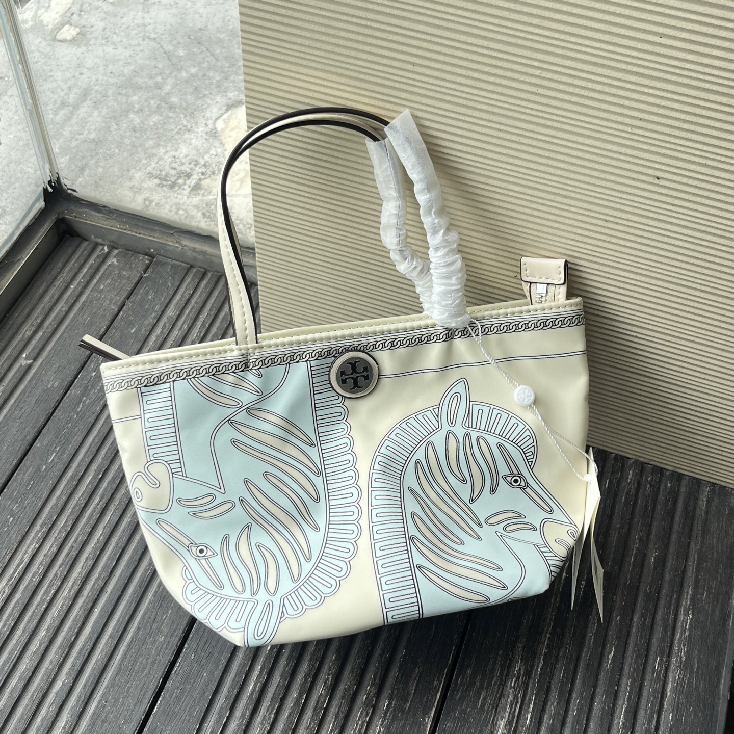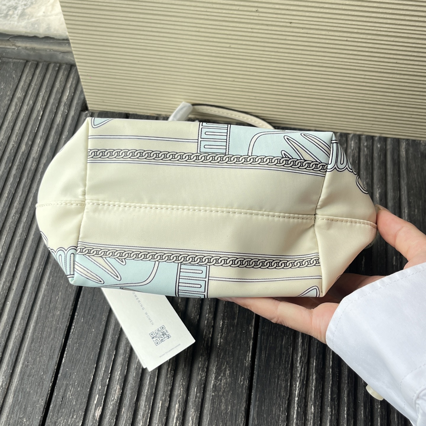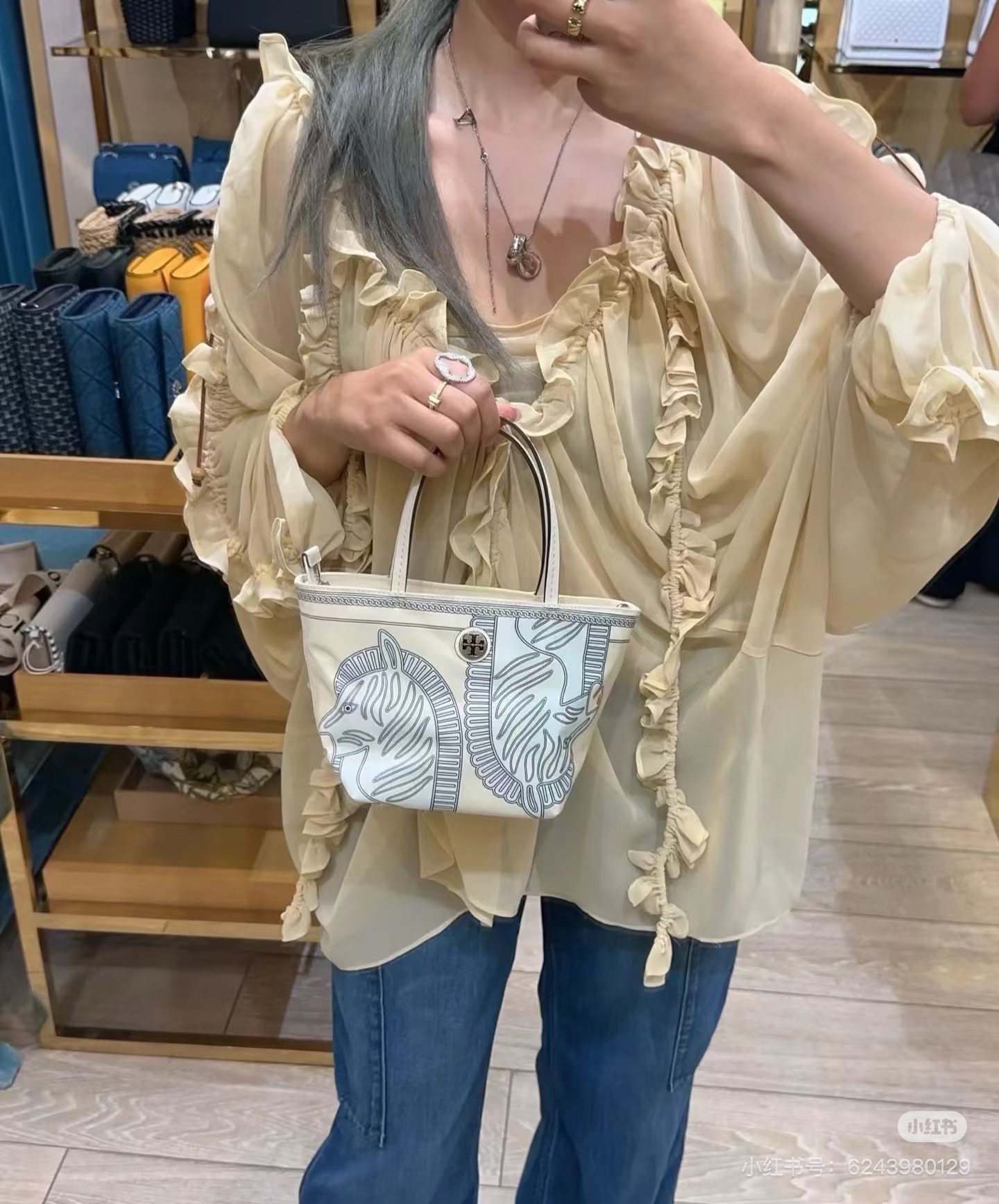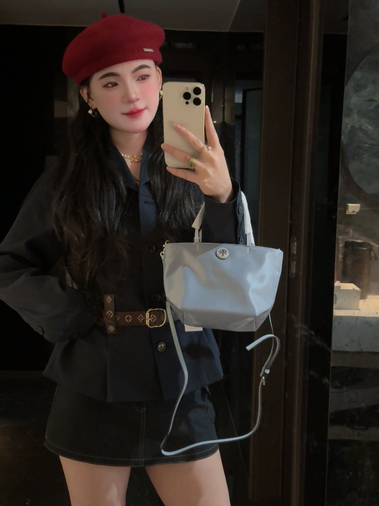 ① 材质:轻量耐造,通勤无负担 包身采用防水耐磨织物,搭配皮革饰边,自重轻到背满物品也不压肩,咖啡渍、灰尘一擦即净,通勤党/宝妈/学生党都能“粗放式使用”。 ② 容量:小身材装下大日常 别看包型秀气,内里空间足够容手机📱 水杯+mini伞+化妆包,内侧还有插袋收纳钥匙、口红,不用再翻包“寻宝”。 ③ 设计:经典双T,细节见质感 标志性双T金属Logo点缀包身,简约不张扬;提手做了柔软包边,手提/肩背都舒适;可拆卸长肩带,切换“手提精致感”或“斜挎松弛感”。4️⃣色都好看!(米白也叫冰川蓝)